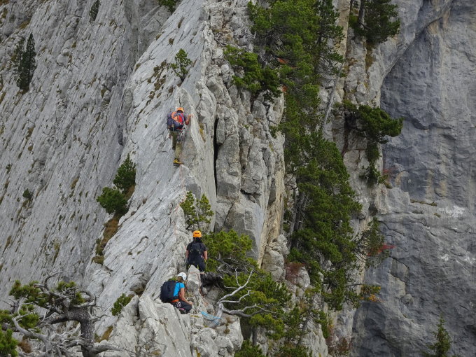 Ergänzung zur Wegfindung: Sofort nach der Durchquerung des Meisibachs Weg nach rechts folgen(Neon-rotes Pfeil). Dem Weg nach um die felsige Ecke wo man ein zweites Pfeil sieht, das nach links den Hang hinauf zeigt. Direkt links hinauf bis zu einem dritten Pfeil der die Richtung nach oben bestätigt. Weiter bis man auf Spuren trifft die zum Weglein werden und über den Grat zum Einstieg. Die Schwierigkeiten im Fels sind nicht so gross und man kommt als Durchschnittskletterer gut durch. Die Sicherungsregeln über einen nicht schwierigen, aber exponierten Grat sollte man beherrschen. Bandschlingen sind nützlich. Neben Schwindelfreiheit sollte man auch das gemeinsame Gehen am gestreckten Seil beherrschen können, so könnte man auf dem langen Grat nicht zuviel Zeit verlieren.