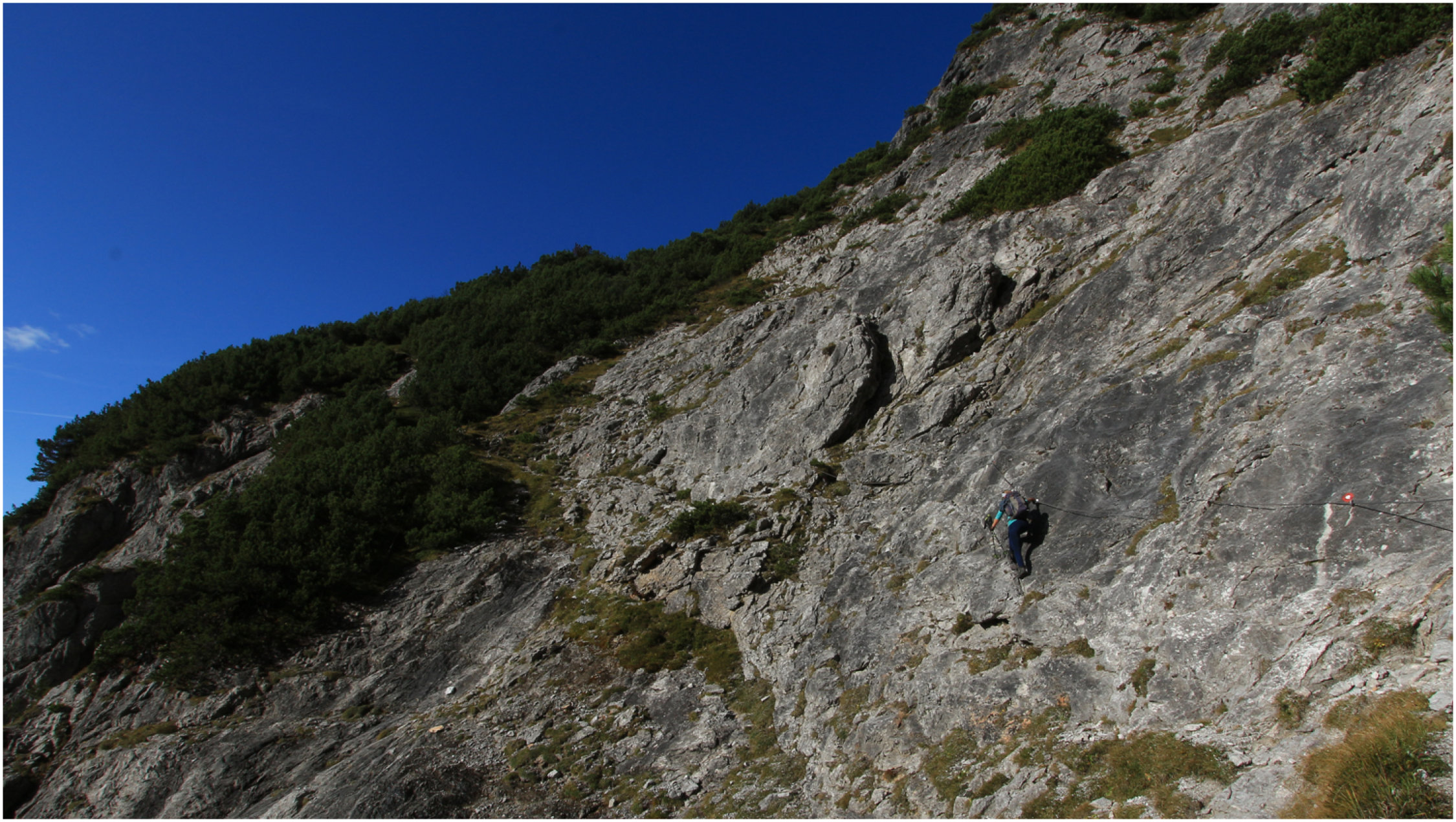 Die Bezeichnung Südwandsteig lässt den Verdacht aufkommen, dass es sich um einen Klettersteig handelt. Dieser erhärtet sich im unteren Bereich durch ein paar Drahtseilpassagen.