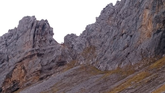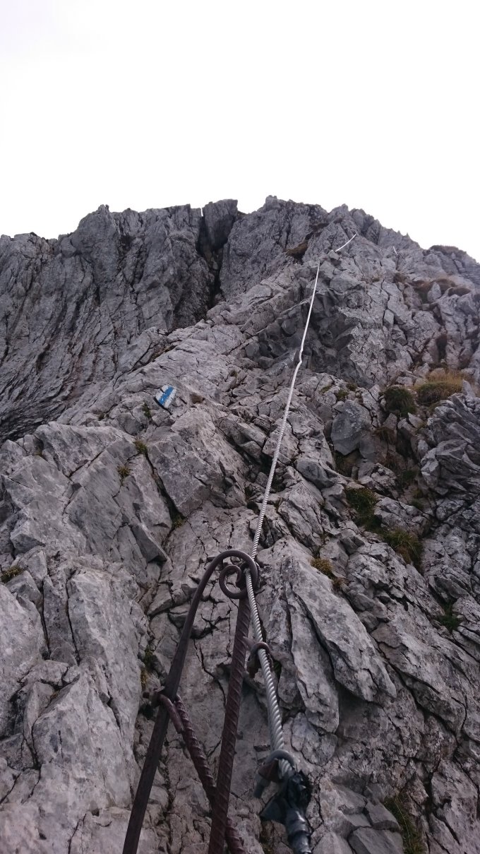 Der Fels war trocken und sehr griffig. Die Route ist gut abgesichert und hat überall gute Tritte und Griffe für die Bergschuhe - aber dennoch sehr ausgesetzt und ein Fehler wird nicht verziehen. Daher T4 korrekt. Nach dem Grat komme eine Kette - hier ist es eher T4+