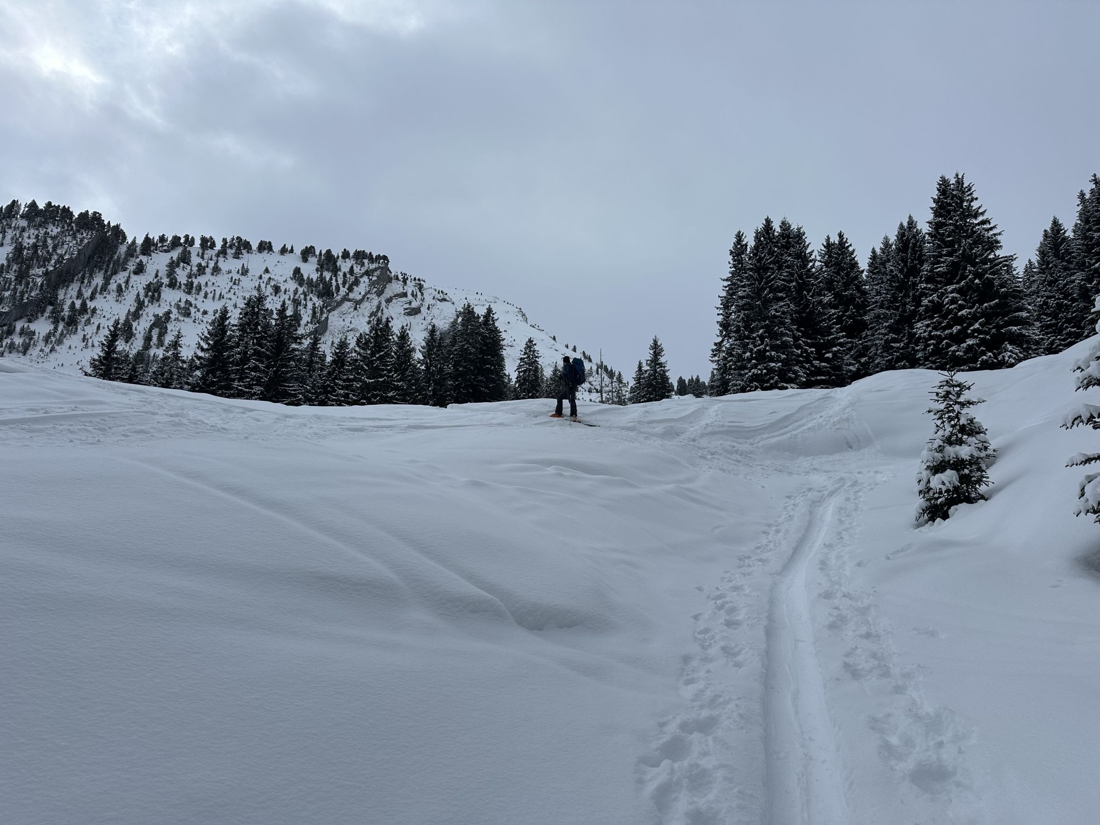 Unten vom Parkplatz weg hat man den Eindruck dass es kein Neuschnee gegeben hat. Aber je höher man kommt desto besser wird's. Gespurt war schon aber Abfahrts-Spuren hatte es nur wenige. Somit stieg die Vorfreude auf ein paar eigene Abafahrts-Spuren...
