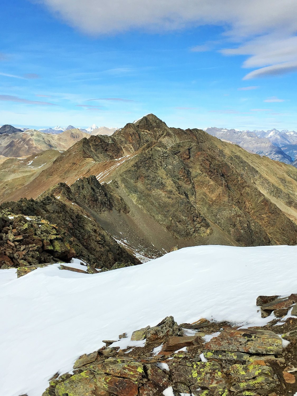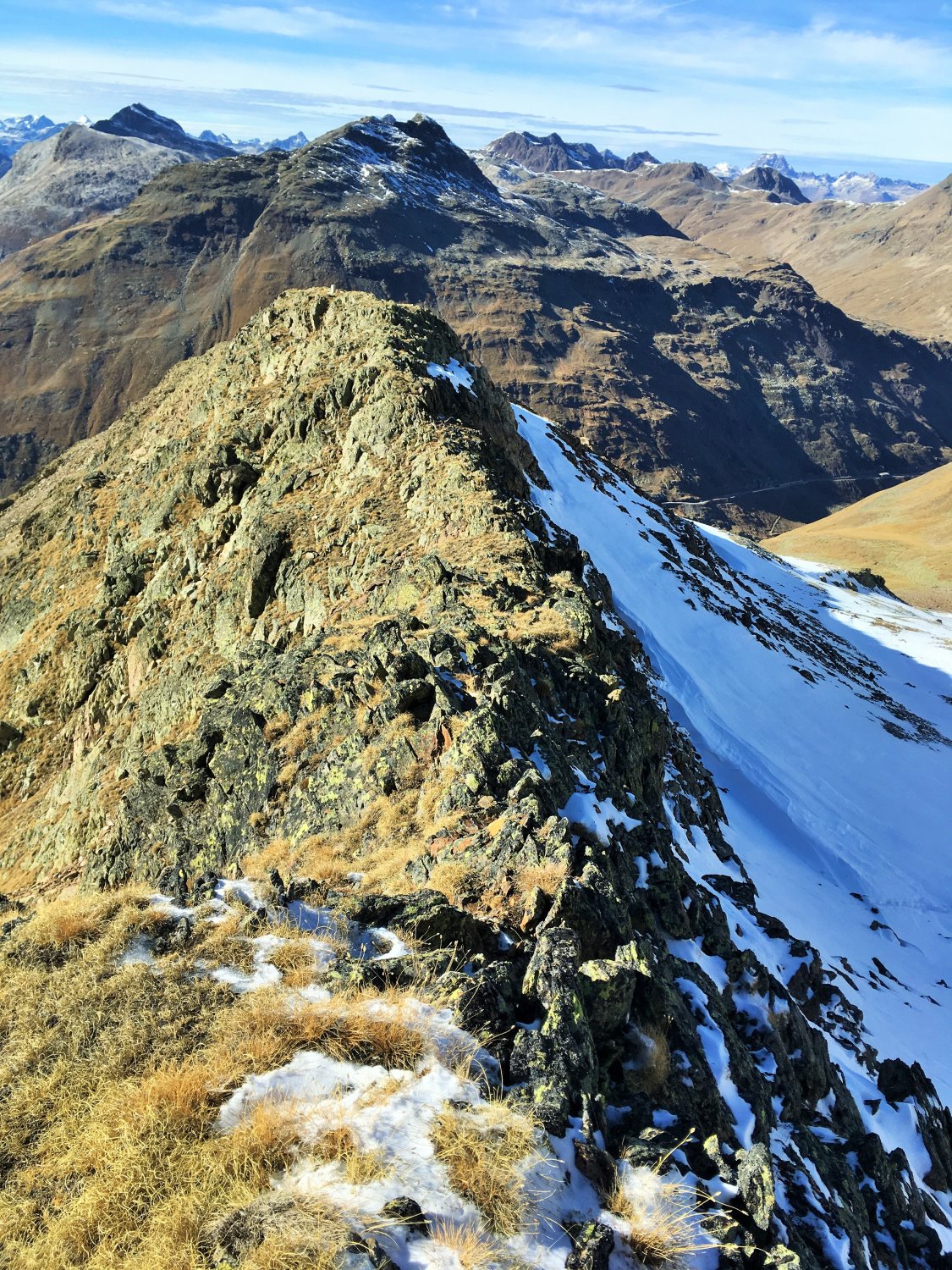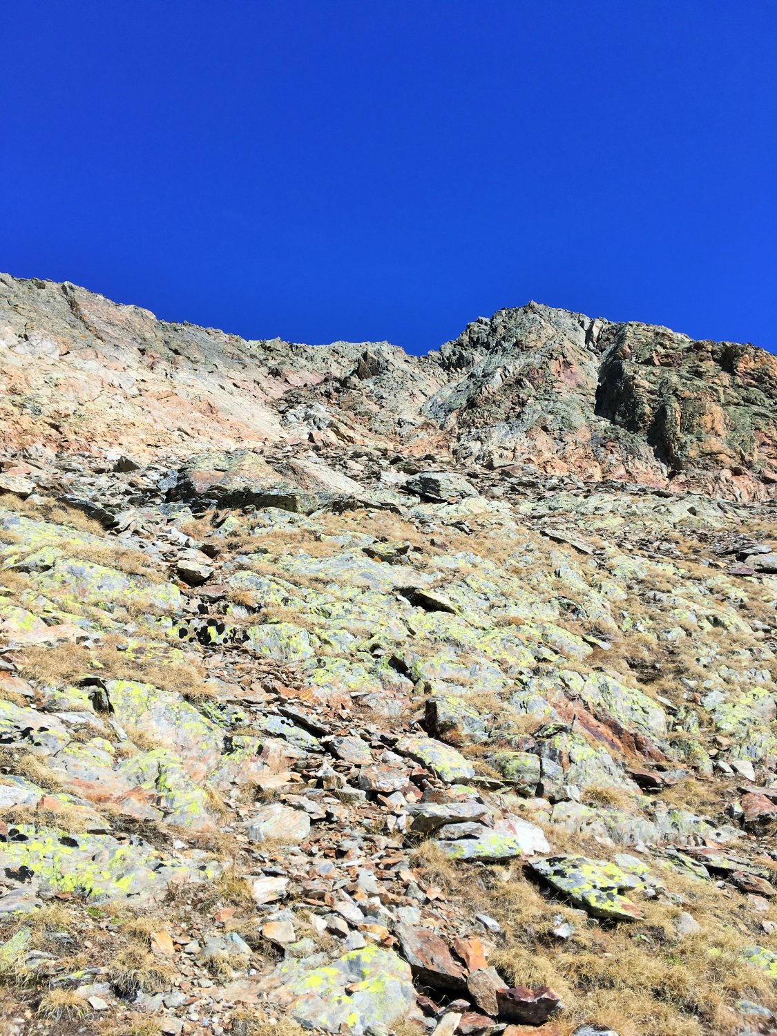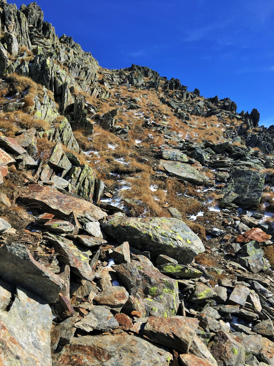 Nur auf dem Gipfelgrat Hartschnee, sonst perfekte Verhältnisse und schöne alpine Herbsttour. Ich bin auf dem rotweiss markiertem Wanderweg von der Forcola di Livigno 2314 m südwärts ins Val dell Orsera und bei 2600 m ostwärts Richtung Grenze gewandert. Jetzt ist die Orientierung etwas schwieriger. Einzelne Markierungen weisen den Weg nordwärts und ab ca. 2750 m wieder westwärts Richtung Nordwestgrat. Nach dem Nordwestgrat in die Westflanke des Gipfels Richtung Norden und auf dem Grat wieder Richtung Süden auf den namenlosen Gipfel. Schwierigkeit T4.