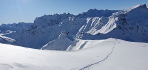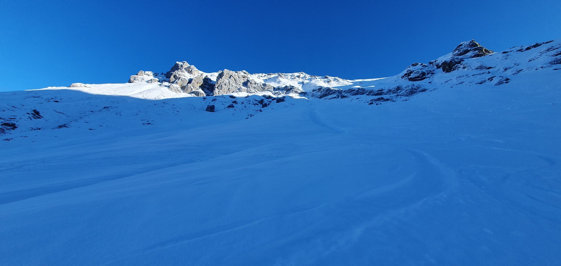 In der Morgendämmerung losgelaufen auf guter Spur mit wenig pulvrigem Neuschnee. Je steiler um so mehr Neuschnee. Top Bedingungen vom Wetter, angenehme Temperaturen, blauer Himmel und Sonnenschein. Im oberen Drittel super Pulver für wunderbare Schwünge. Ab der Mitte ist viel Achtsamkeit den herausragenden Steinen zu geben. Eine beliebte Route auch von der Österreicher Seite her.