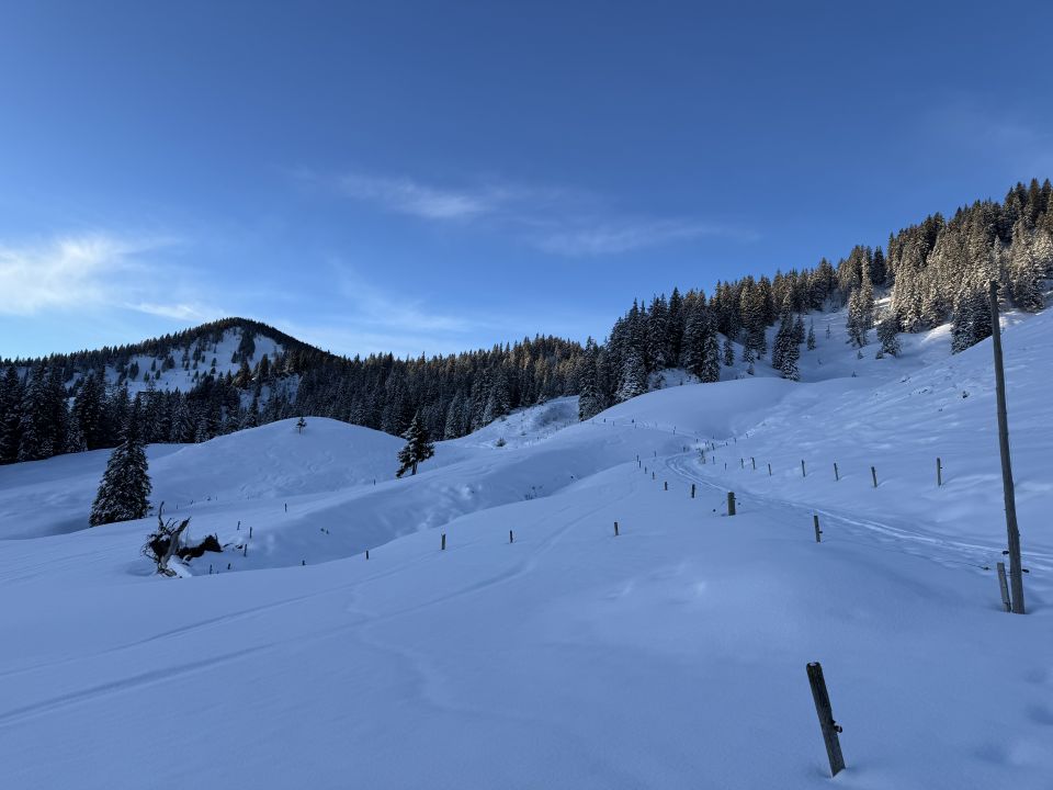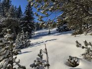 Durchgehend recht viel Schnee - im Wald rund 25 cm Neuschnee, oben dann teilweise schon etwas windbearbeiteter Schnee.