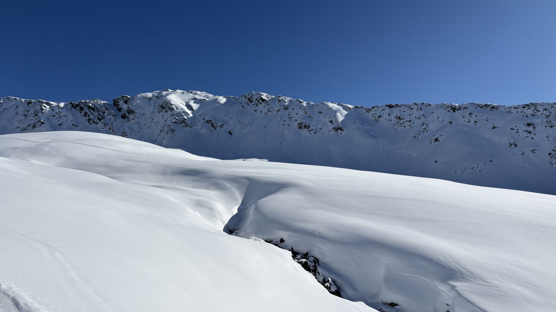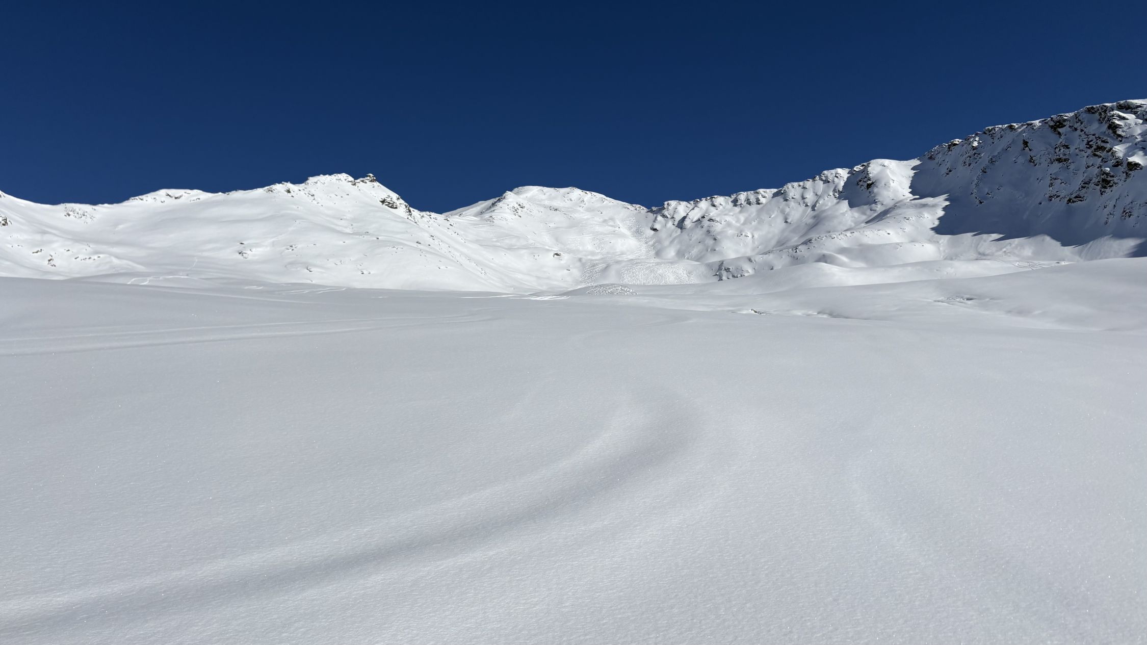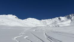Ab Höhe 2100 spürte man dann deutlich eine gute, tragende erste Schicht. Auch die Neuschneeschicht war hier oben die doppelte, ca. 30 cm, bis zum Gipfel. Wenig Windbeartbeitung, es wurde also nirgends einen Deckel angetroffen. Es waren auch während der gesamten Tour keine Wum-Geräusche zu hören. Das Pischahorn bietet dank der entlastenden Sonneneinstrahlung relativ rasch sichere Verhältnisse, zudem ist es recht windgeschützt.