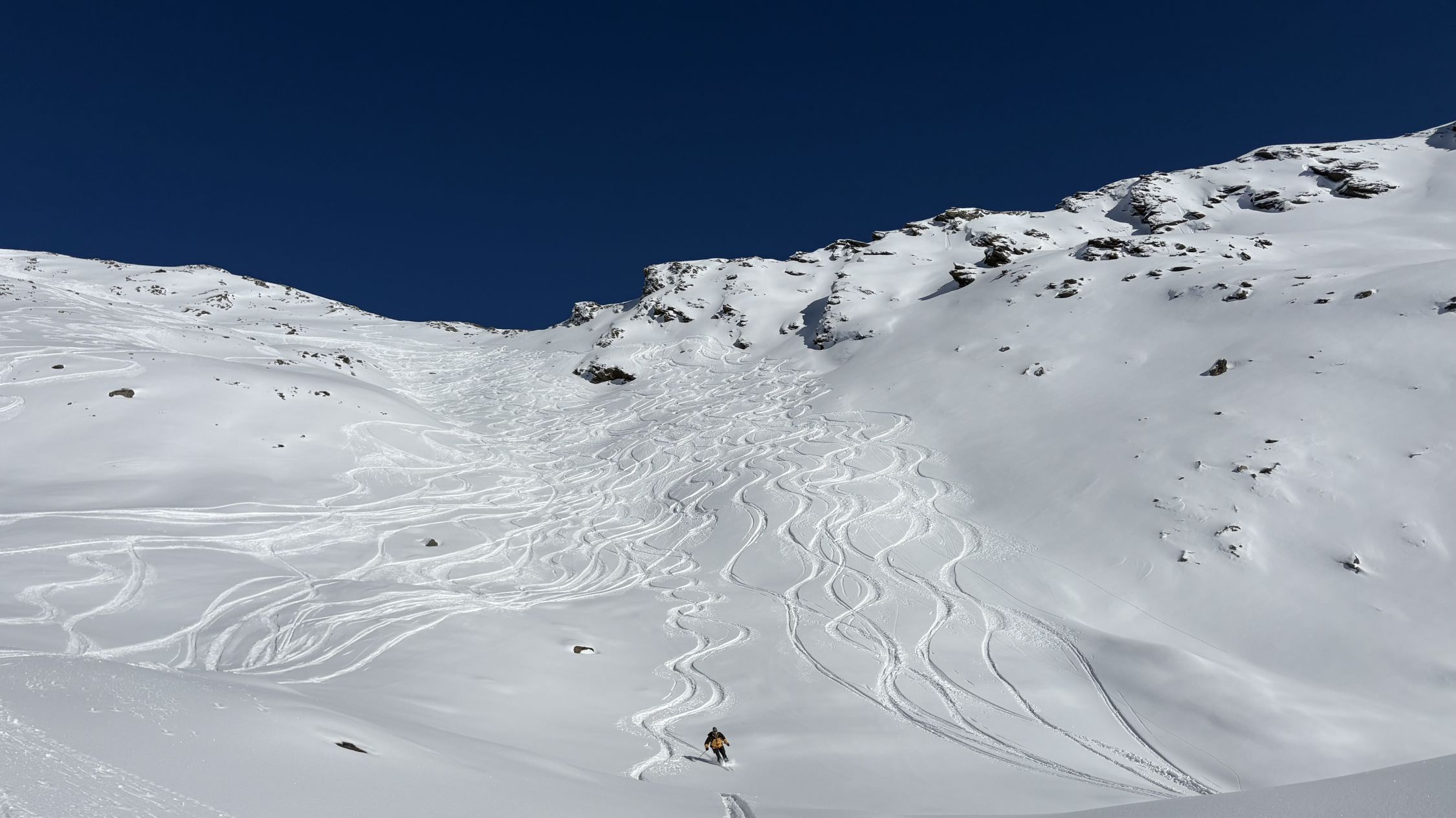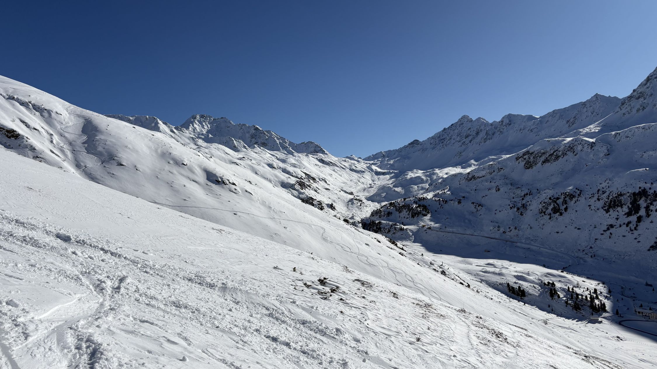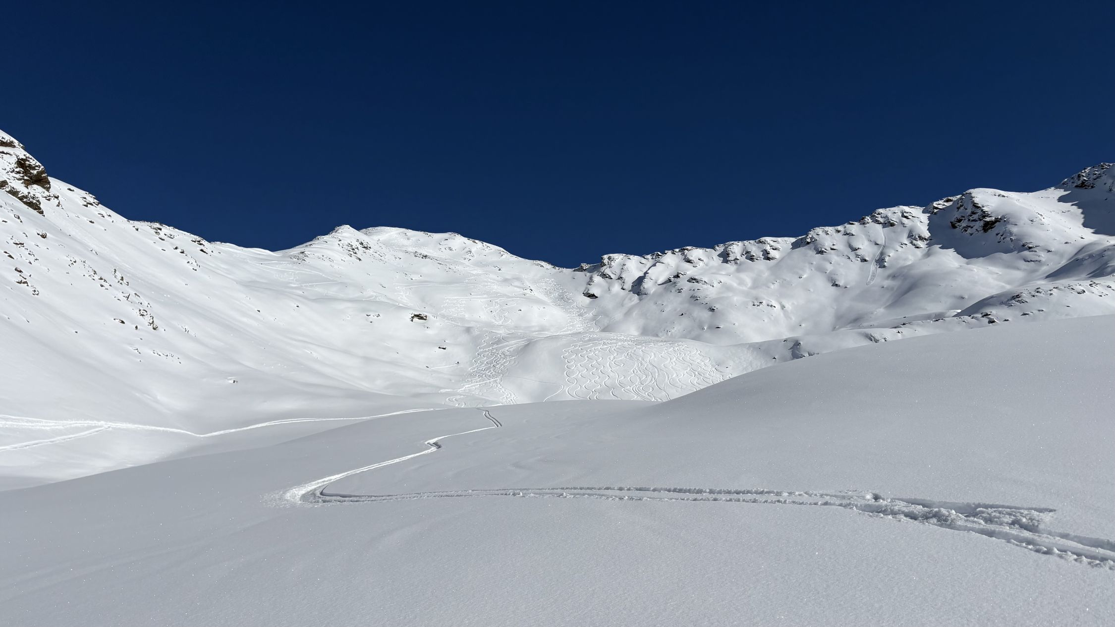 90% der Skitourengänger kamen vom Skigebiet her, fuhren aber alle nicht dort retour, sondern in unser Matjischtälli. Zum Glück haben die heutigen Freerider die Gewohnheit, alten Spuren nachzufahren, so dass für uns in der Abfahrt immer noch viel Platz war.
