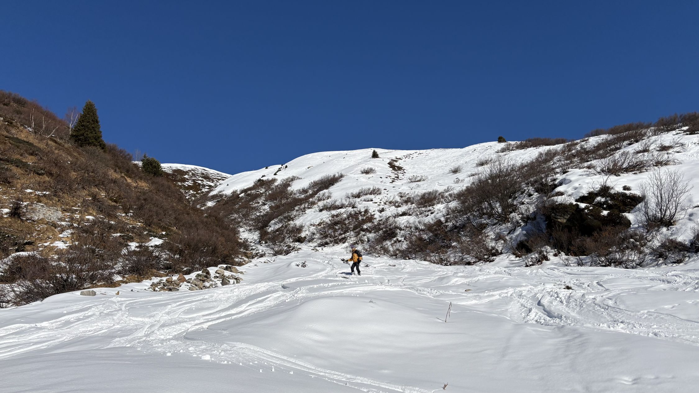 Vom Büdemji aus über den ausgeprägten Rücken mit vielen Abfahrtsspuren war der Aufstieg kräfteraubend, weil erstens der Untergrund griesig war oder aber die Neuschneeschicht nicht mit der unteren Schicht verbunden war und man absackte.