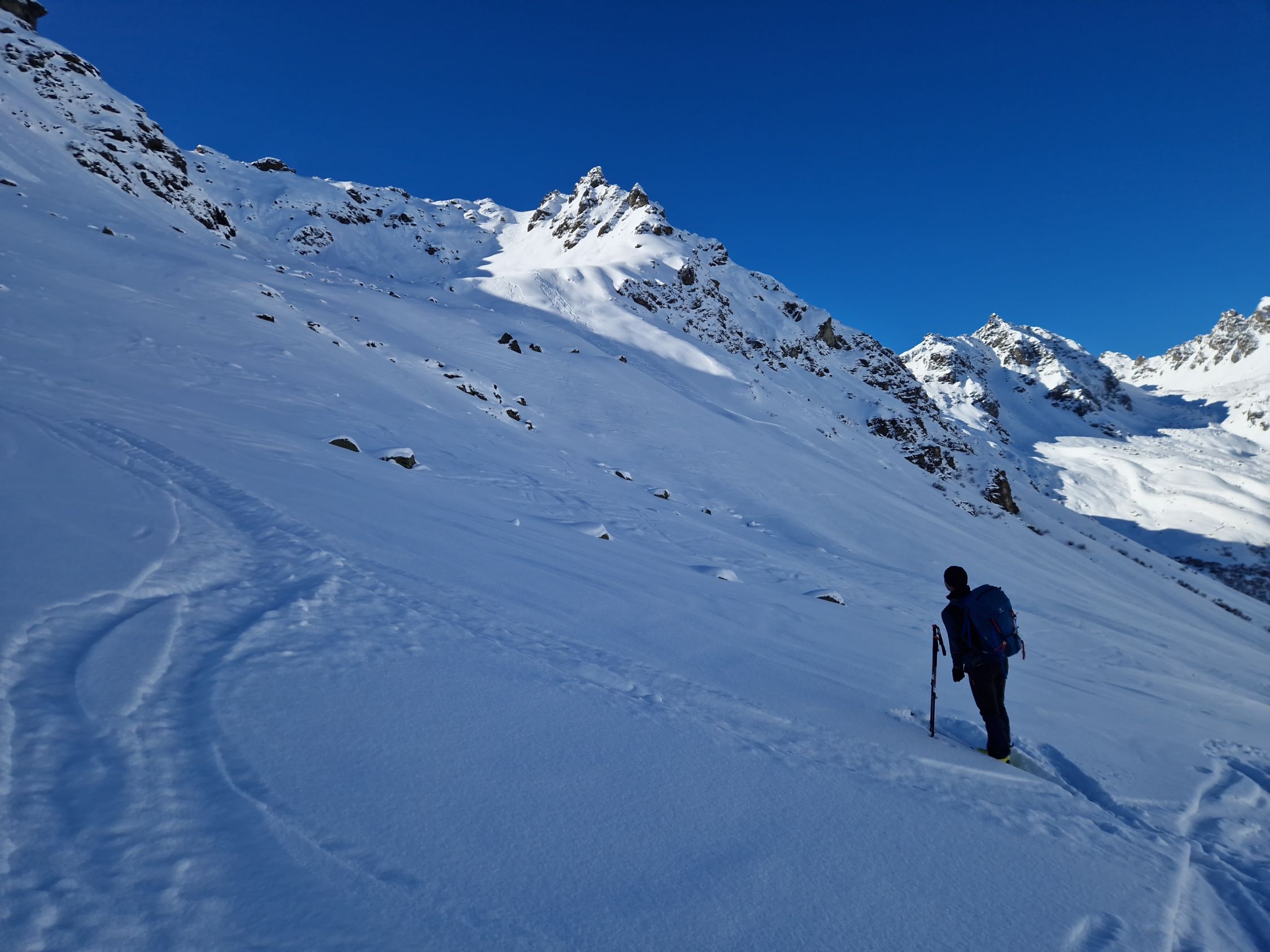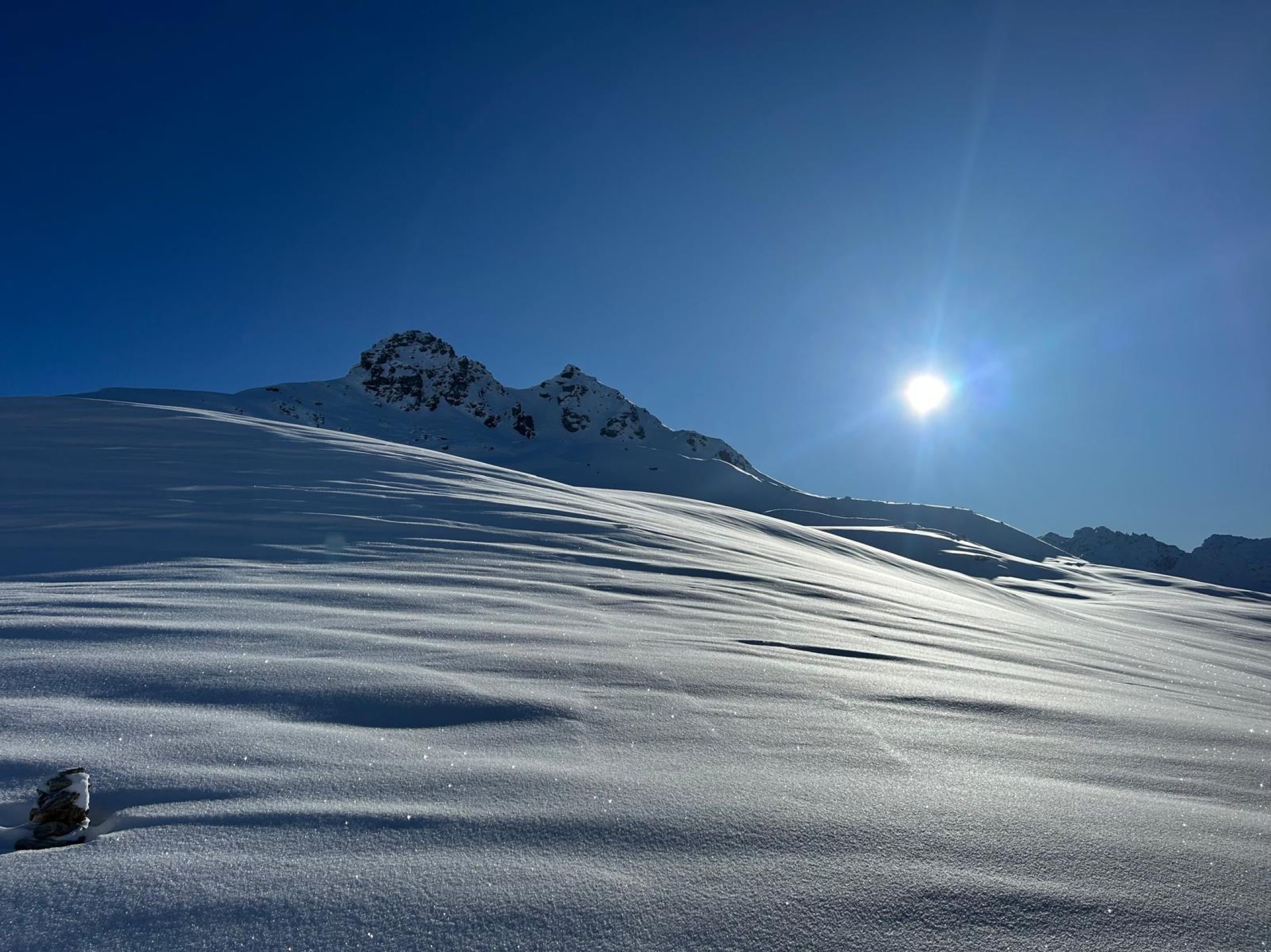 Endlich! Endlich Pulverschnee, der diesen Namen auch wirklich verdient. Sonne pur, trockene Luft, kein Wind, auch beim letzten Schneefall nicht. Unten 10 cm, oben 30 cm bis zu 40 cm fluffiger Neuschnee machten zwar das Spuren zur Schlappiner Spitze aufgrund der noch fehlenden Bindung etwas fordernder und führte in der Abfahrt bei steileren Übergängen auch zu Sluff. Aber sonst konnte jeder seine Schwünge einfach nur genießen. Endlich auch mal keine Setzungsgeräusche und keine Lawinenbeobachtungen. Wir fuhren nach Osten ab und gingen im Anschluss auf guter Spur noch auf die Paschianiköpfe. Ebenfalls ein Traum. Auf unseren beiden Gipfelzielen war trotz dieser Bedingungen nicht viel los, nur die übliche Karawane Richtung Rotbühel, die wir gerne ziehen ließen.