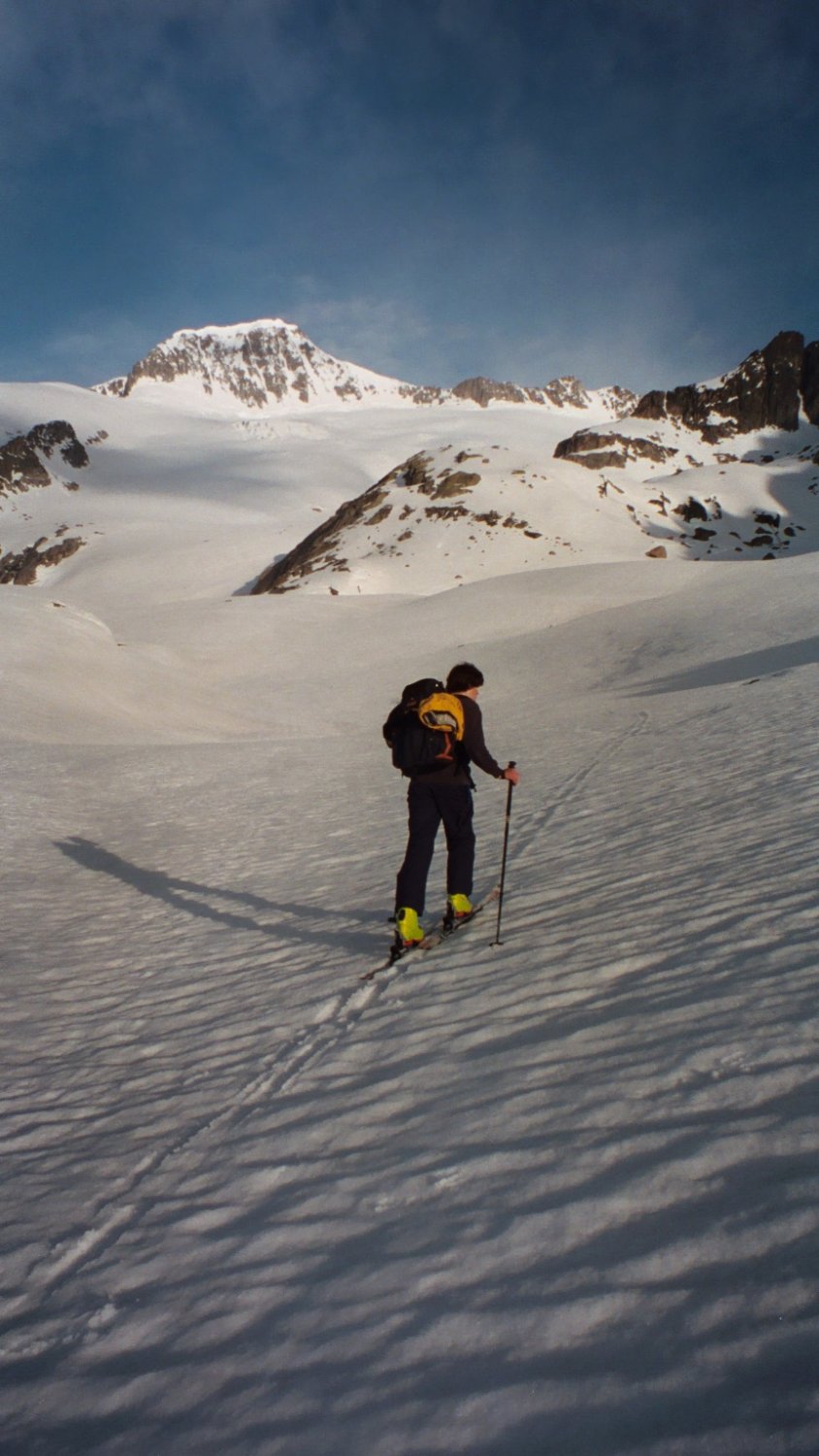 Start der Tour um 06.15 Uhr in Tiefenbach. Wir mussten die Skis ca.10 Min. bis zu einem ersten Schneefeld tragen, dann geschlossene Schneedecke. Eine grössere Gruppe von der Albert Heim Hütte aus gestartet läuft vor uns. Auf dem Tiefengletscher finden wir eine Eisaxt und nehmen sie mit uns. Auf der Höhe Obere Bielenlücke wird die Sicht immer schlechter Nebelschwaden ziehen umher. Der Bergschrund beim Skidepot unter dem Galengrat klaffte weit offen, der Galenstock war eingenebelt Grund genug um die Tour hier abzubrechen. Auch die Gruppe von der Albert Heim Hütte riskierten den Aufstieg nicht. Die gefundene Eisaxt gehörte einem Italiener der hatte den Verlust gar nicht bemerkt. Auf ein Nebelfenster gewartet, dann dicht an der Aufstiegsspur abgefahren. Einige Spalten waren geöffnet bei Nebel nicht zu unterschätzen. Weiter unten lichtete sich der Nebel und nichts stand einer schönen Pulverschnee Abfahrt im Wege. Im Hotel Tiefenbach noch für einen Kaffee eingekehrt.