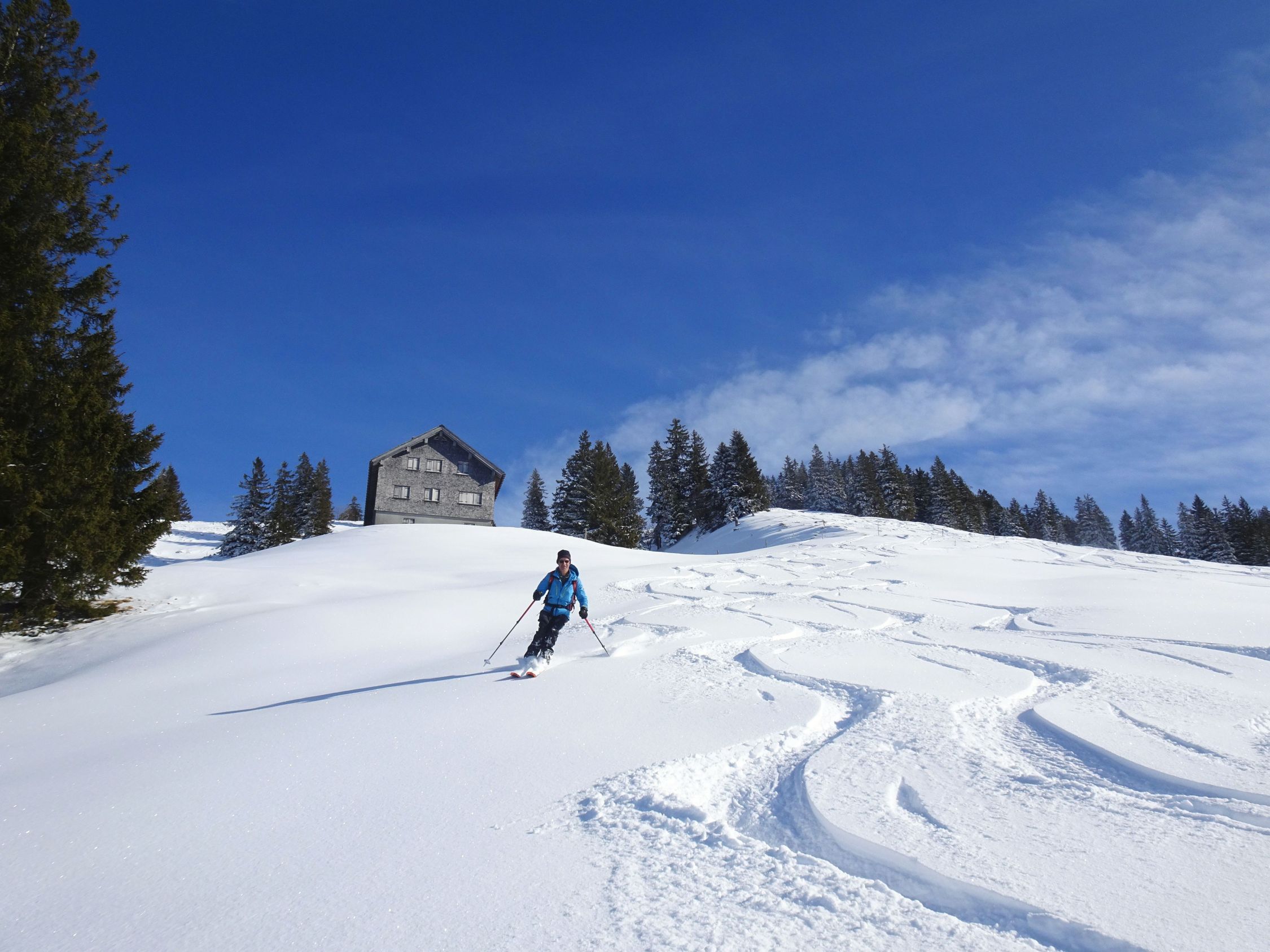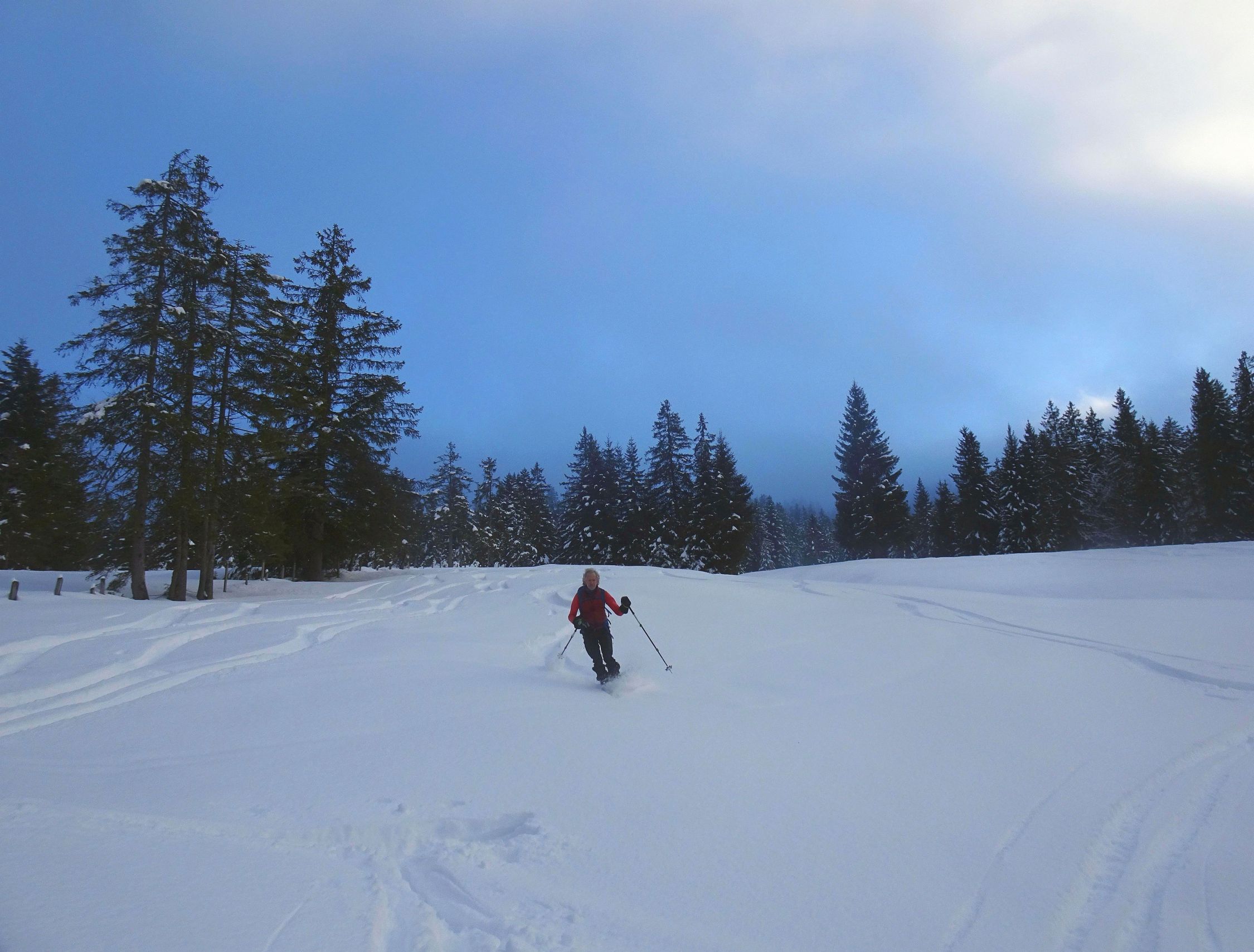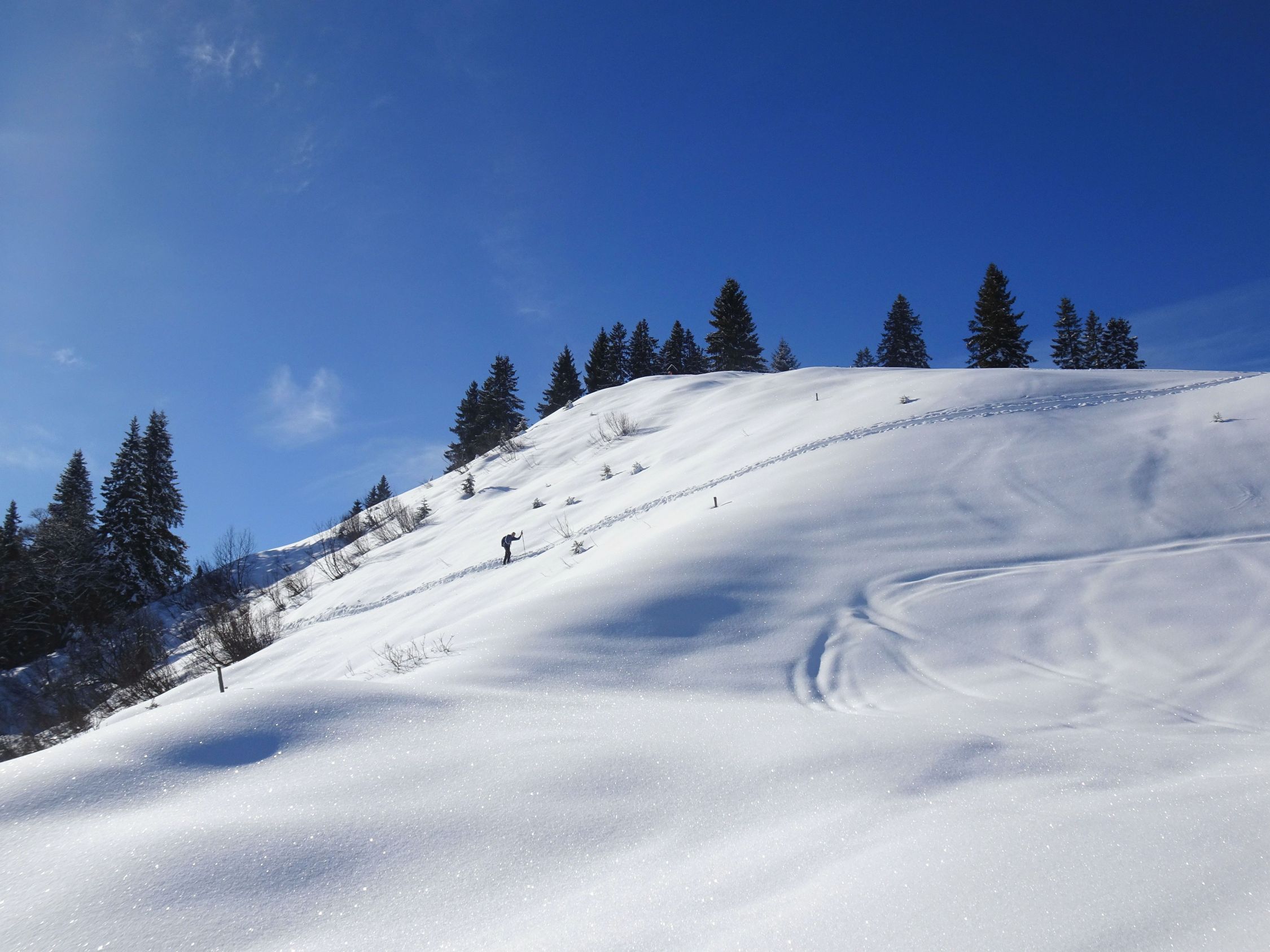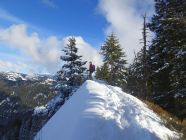 Ausreichend Schnee, auch Waldbereich gut passierbar. 20-30 cm Pulver und vor allem am Nordhang des Burstkopf noch viel Platz für eigene Spuren. Auch am Feuerstätterkopf und bei der Talabfahrt noch schöne Passagen. Grataufstieg heute zu Fuß.