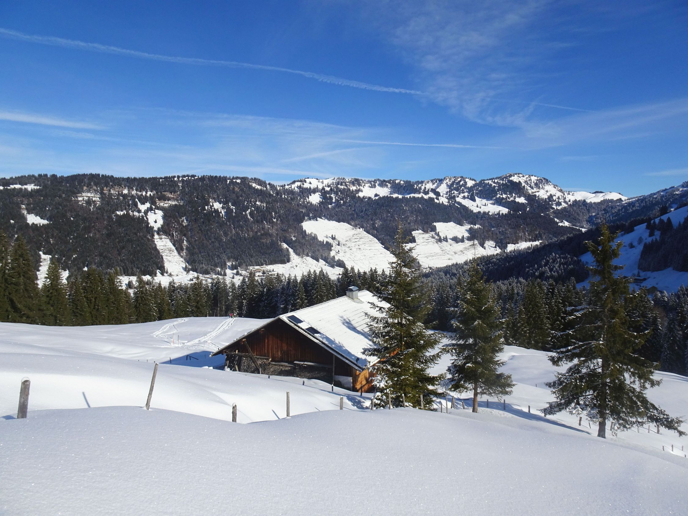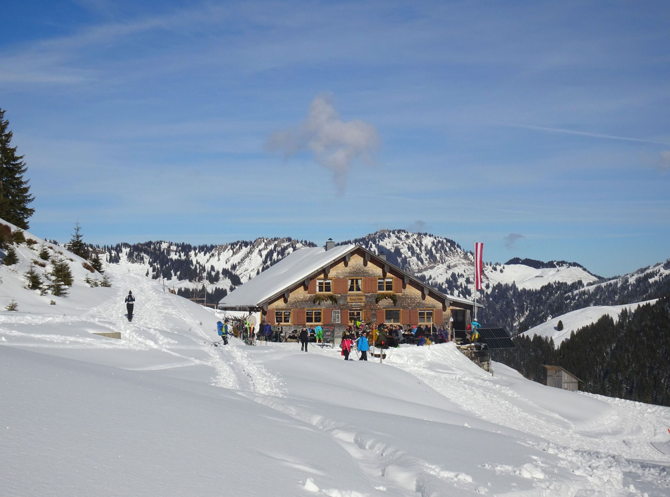 Perfektes Winterwetter, sonnig, windstill und gute Fernsicht. Erst am späteren Nachmittag kroch der Hochnebel Richtung Balderschwang und in die Hochtäler. Einige Leute im Gebiet unterwegs, Burglhütte geöffnet.