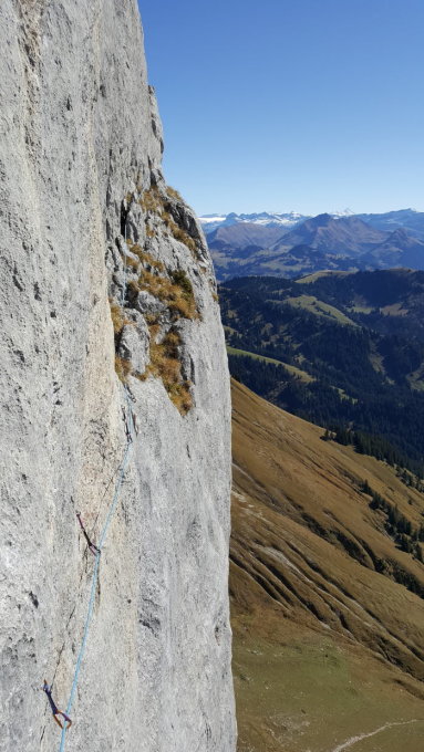 Sehr schöne Klettertour in bestem Fels, der trotz den 72 Jahren seit ihrer Eröffnung kaum abgespeckt ist. Der endlich angekommene goldene Oktober tut ein Übriges...