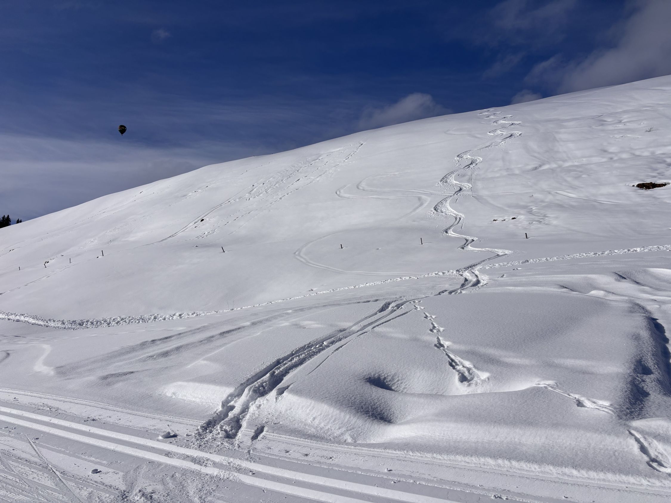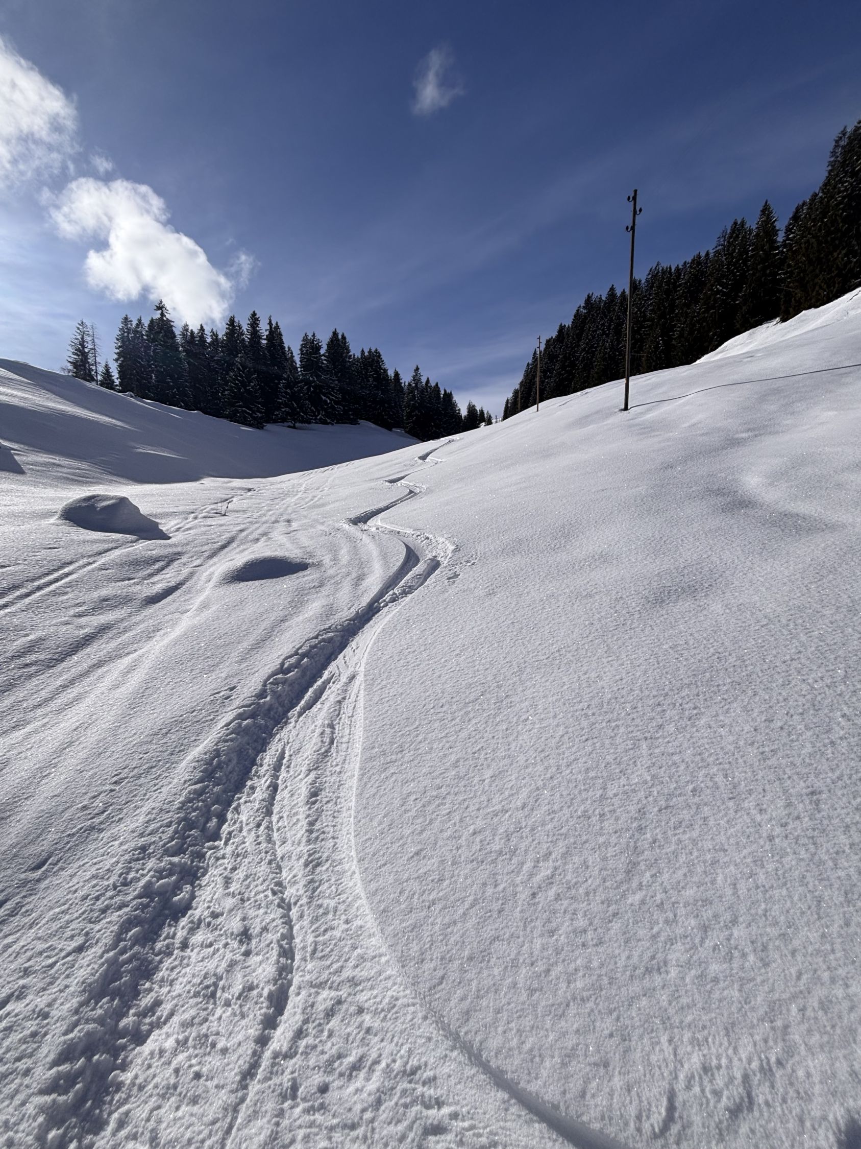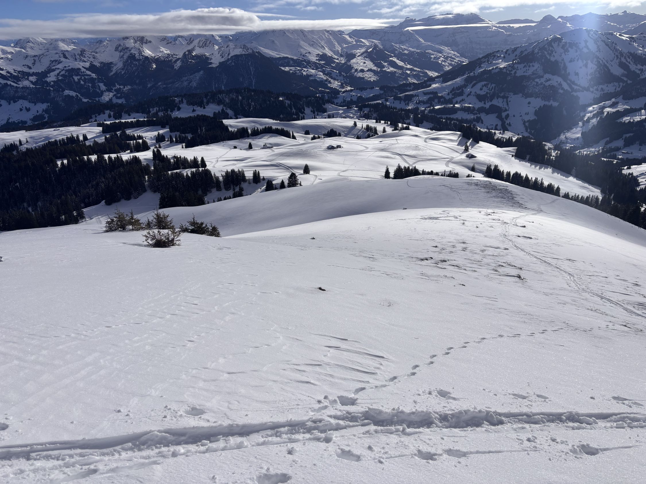 Superschöner Pulverschnee auf der ganzen Route Jaunpass - Hundsrügg - Sparenmoos - Zweisimmen. Die Gegend ist oberhalb von ca. 1'350m recht gut eingeschneit.