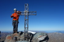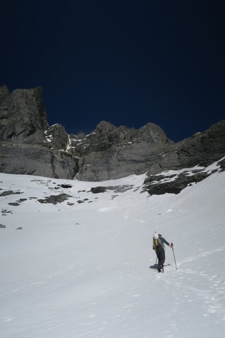 Wir hatten 5 Exen dabei, was ausreichte und haben uns bei der Hütte ein 30m Seil geliehen (20CHF), was auch reichte, Ein Pickel ist sicher hilfreich, die Zahnradsandalen(Steigeisen)haben wir zu Hause gelassen. Es hat überall gute Stände. Beim Abstieg war der Schnee teilweise sehr durchnässt. Wenn möglich früheres losgehen sehr zu empfehlen.