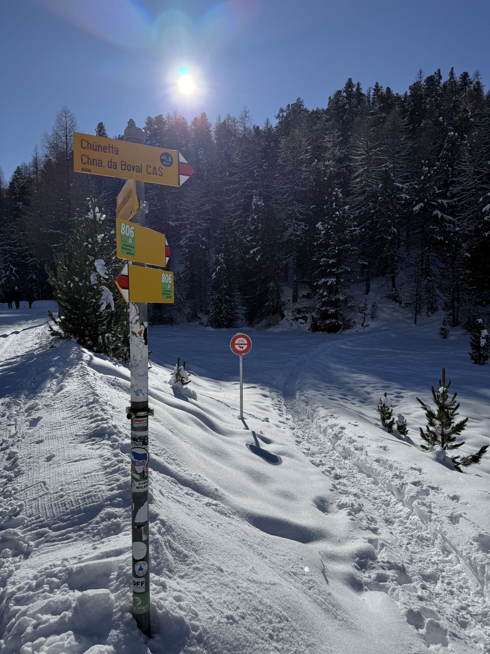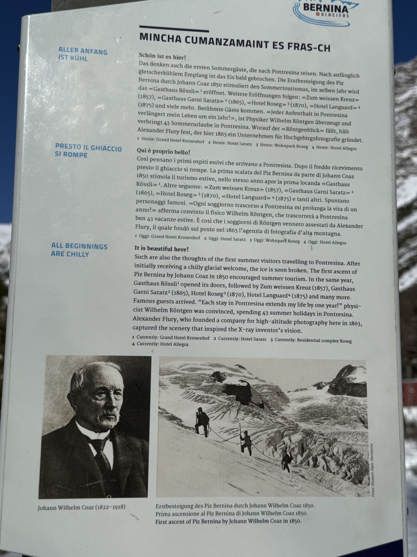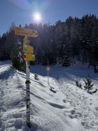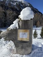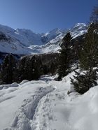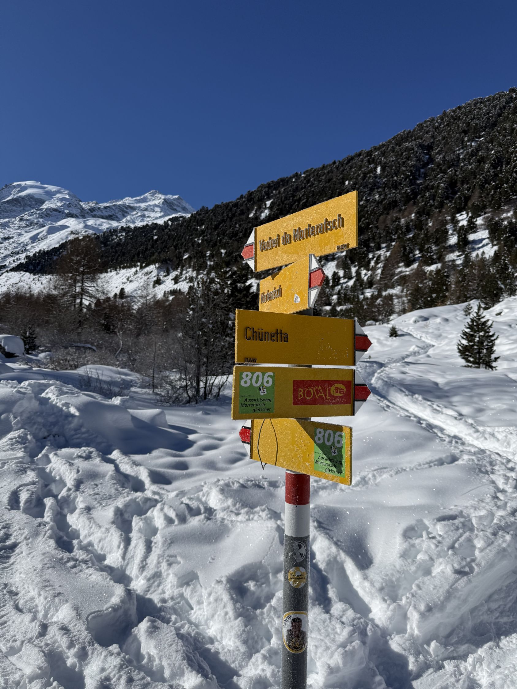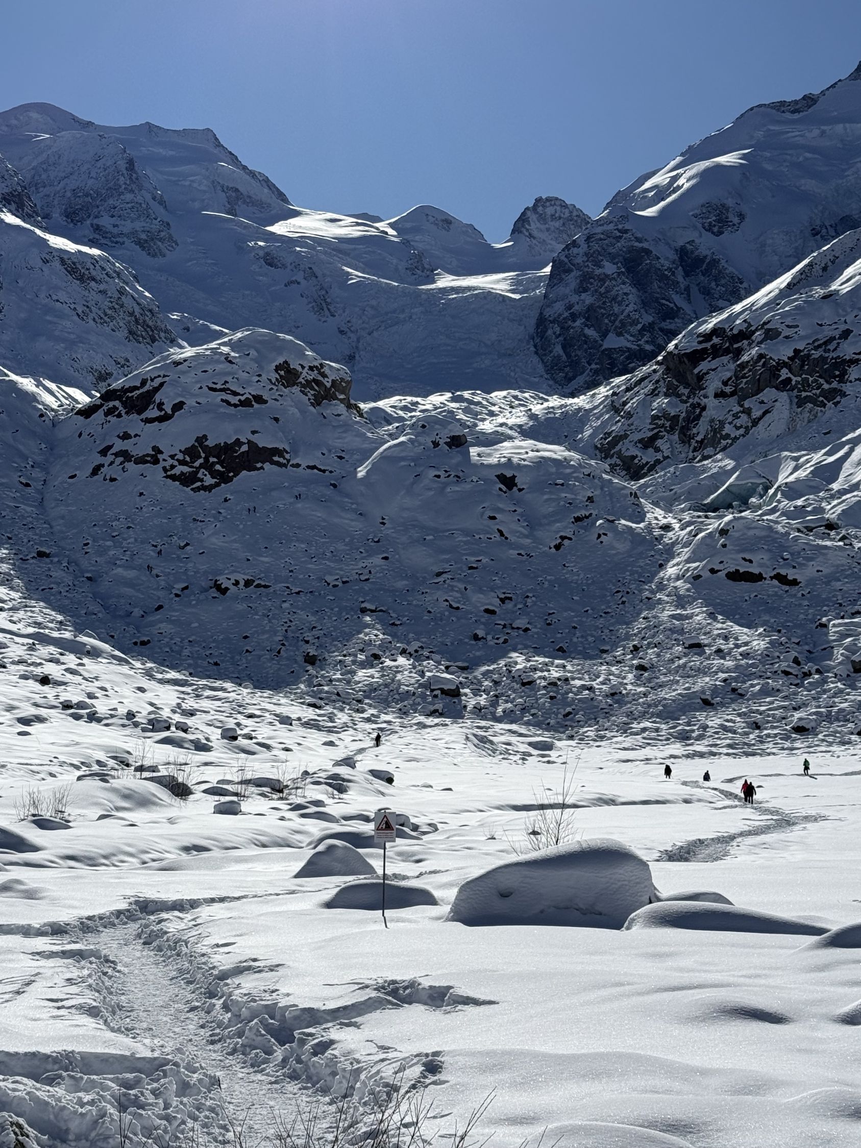 Rundtour zum Ende des Vadret da Morteratsch via Aussichtspunkt Chünetta, ÖV Tour, T3+. Start Bahnhof Morteratsch 9.30 Uhr, minus 12 Grad, windstill, blauer Himmel. Mit Wanderschuhe auf guter Spur steil hoch im Wald zum Aussichtspunkt Chünetta. Bei Abzweigung Bovalhütte runter auch auf guter Spur zum breiten Wanderweg, Loipe, Schlittelpiste Richtung Gletscher. Nach der grossen Brücke über den Ovel da Morteratsch geht es dann steil hoch zum Punkt 2137, dahinter dann die Gletscherzunge und die spektakulären Gletschertore. Grödel hilfreich für Abstieg.