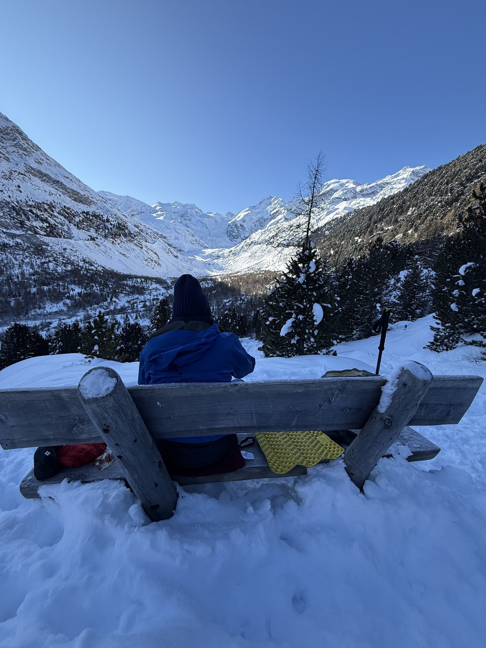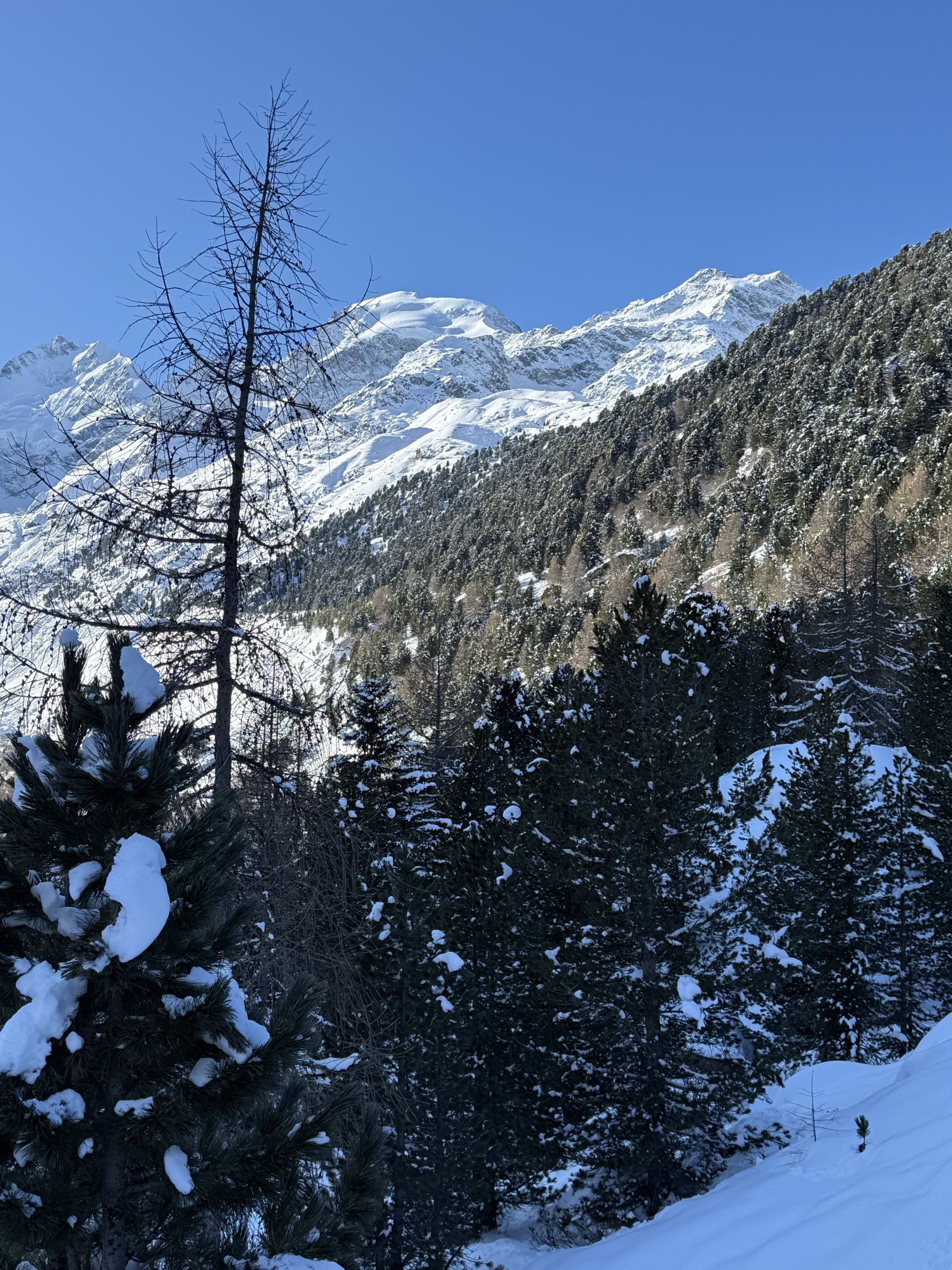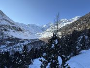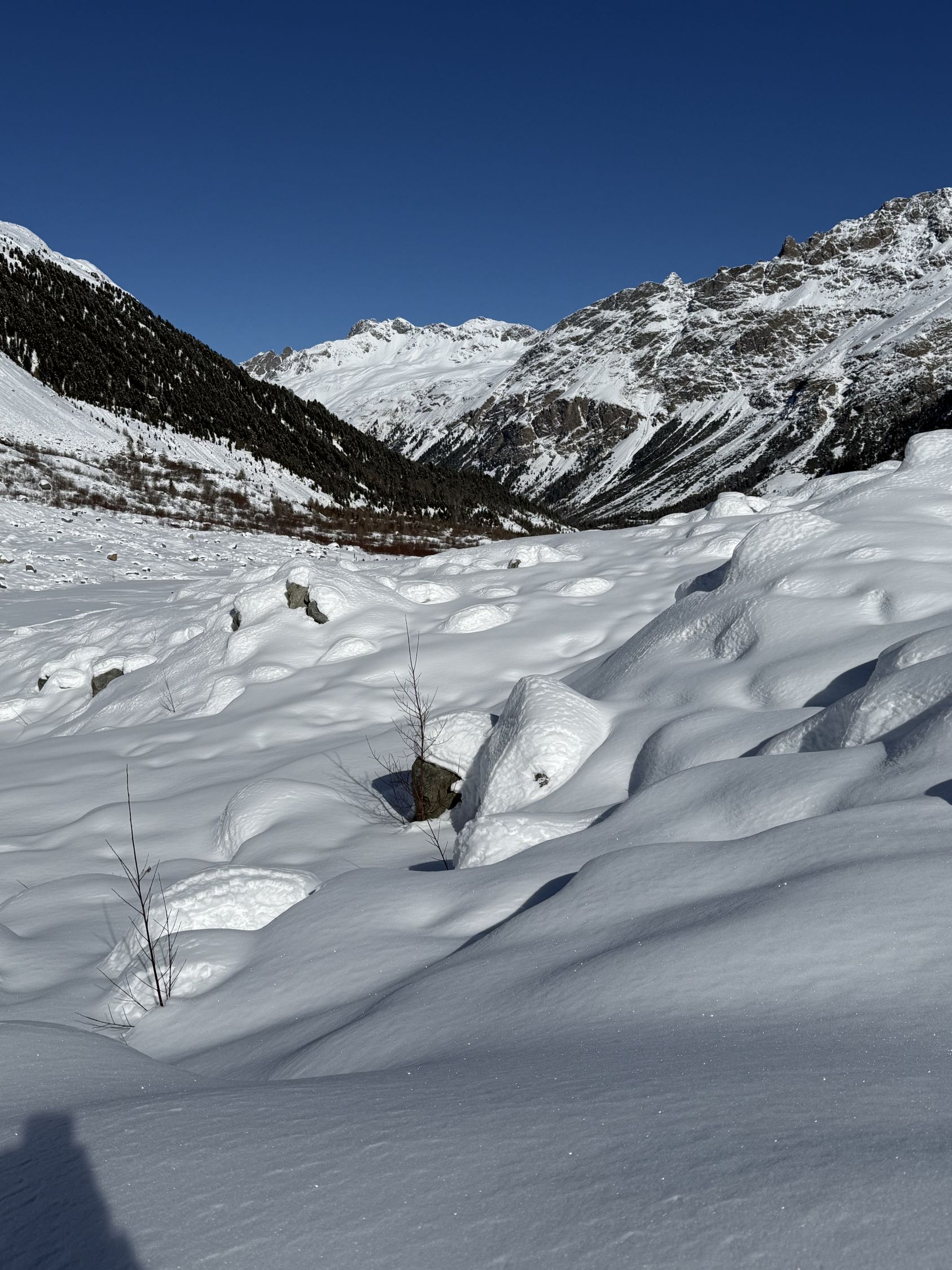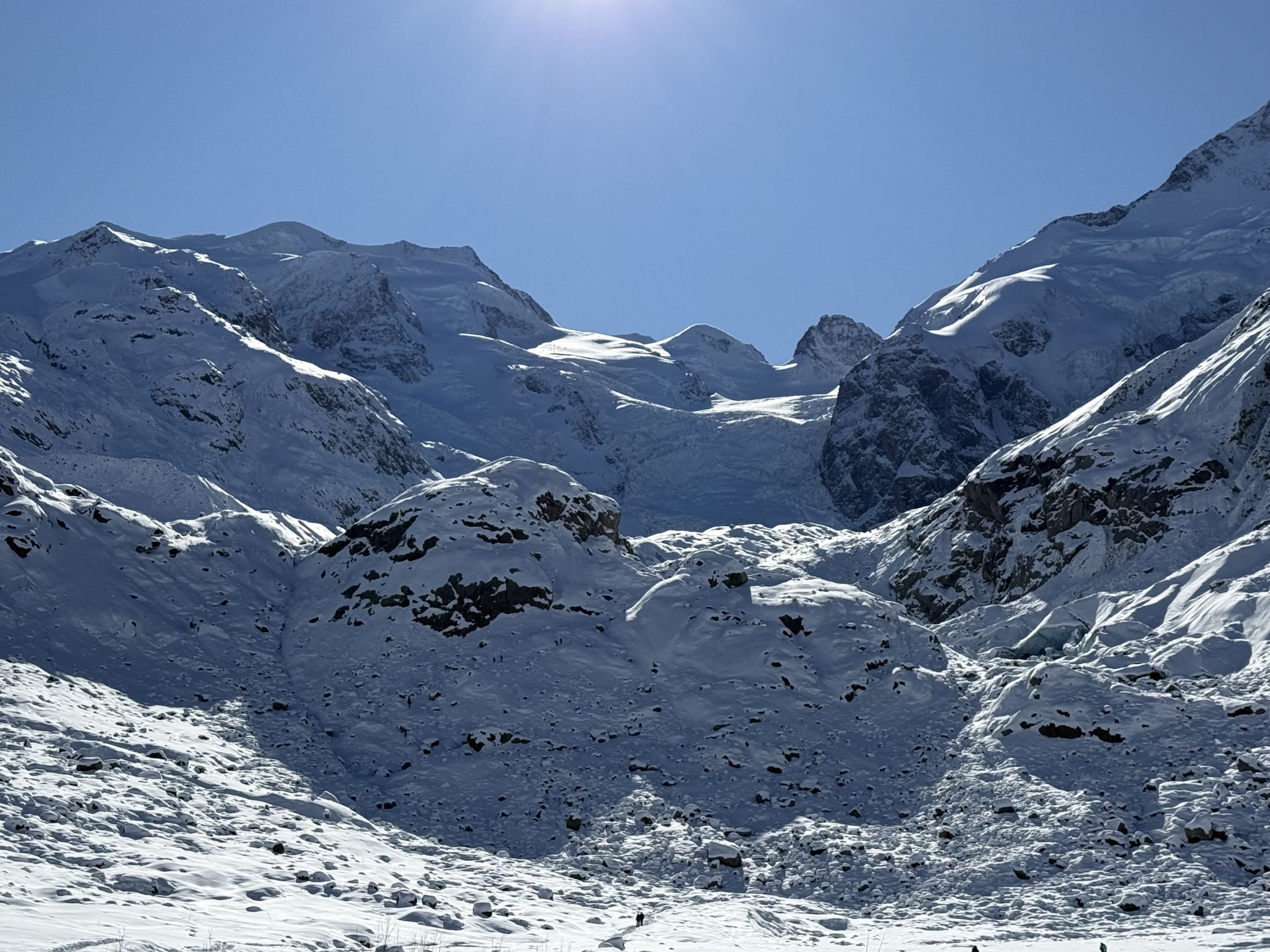 Rundtour zum Ende des Vadret da Morteratsch via Aussichtspunkt Chünetta, ÖV Tour, T3+. Start Bahnhof Morteratsch 9.30 Uhr, minus 12 Grad, windstill, blauer Himmel. Mit Wanderschuhe auf guter Spur steil hoch im Wald zum Aussichtspunkt Chünetta. Bei Abzweigung Bovalhütte runter auch auf guter Spur zum breiten Wanderweg, Loipe, Schlittelpiste Richtung Gletscher. Nach der grossen Brücke über den Ovel da Morteratsch geht es dann steil hoch zum Punkt 2137, dahinter dann die Gletscherzunge und die spektakulären Gletschertore. Grödel hilfreich für Abstieg.