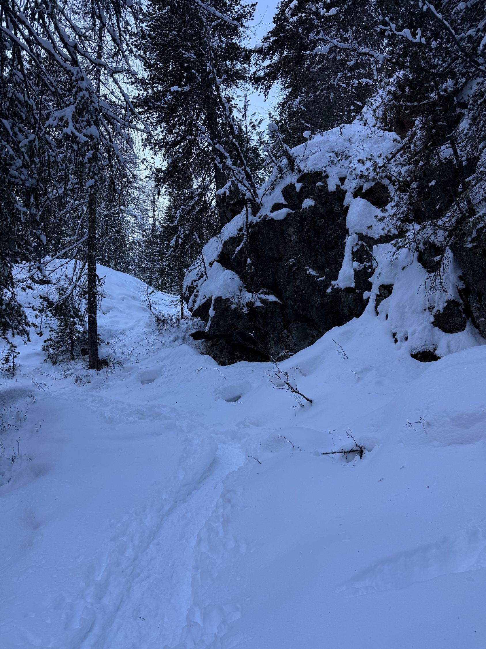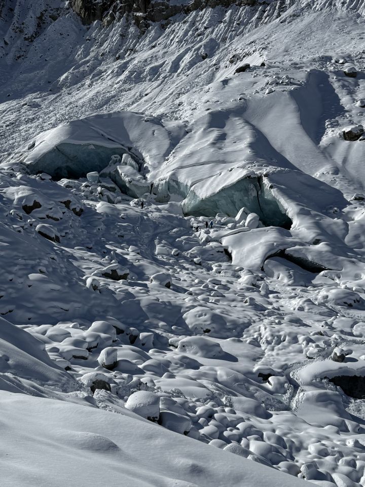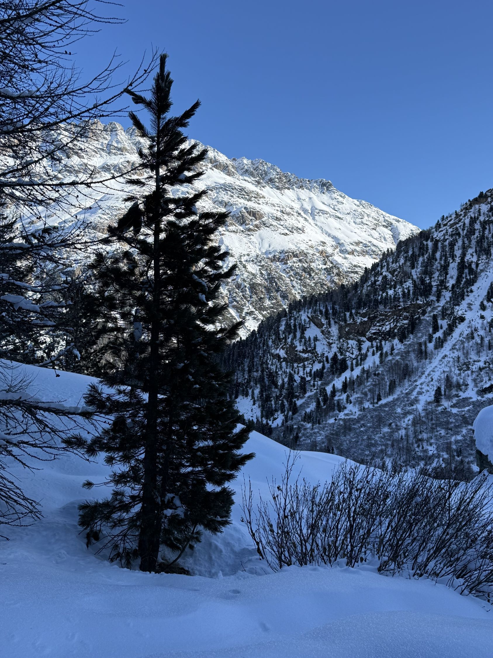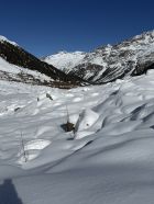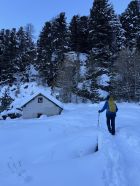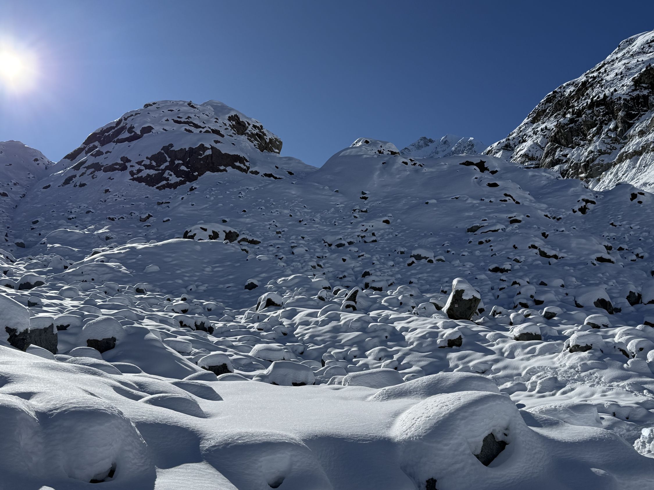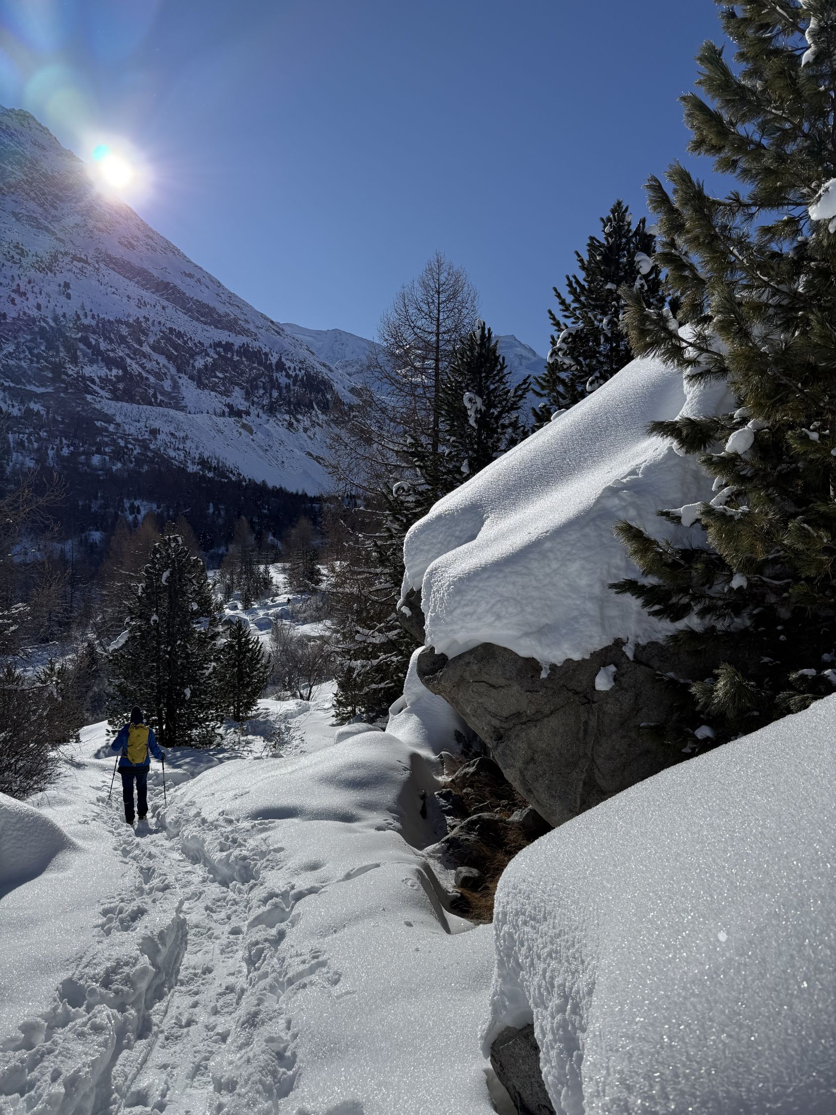 Rundtour zum Ende des Vadret da Morteratsch via Aussichtspunkt Chünetta, ÖV Tour, T3+. Start Bahnhof Morteratsch 9.30 Uhr, minus 12 Grad, windstill, blauer Himmel. Mit Wanderschuhe auf guter Spur steil hoch im Wald zum Aussichtspunkt Chünetta. Bei Abzweigung Bovalhütte runter auch auf guter Spur zum breiten Wanderweg, Loipe, Schlittelpiste Richtung Gletscher. Nach der grossen Brücke über den Ovel da Morteratsch geht es dann steil hoch zum Punkt 2137, dahinter dann die Gletscherzunge und die spektakulären Gletschertore. Grödel hilfreich für Abstieg.