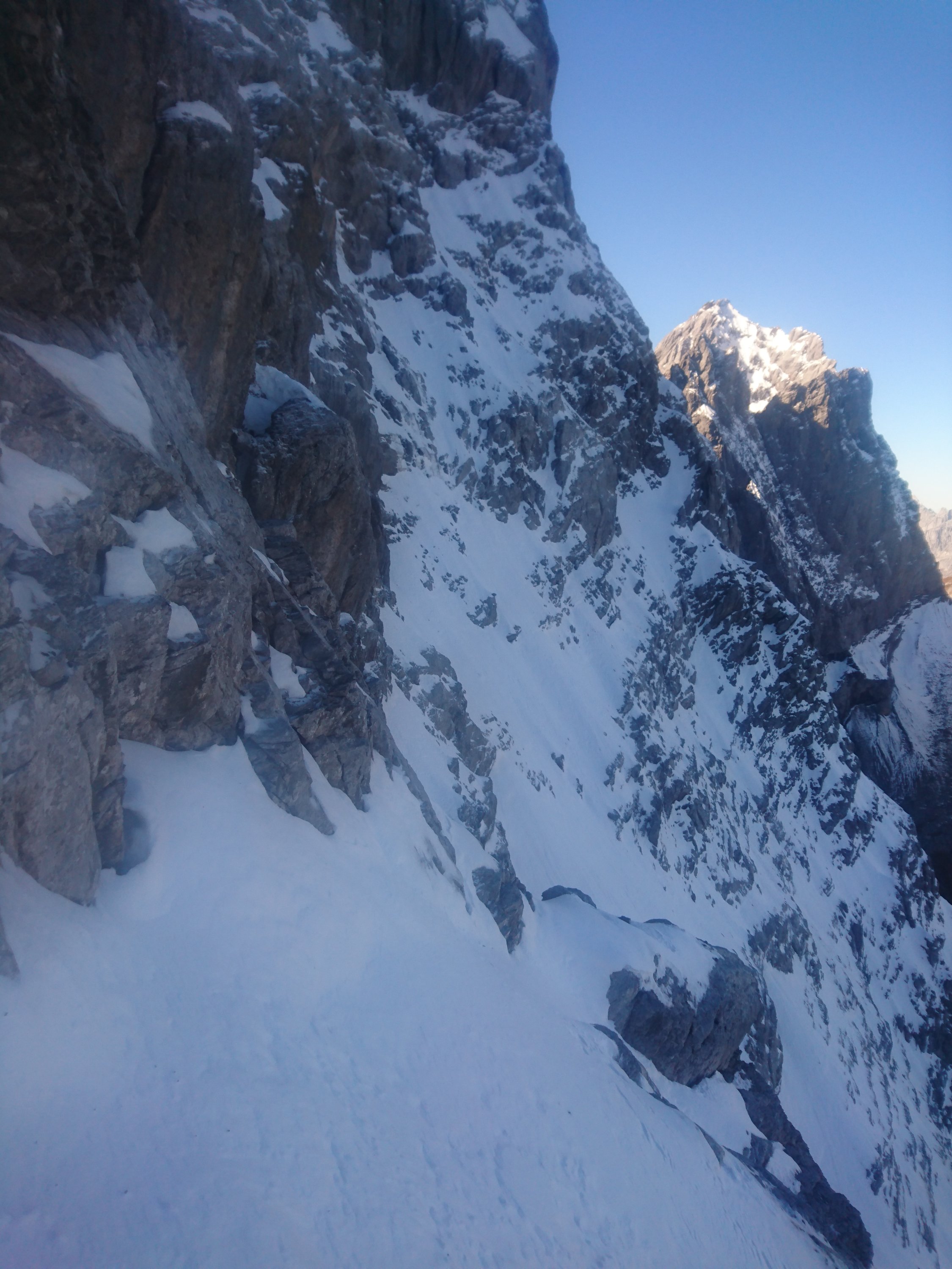 Hab kurz vor dem Forrelensprung die Steigeisen angezogen und die Crux kurz danach war auch noch trocken. Im oberen Teil bin ich dann eher links auf der Rippe geblieben. Evtl. gibt es weiter recht eine etwas leichtere Variante die mehr im Schnee bleibt. Beim Ausstieg über das Standartcouloir kein Blankeis jedoch ziemlich steiler Lockerschnee (65-70°).