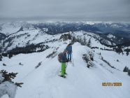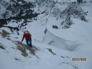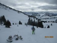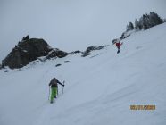 Im Gegensatz zu gestern waren wir heute unter einer Hochwolkendecke unterwegs, die sich allerdings weit über unserem Gipfelziel installiert hatte. Für den Abstieg legten wir die Schneeschuhe für die kurze, ausgesetzte Passage unmittelbar unterm Gipfelkamm ab und gingen zu Fuß. Der Hang unterm Matonajöchle war voll mit wunderbarem Pulver und noch nicht zu arg zerfahren - sehr zum Entzücken auch für Tommy, unserem Tourenpartner auf Skiern. Im Vergleich zum Hohen Freschen ist an der Matona immer weniger los. Heute trafen wir nur ein halbes Dutzend weitere Gipfelaspiranten.