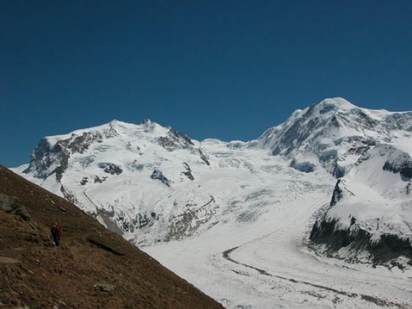 Vom Station Rotenboden aper bis zum Gornergl. hinunter, von da mit Ski bis zur Monte Rosahütte. Am Fr. via Silbersattel über neue Fixseile auf die Dufourspitze. Gute Verhältnisse, richtig durchgefrohren ab ca. 3000 müM. Unter dem Silbersattel hat es einige Eisabbrüche, die nicht ganz harmlos sind. Am Sa. problemlose Tour aufs Stockhorn, Abfahrt mit kurzen aperen Stellen bis Grünsee möglich (ca. 2300müM), von da 40 min. skitragen bis Riffelalp.
