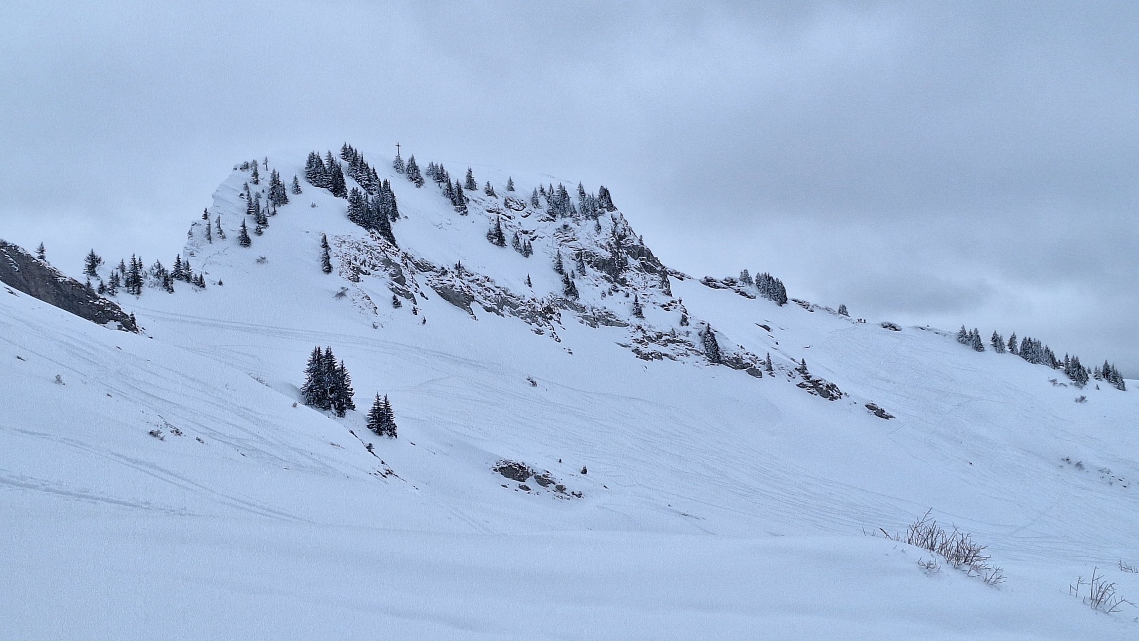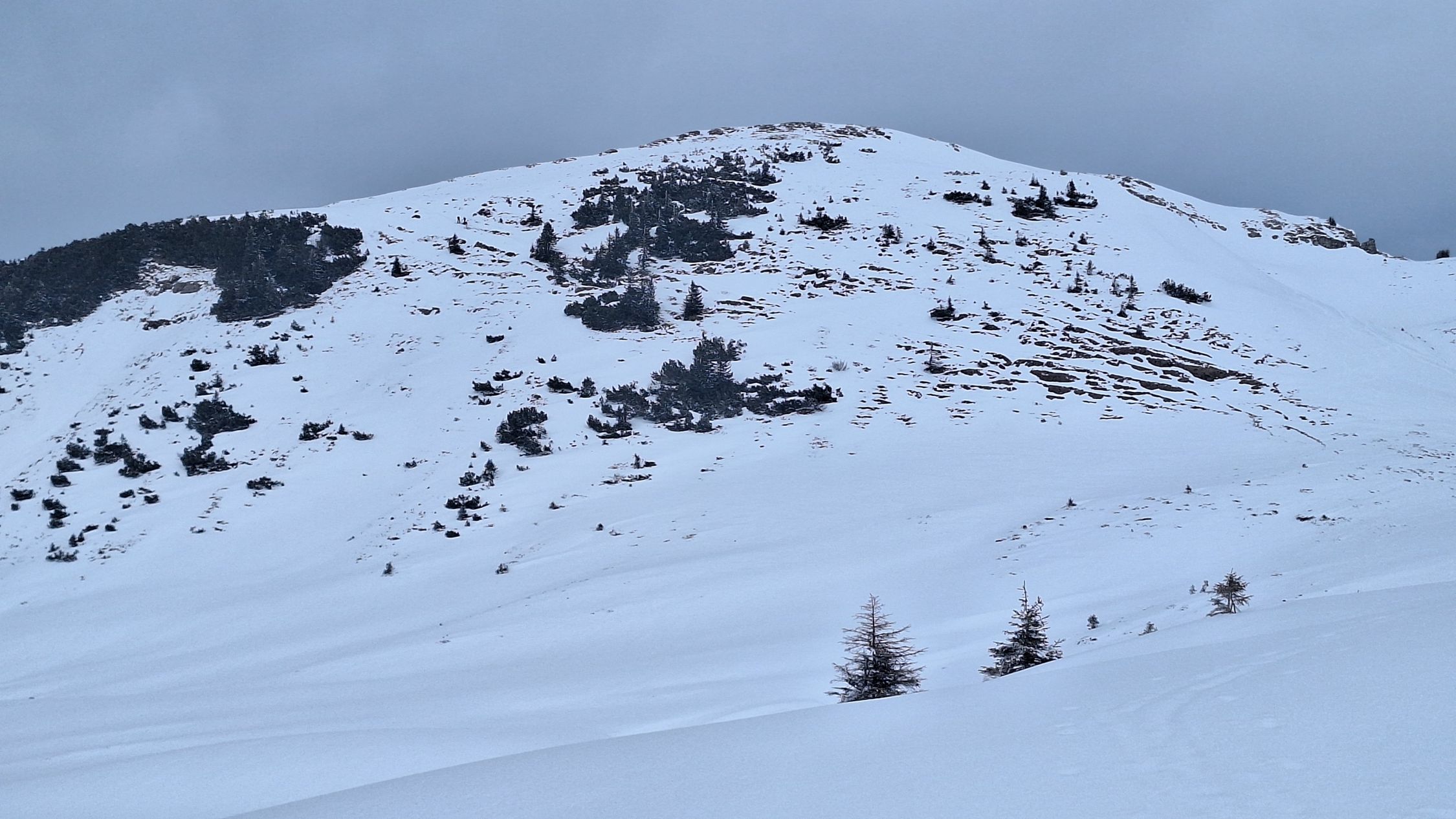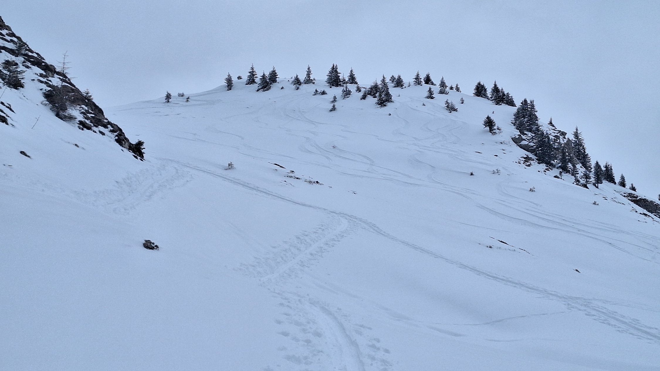 Genug Schnee wenn man etwas achtsam abfährt. Nord- und Westhänge perfekter Pulver. Dort wo die Sonne die letzten 2 Tage am Werk war, schon Richtung Bruchharsch. Leider schlechte Sicht, dafür war der Schnee noch gut.