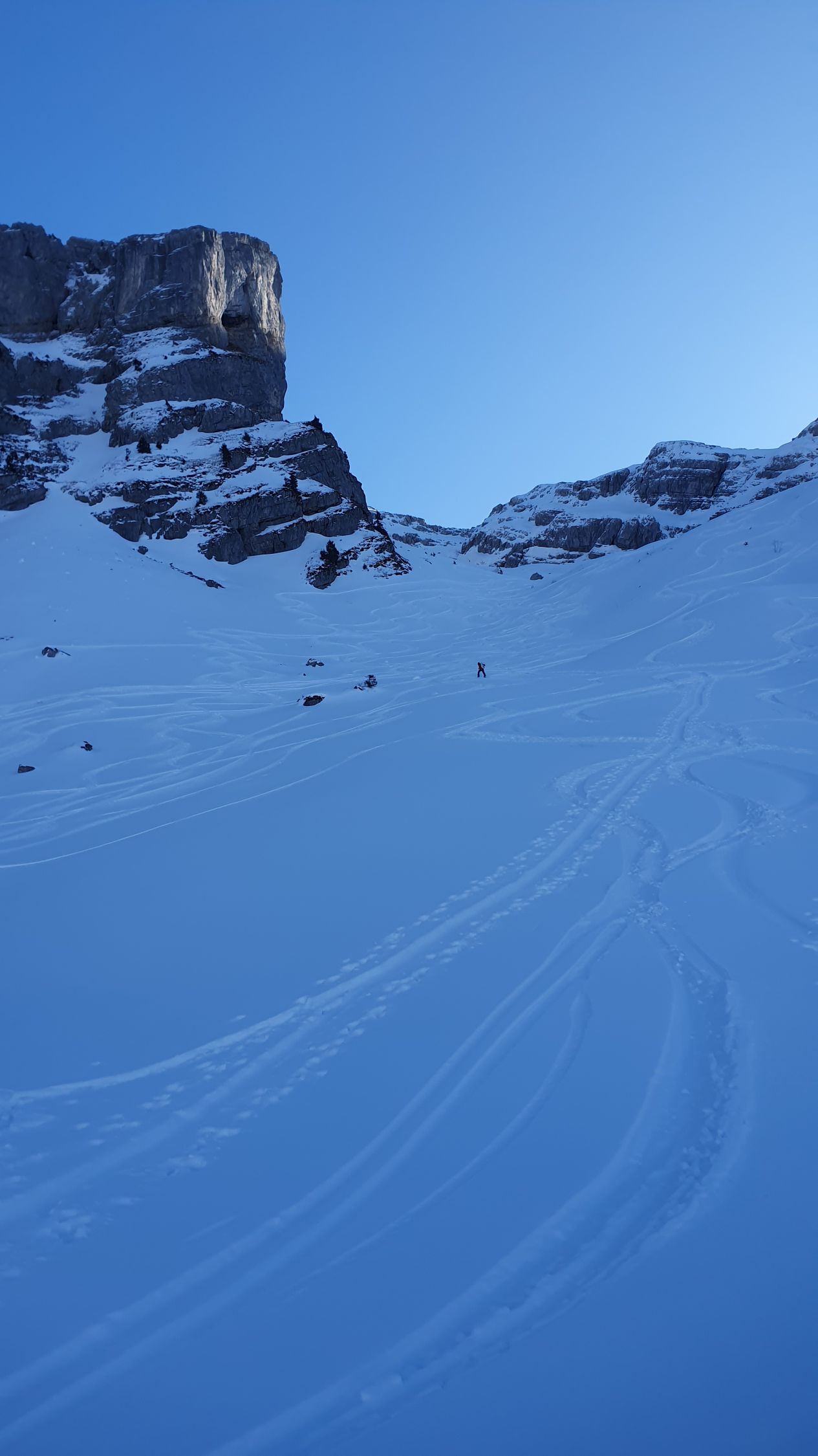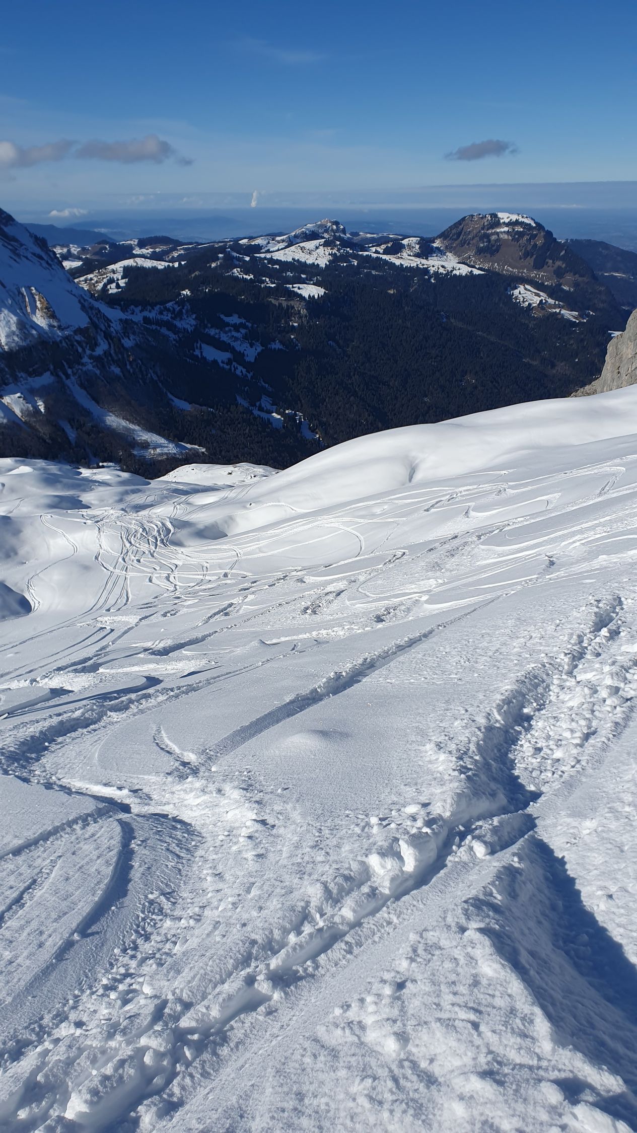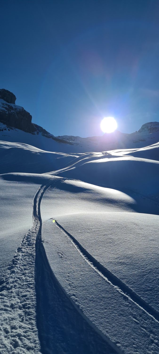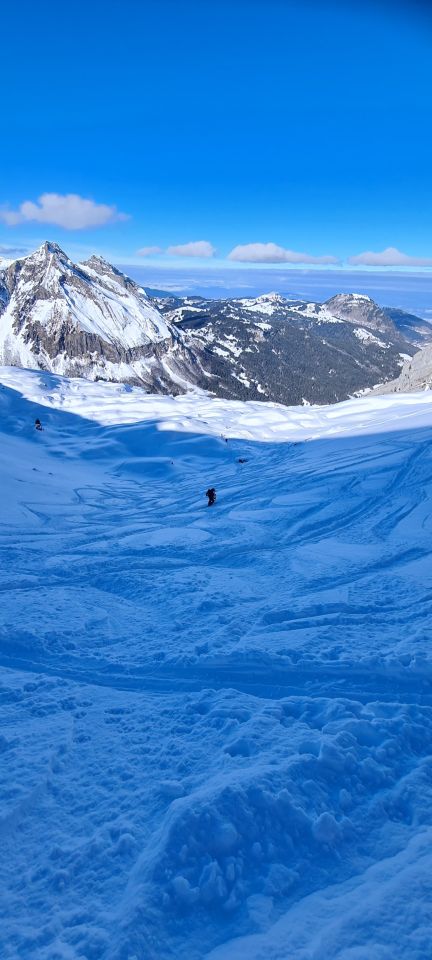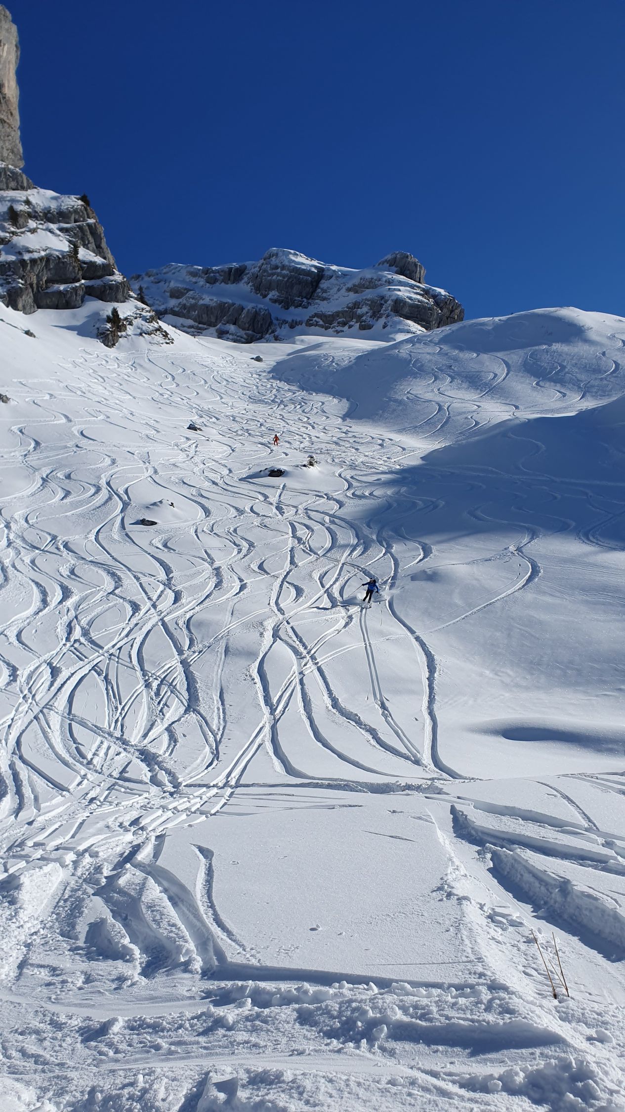 Alles in allem gute Verhältnisse & auch wenn Schnee eher knapp v.a. abgeblasene Stellen (ausser in Mulden) gebe ich ein ausgezeichnet für heute.