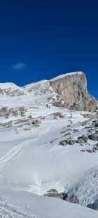 Gut angelegte Aufstiegsspur(en) bis auf den Gipfel. Eisige, harte Schnee- Erd- oder Steinunterlage. Darauf fluffiger Pulverschnee.