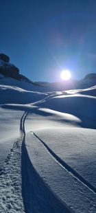 Abfahrt: Hänge waren schon etwas verfahren, dennoch fand man noch einige Pulverstellen, wo man schöne Schwünge ziehen konnte. Leider immer wieder mal mit Feindkontakt (Steine). Wir fuhren ab Rinderweid auf der Strasse runter.