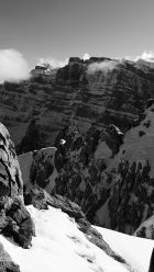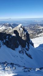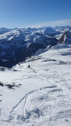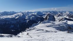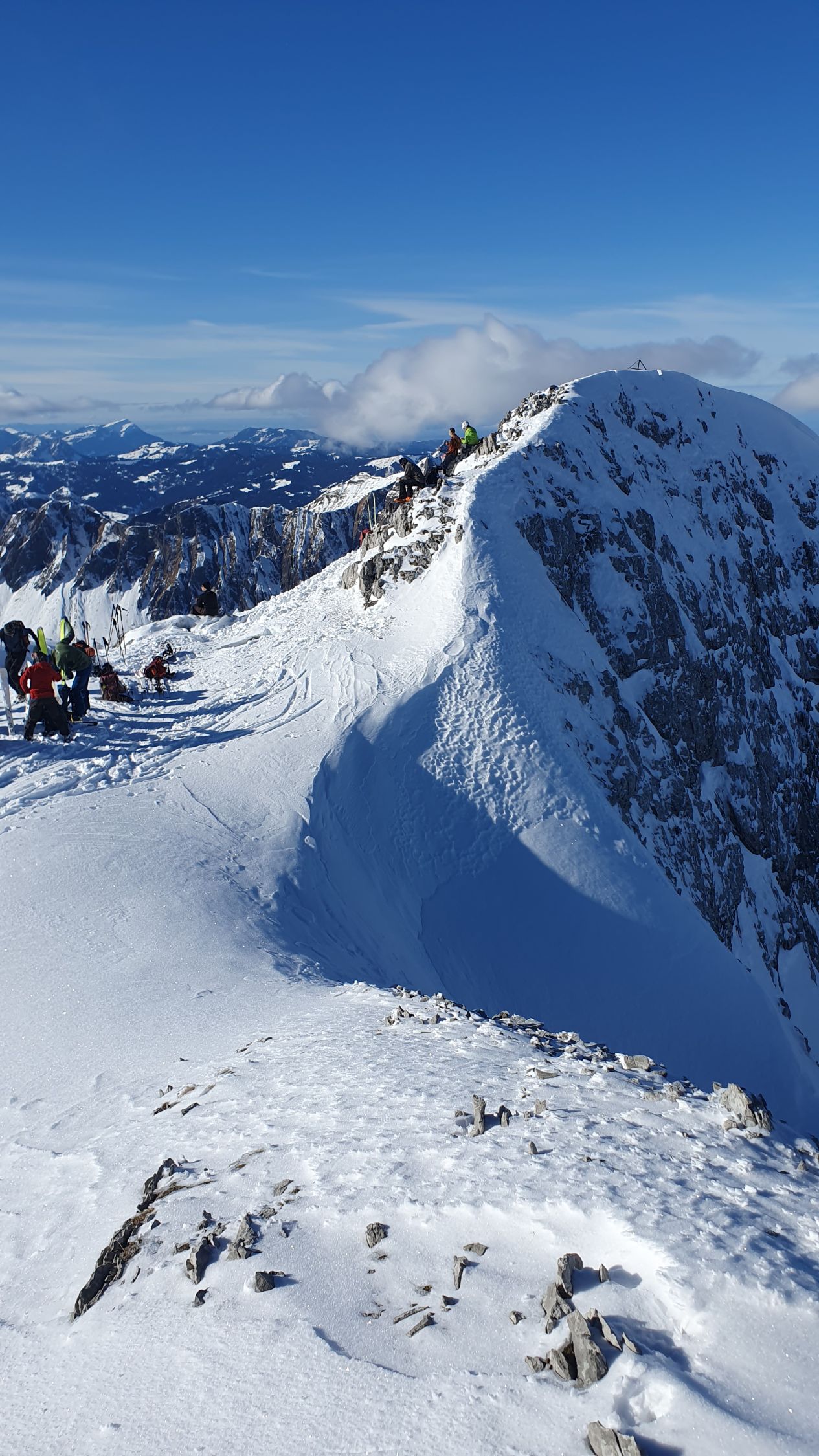 Oben wenig Schnee in den zwei, drei Steilstufen, wo ich mit dem Splitboard auch froh war um die Harscheisen. Heute war einiges los am Berg, verteilte sich aber sehr gut.