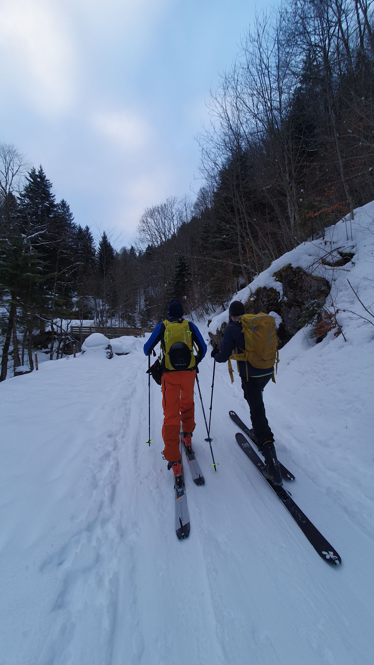 Am besten läuft man bis zur "Rinderweid" alles auf dem Strässchen hoch, damit man gut vorankommt. Weil die zwei Steilstufen im unteren Teil nicht mehr gut machbar sind ohne Harscheisen oder Ski abziehen.