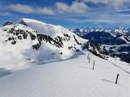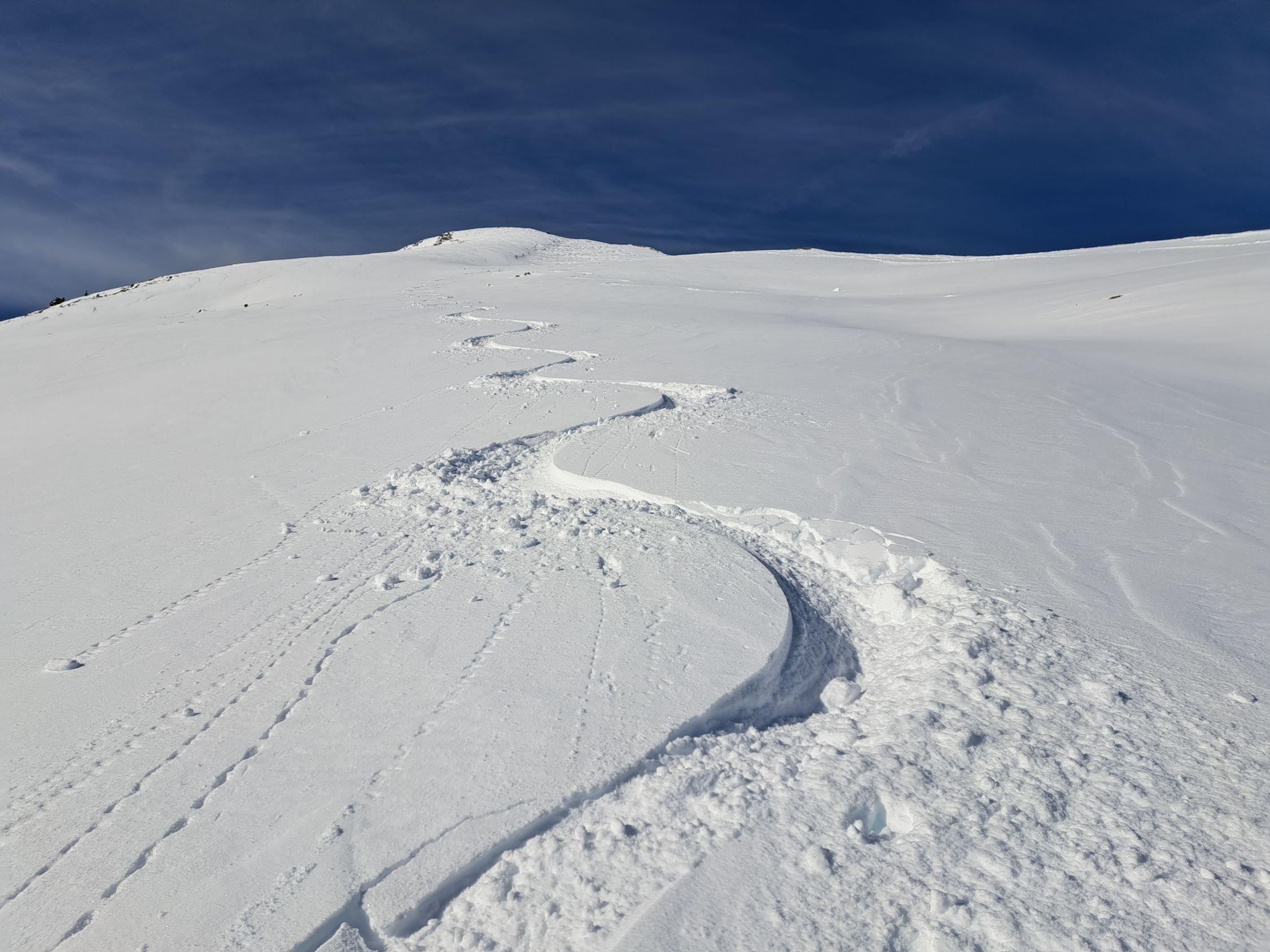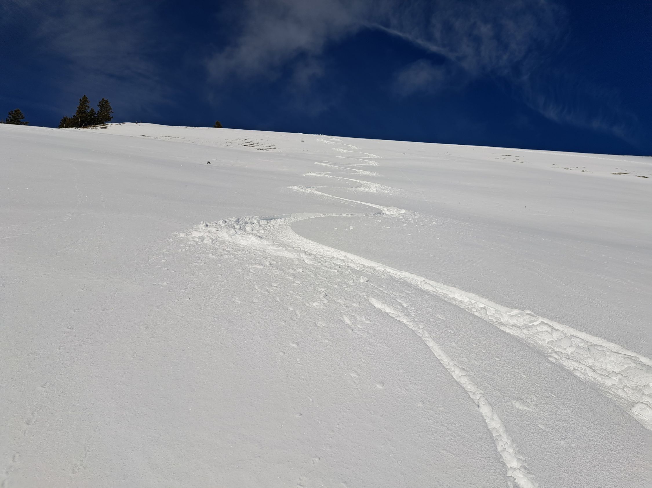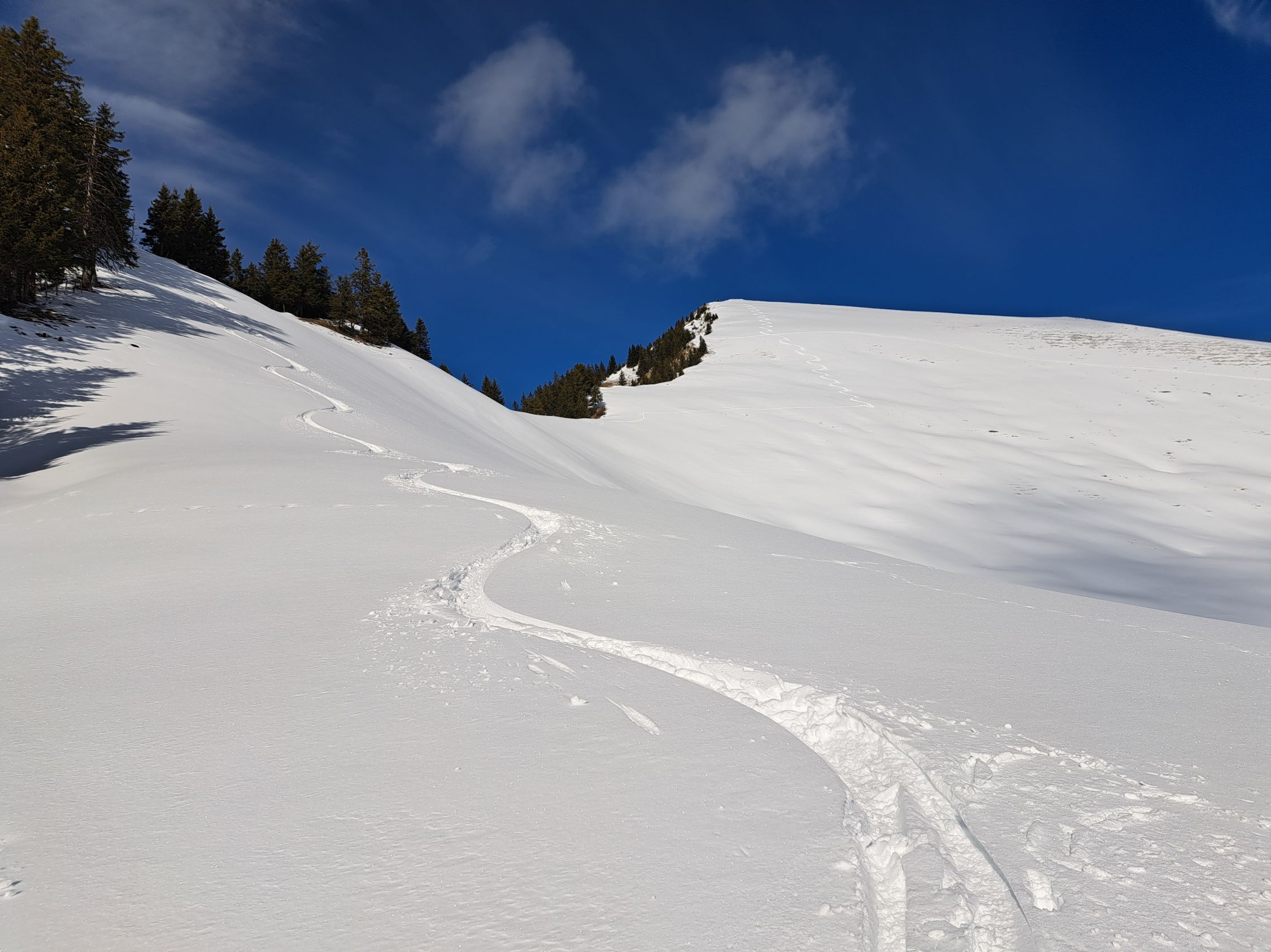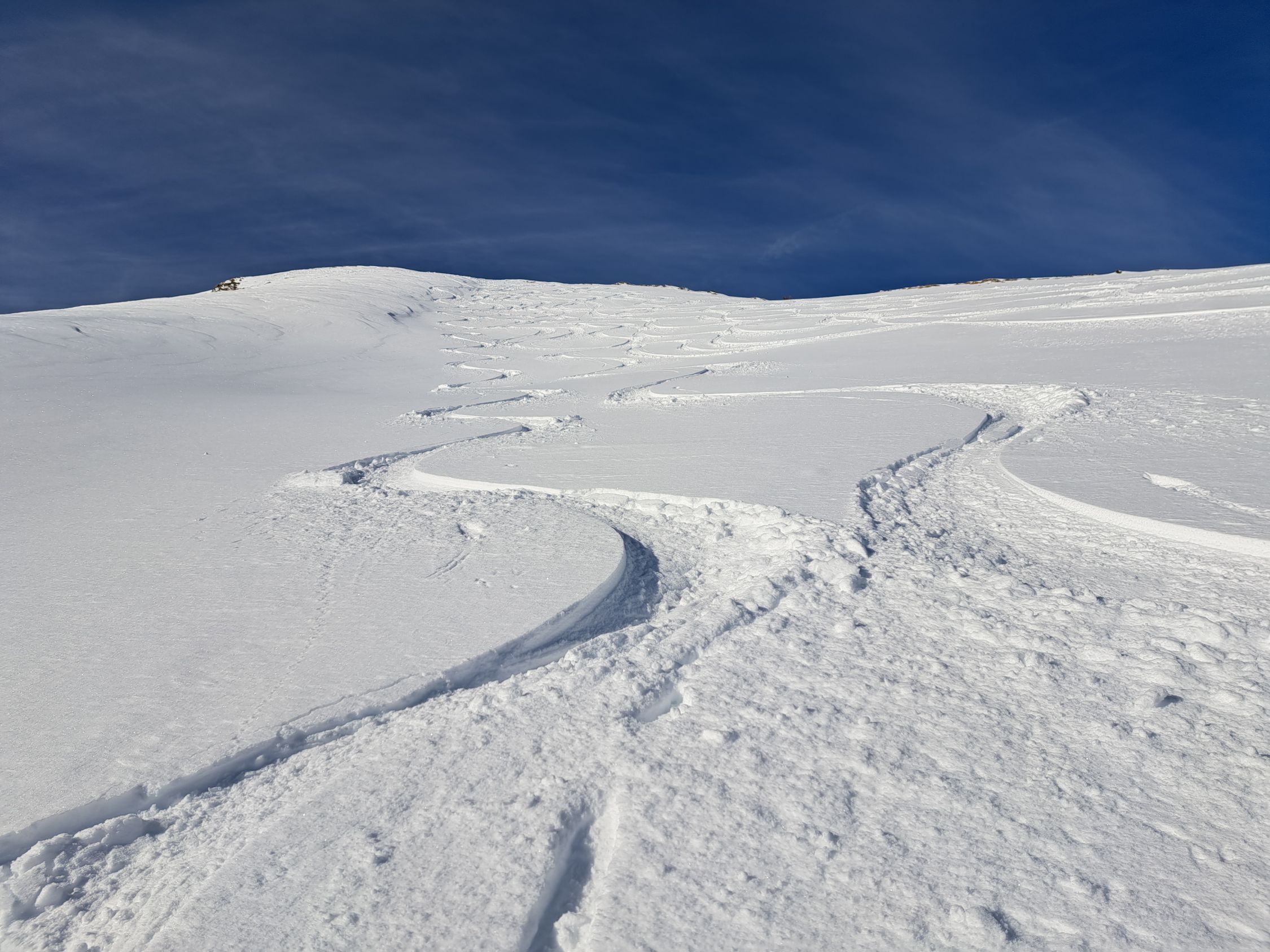 Überall noch 20-30cm Pulverschnee und nur in Südhängen leicht angefeuchtet.