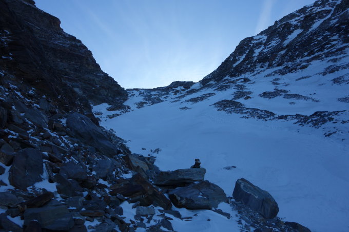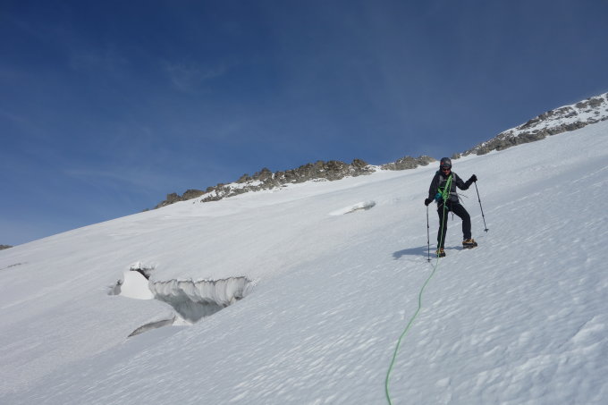 Zur Ausrüstung:wir hatten 40m Seil dabei (30 geht auch, da kein Abseilen nötig), Zwei Link Cams (0.5/0.75) evtl. wäre noch ein 1 u.2 Cam gut gewesen, da entweder sehr kleine oder grosse Ritzen vorhanden - sofern der Fels hält. Schlingen und Express etc. hatten wir dabei aber nie gebraucht. Für Gletscherabstieg Steigeisen und Pickel gut.