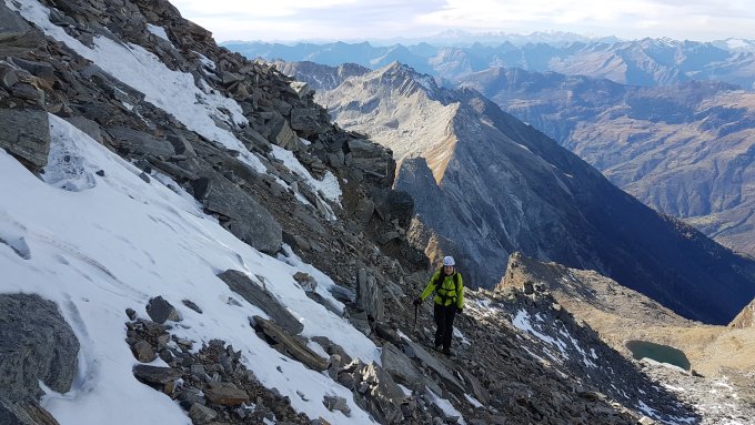 die Traverse unter dem Grauhorn vorbei am Cima della Negra ist ziehmlich Steinschlag gefährdet. Hier sollte man sich möglichst auf der anderen Seite der Senke halten.
