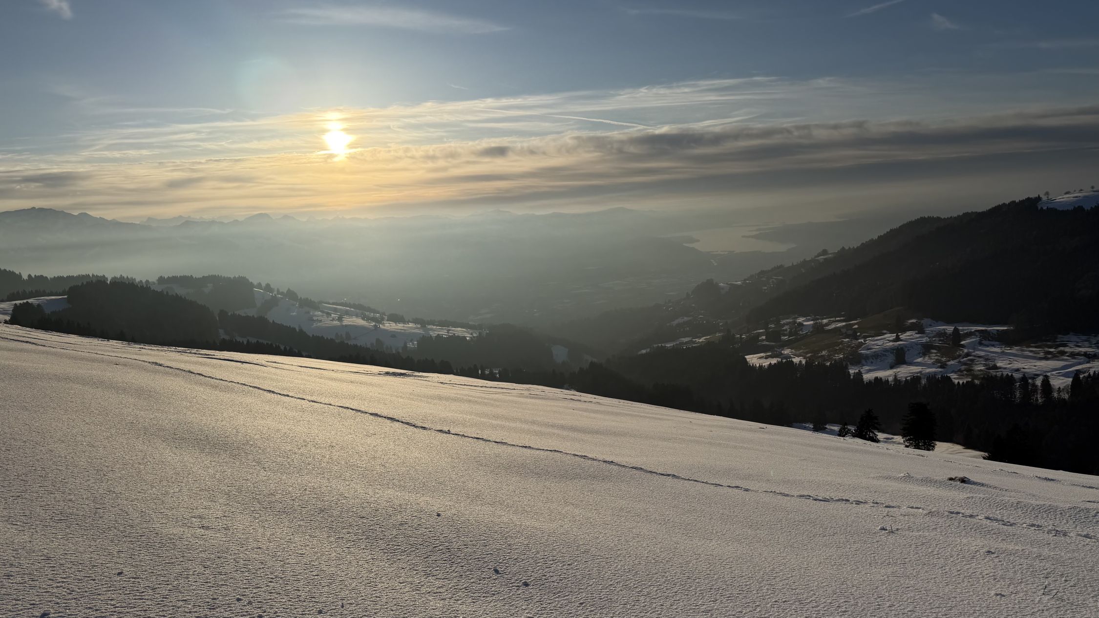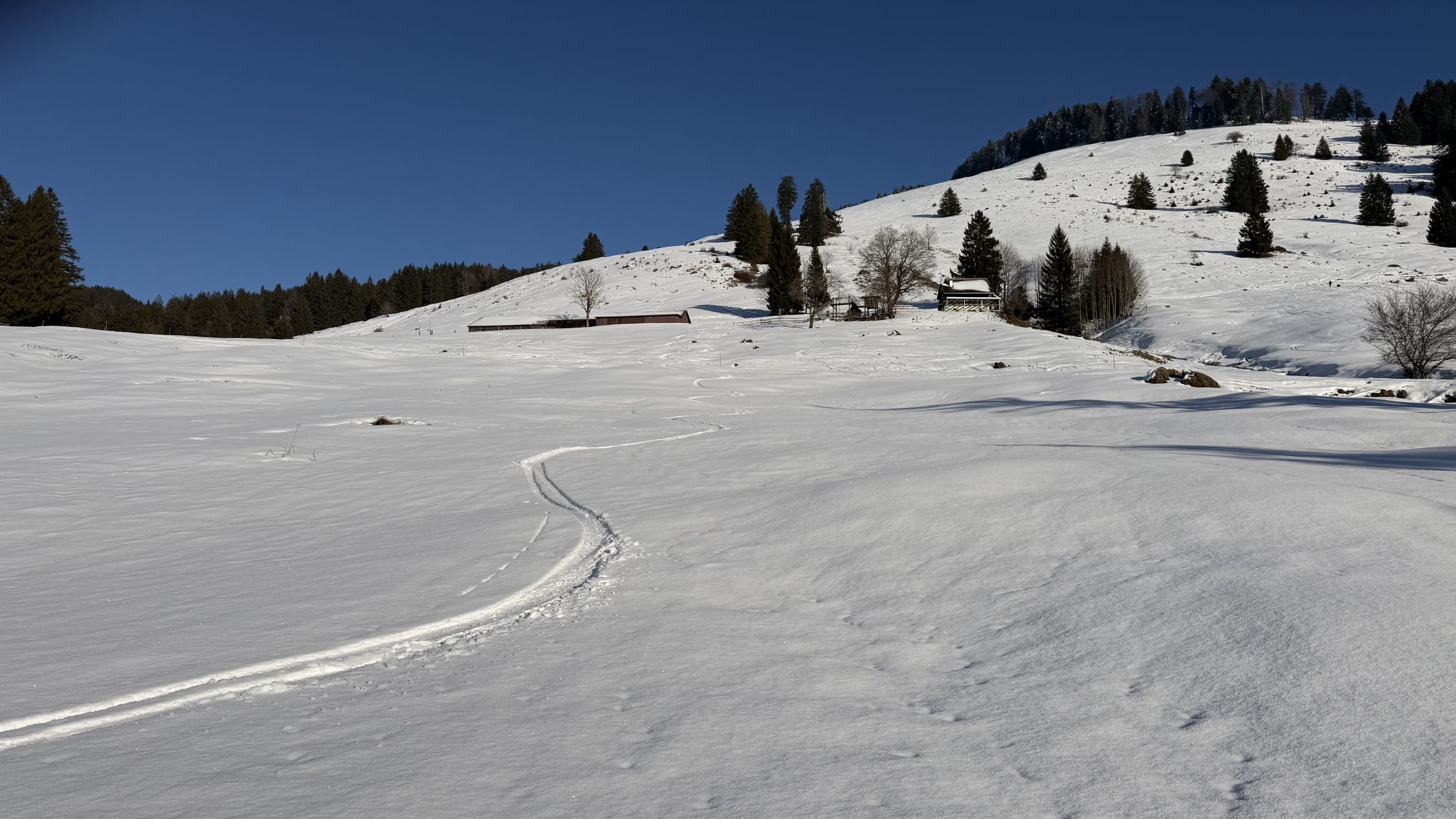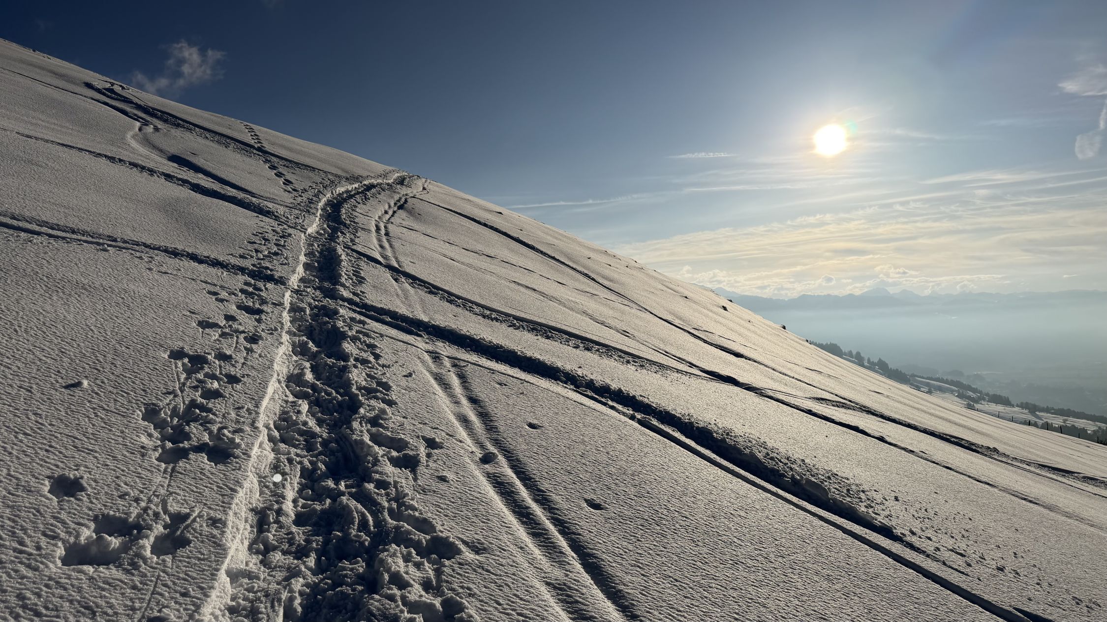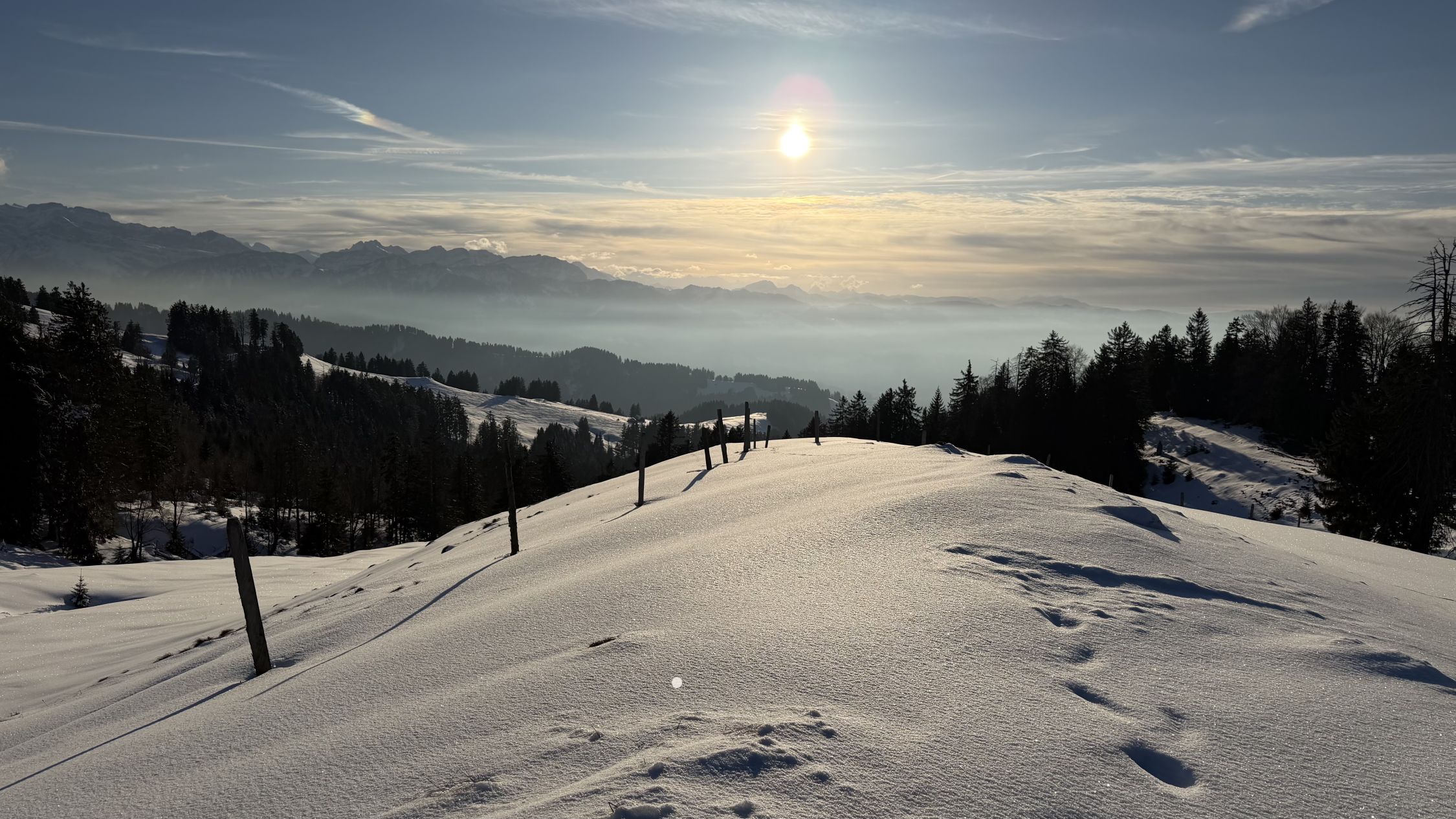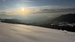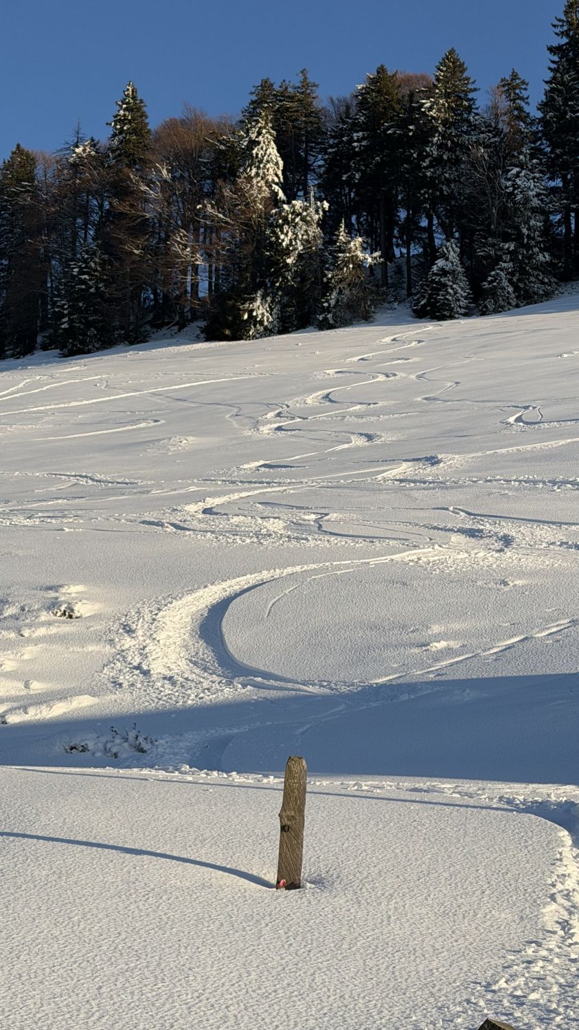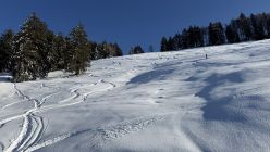 Abfahrt über Nüzimmer, Pulver auf Unterlage. Unterhalb 1100müM mit Kruste, auch am Schatten. Ab da besser in den SW-Hang, dort Sulz, solange Sonne (bei zweiter Abfahrt 16.30 bereits wieder Kruste…)