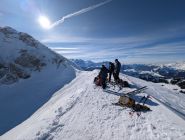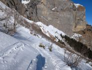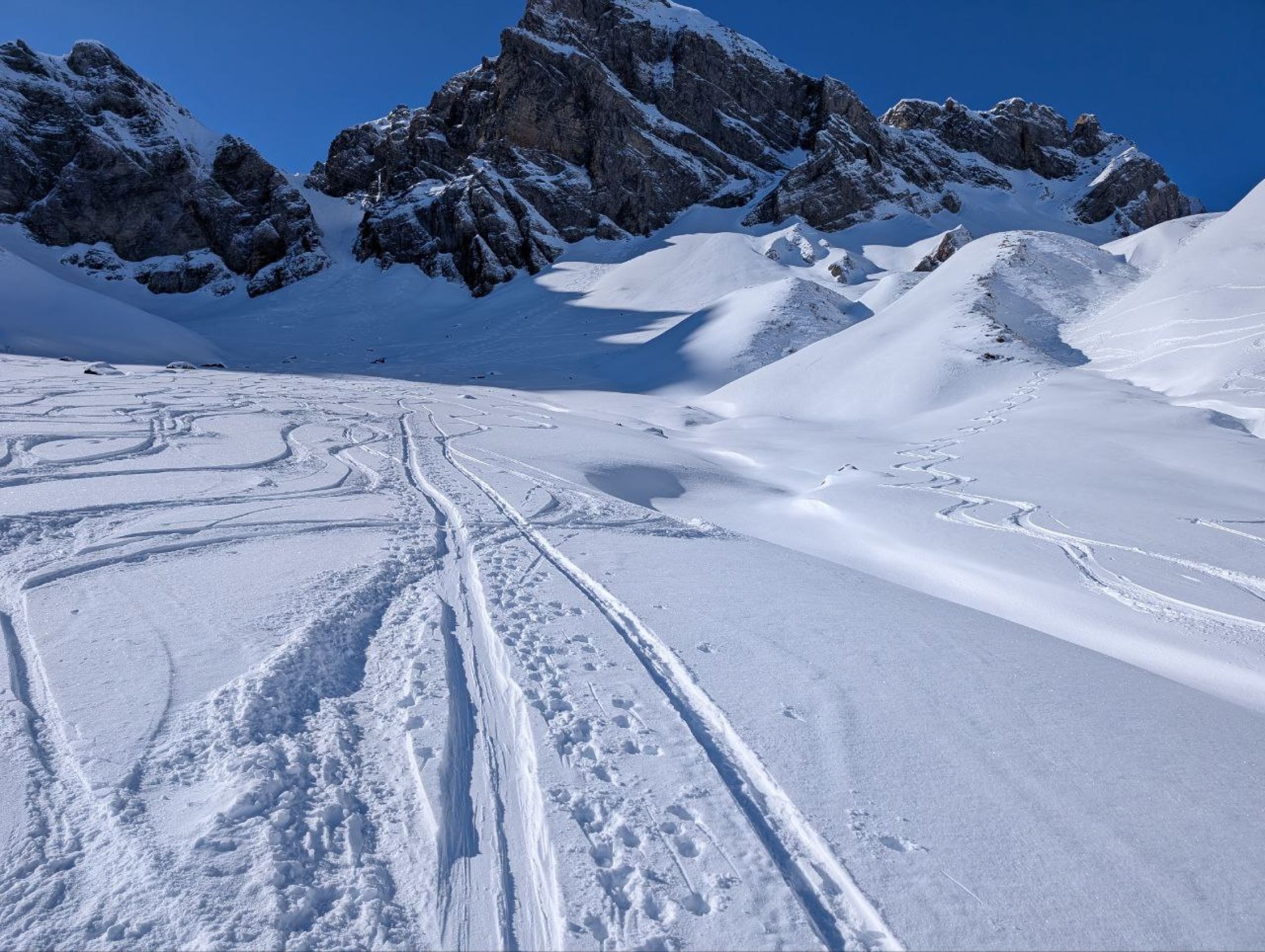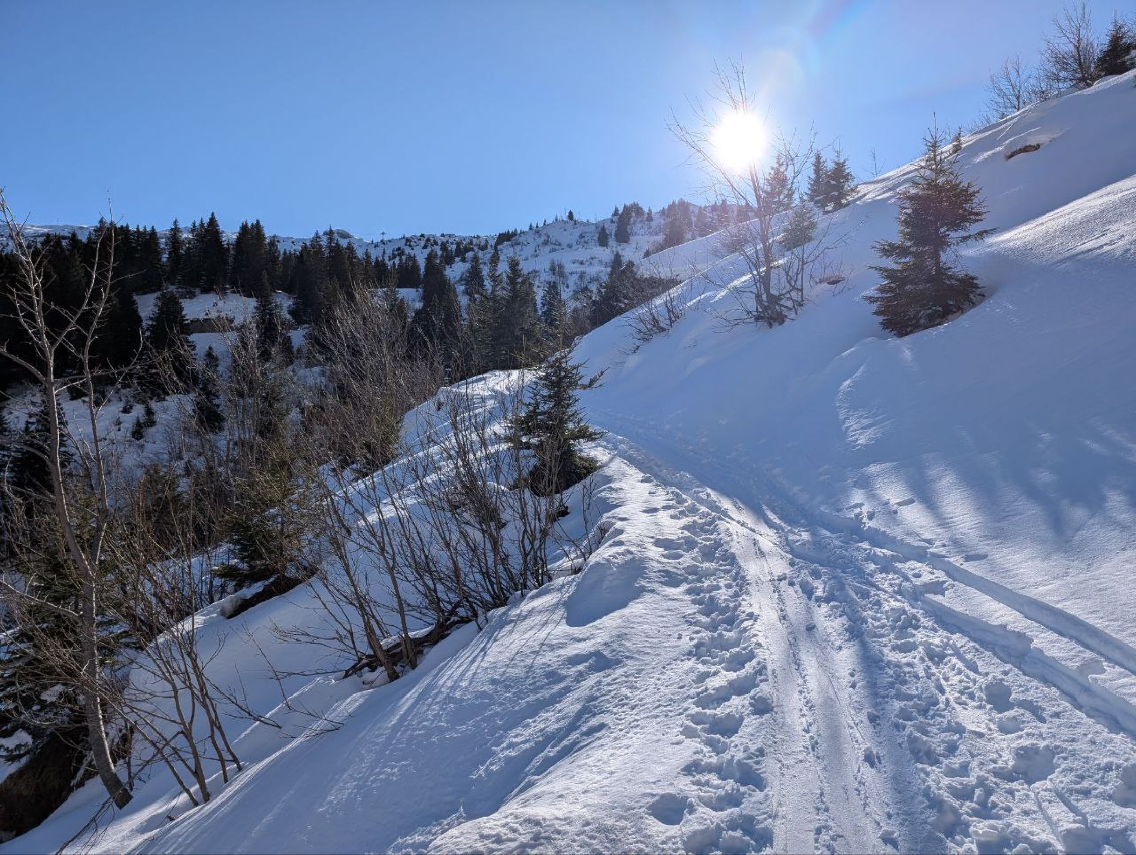 Im Wald ist der Schnee stellenweise abgetaut, man muss auf Geröll aufsteigen (siehe Foto). Ich musste einmal die Skis abnehmen. Ab ca. 1300m Höhe ist der Schnee geschlossen. Oben Stellenweise etwas hart, aber insgesamt sehr gute Verhältnisse. Unter dem Gipfel ist die Spur nicht sehr gut gelegt. Insgesamt eine gelungene Tour. Abfahrt oben auf weichem, noch recht frischem Schnee. Unten über die Piste, weil im Wald zu wenig Schnee liegt.