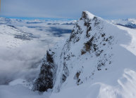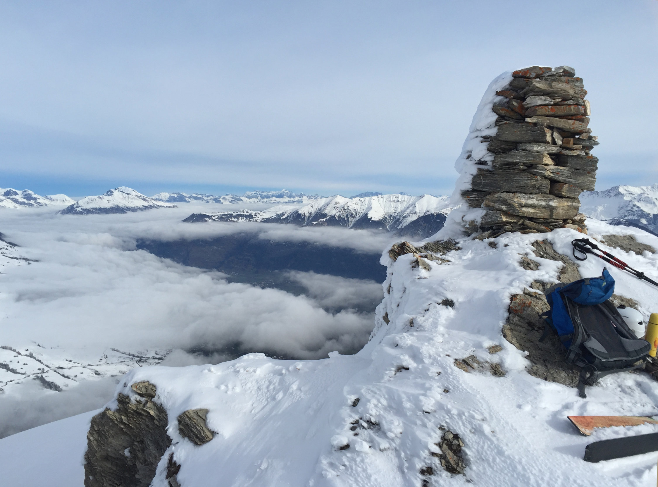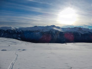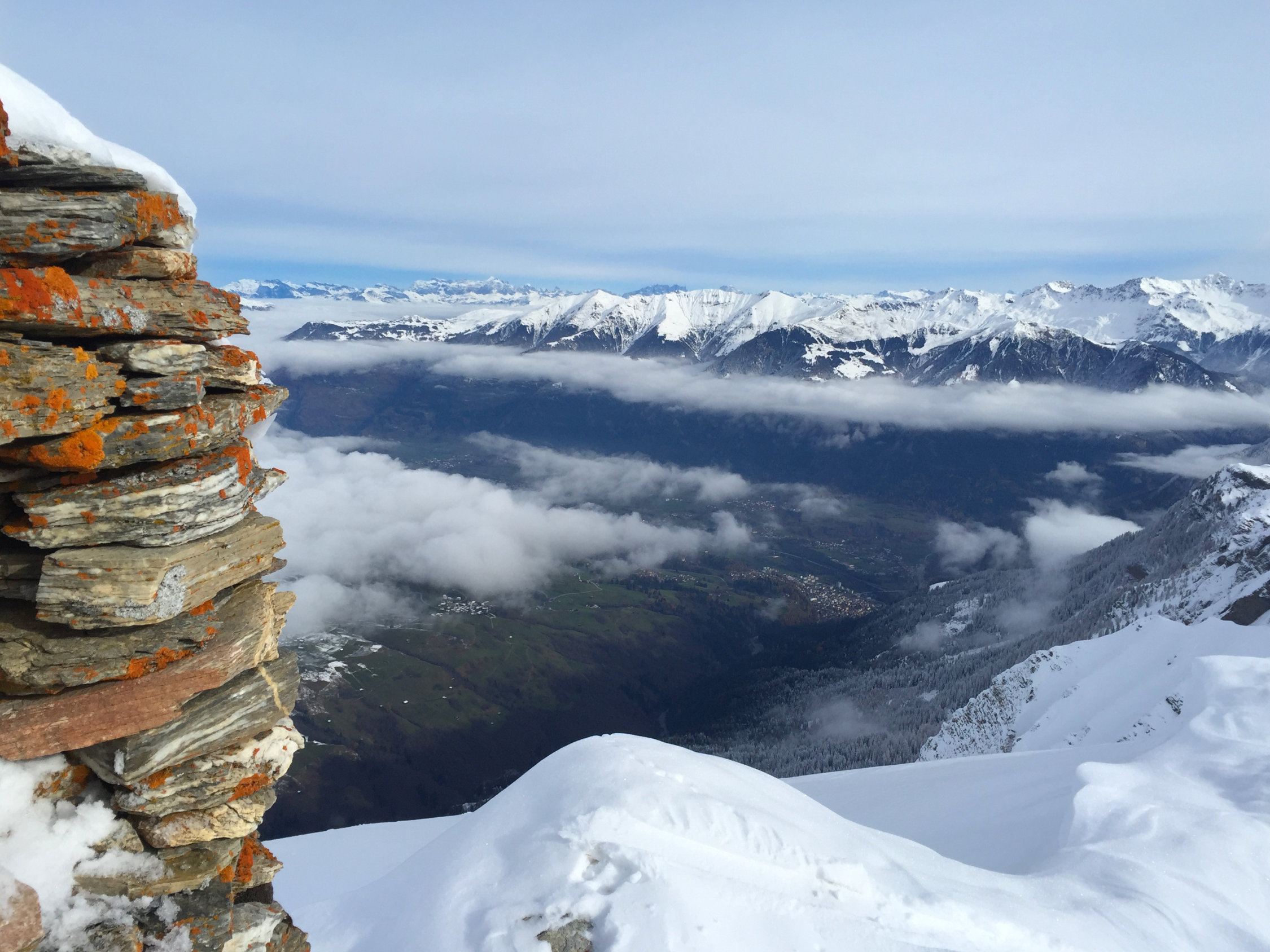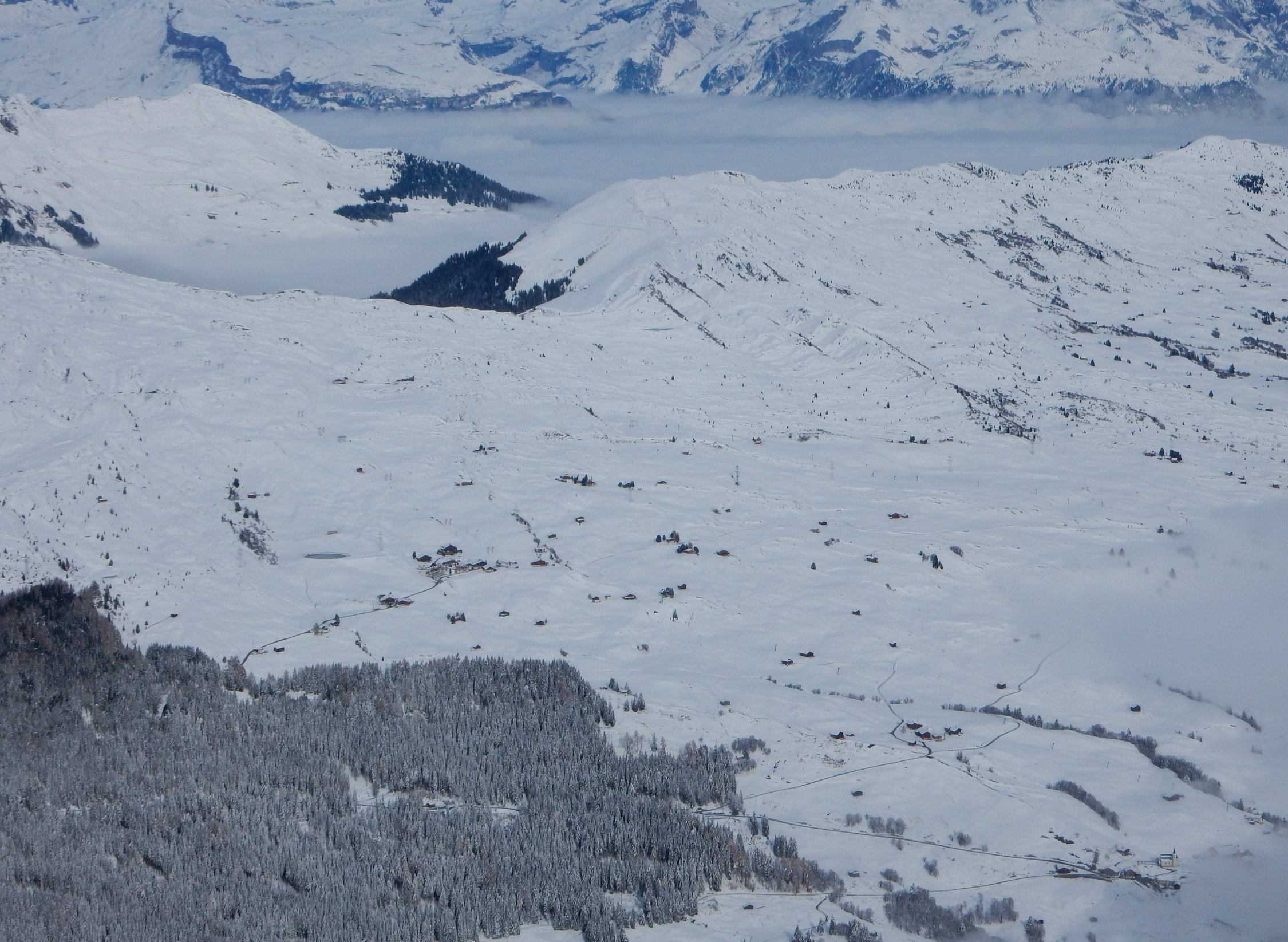 Es war schon ganz nett für den 10. November... Die Verhältnisse waren jedoch noch nicht das Gelbe vom Ei. Bis Dros (1800 m) liegt sehr wenig Schnee, weiter oben trifft man dann auf eine mehr oder weniger geschlossene Schneedecke mit diversen Schneearten, u. a. auch Pulverschnee vom Feinsten. Das Wetter war am Morgen und Vormittag noch akzeptabel, der Tiefblick auf den Heinzenberg und das Domleschg imposant.