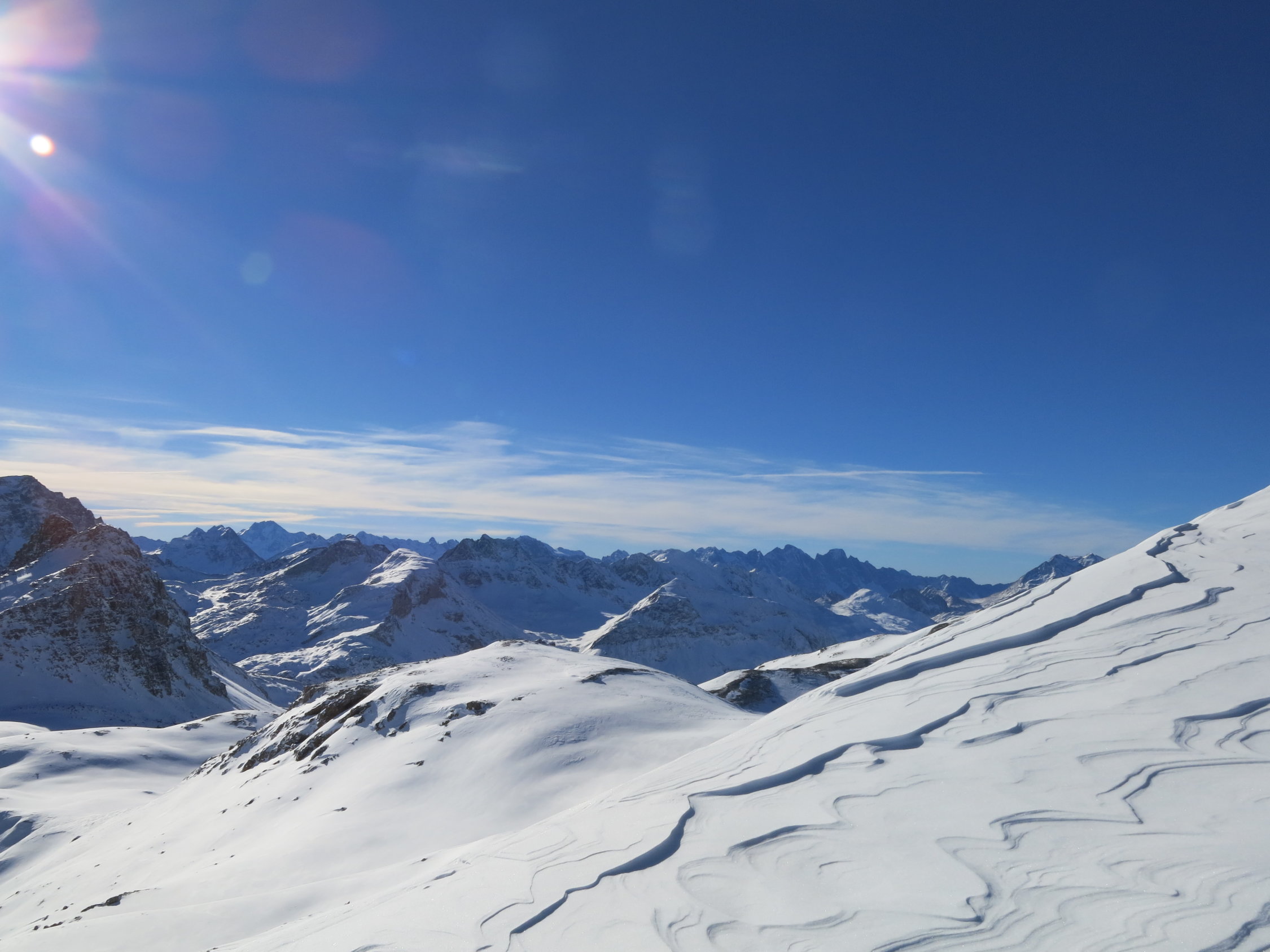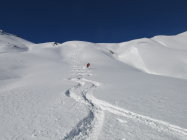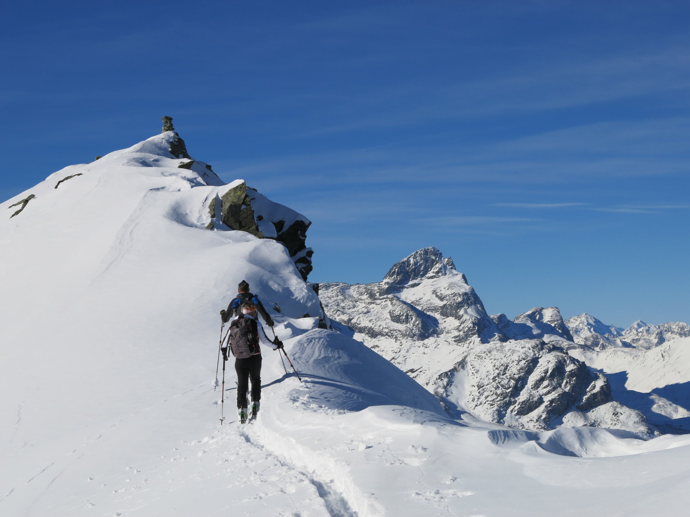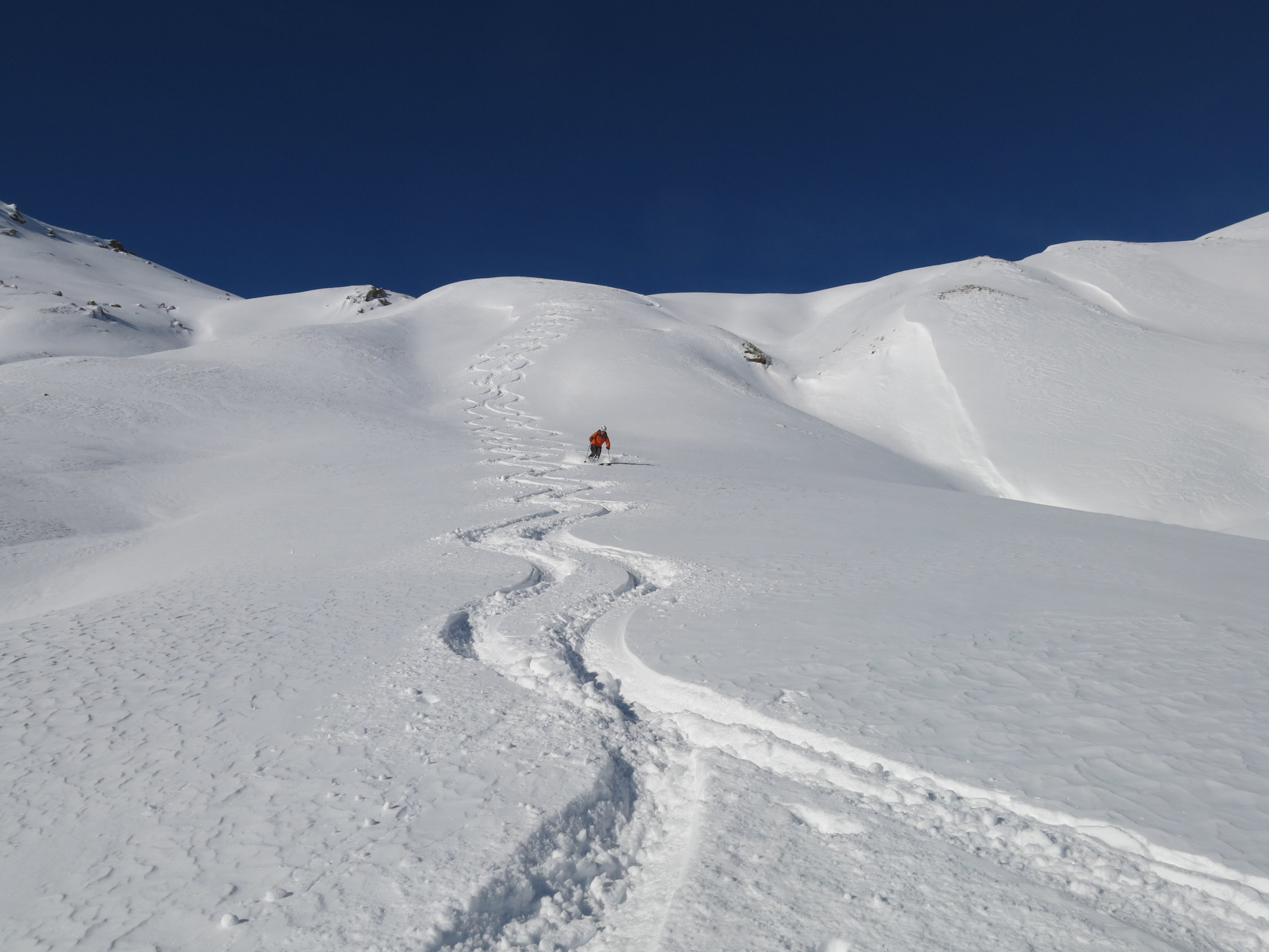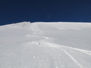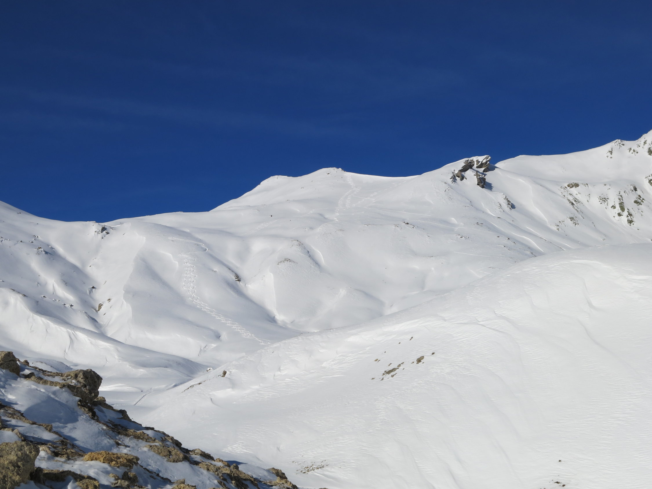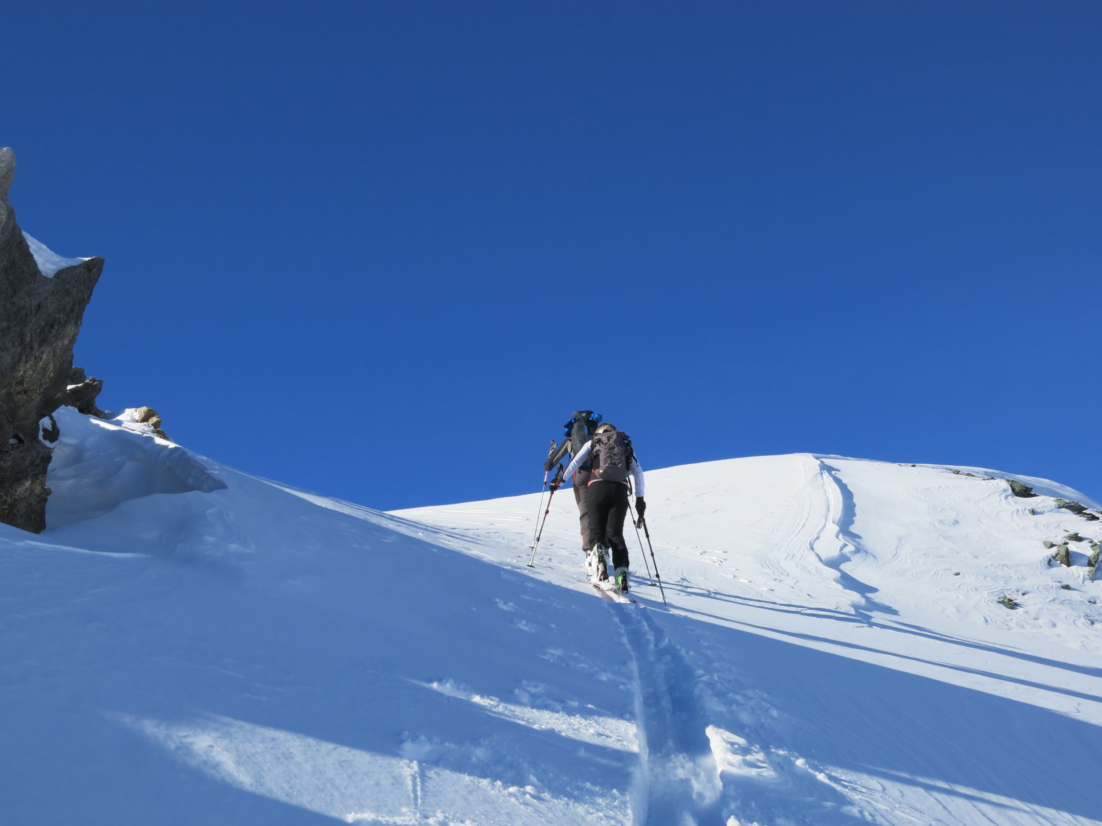 Die Verhältnisse am Gipfelhang waren ausgezeichnet. Habe den gleichen Hang schon öfters mit schlechteren Verhältnissen befahren. Im unteren Bereich braucht es noch etwas Schnee. Mit der richtigen Routenwahl ist ok. Man konnte bis zum PP fahren. Alte Ski trotzdem empfehlenswert.