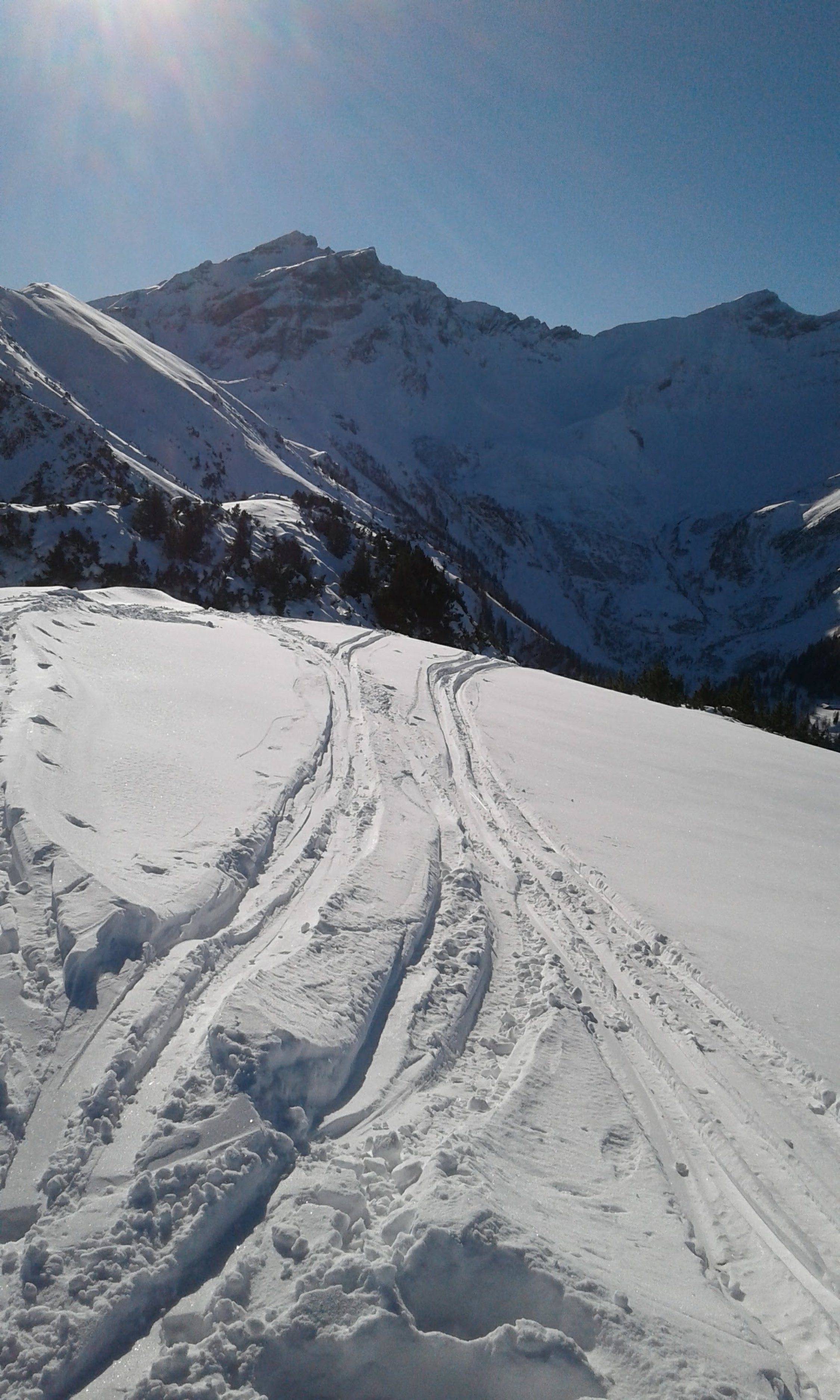 Genügend Schnee, wenn man sich im Schatten bewegt von oben bis unten Pulver. Dort wo die Sonne angreift, steht der Schnee langsam um.