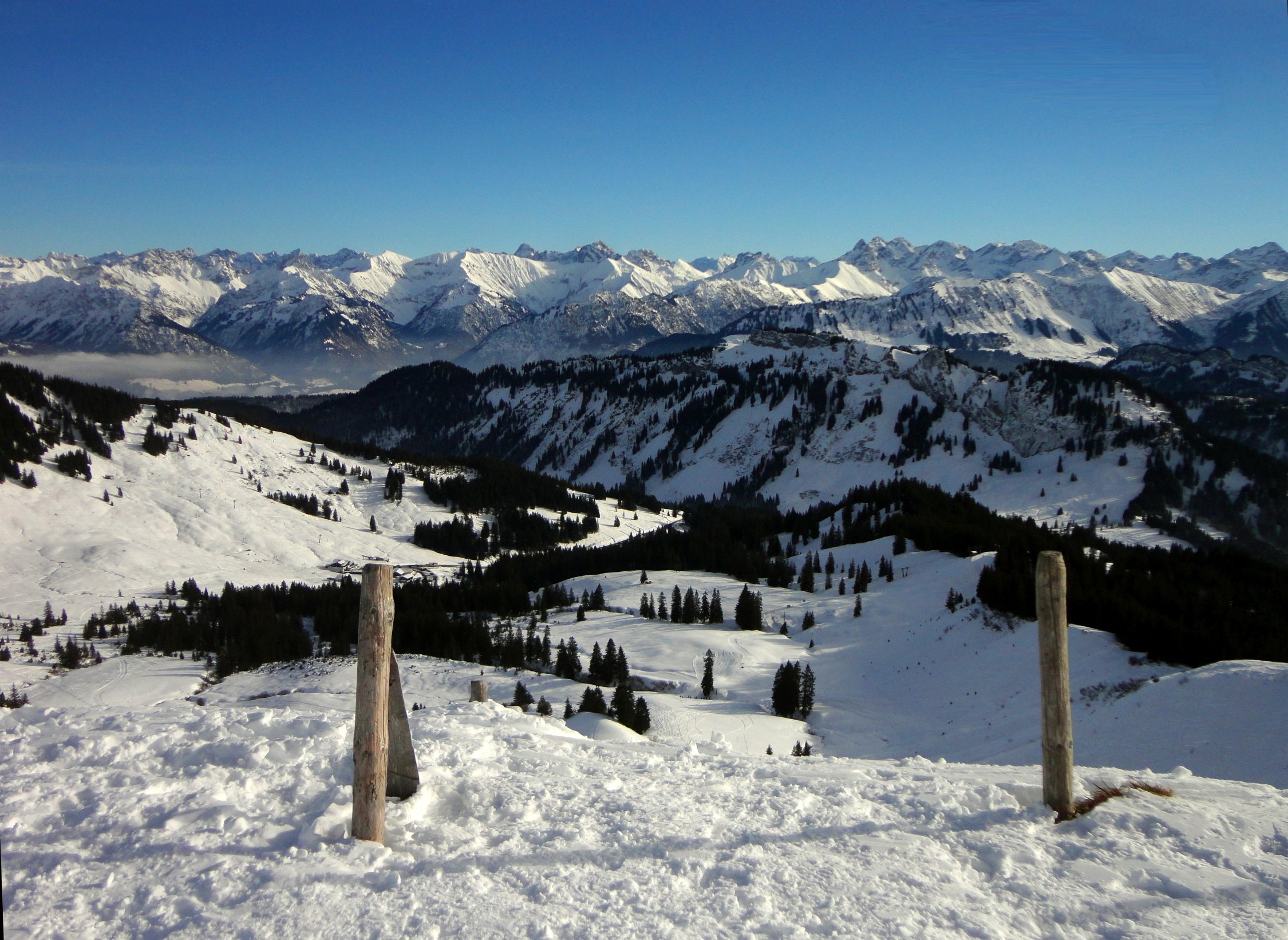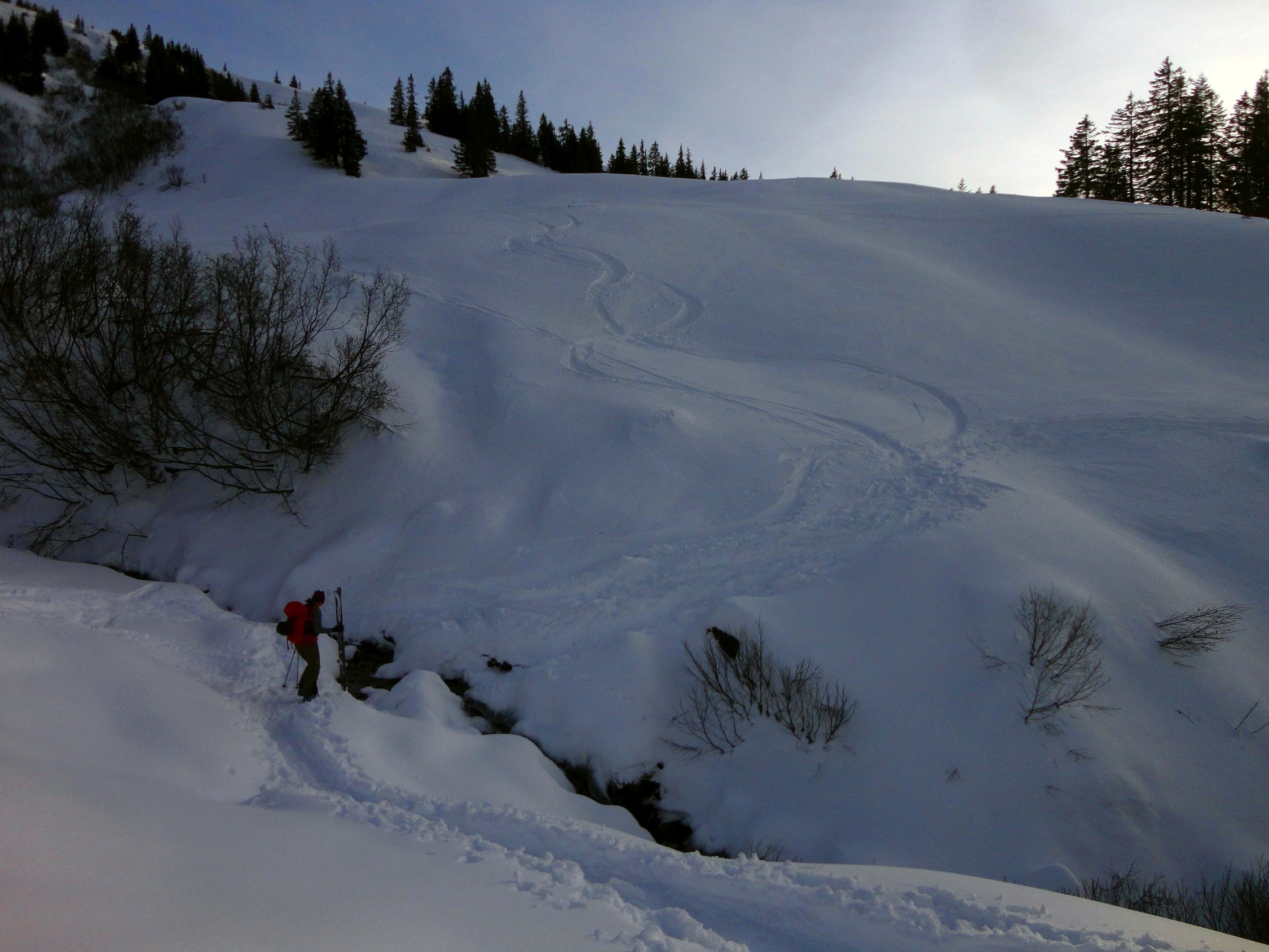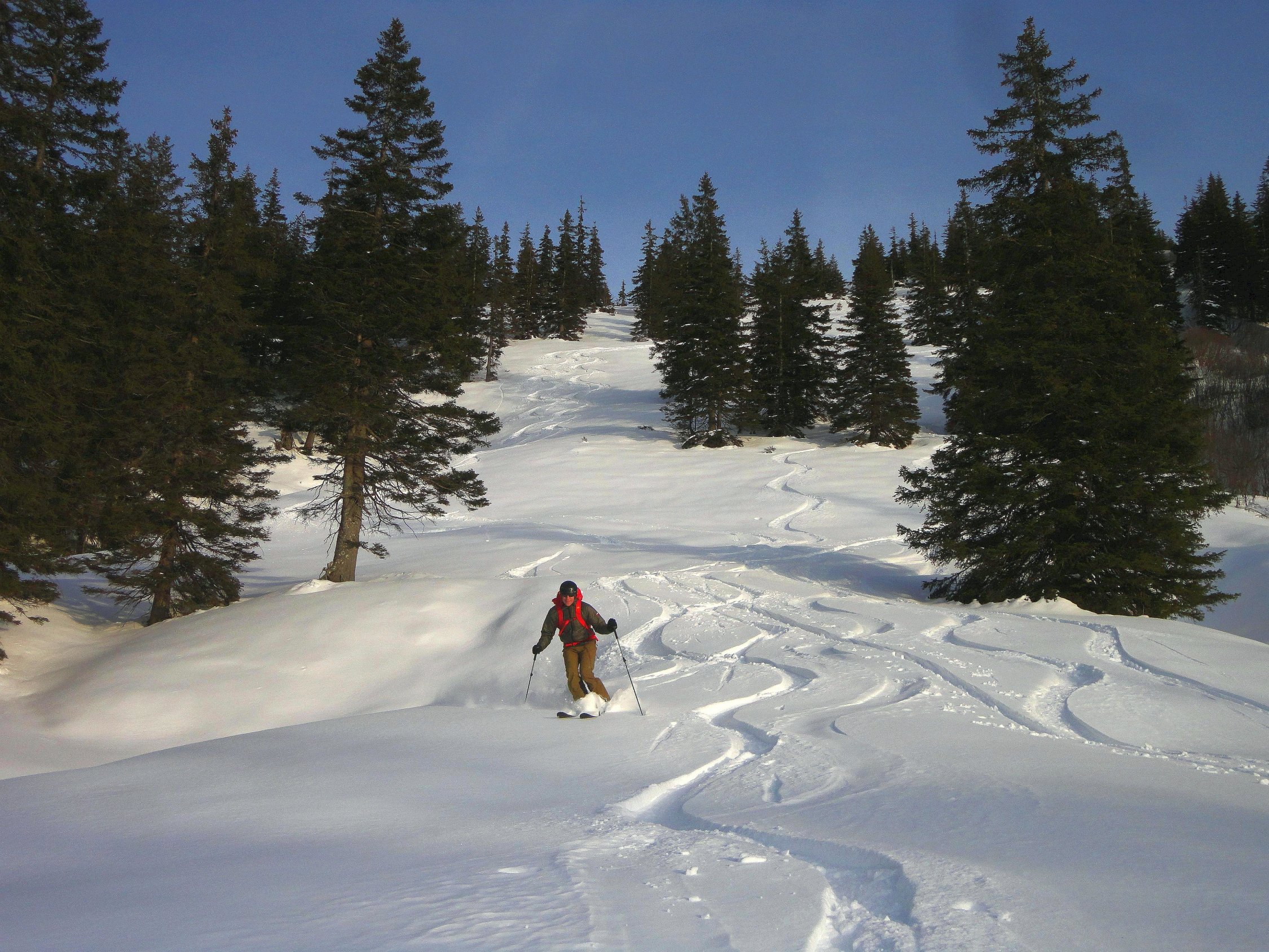 Wir sind abweichend von der Routenbeschreibung heute nicht in´s Bolgental, sondern nach Westen (Waldschneise unterhalb des nördlichen Vorgipfels mit Sendemast) abgefahren. Hier noch schöner fast unverspurter Pulver. Alles andere mittlerweile sehr zerfahren und zu späterer Stunde bereits wieder gefroren; Abfahrt nach Grasgehren in Harsch und Bruchharsch.