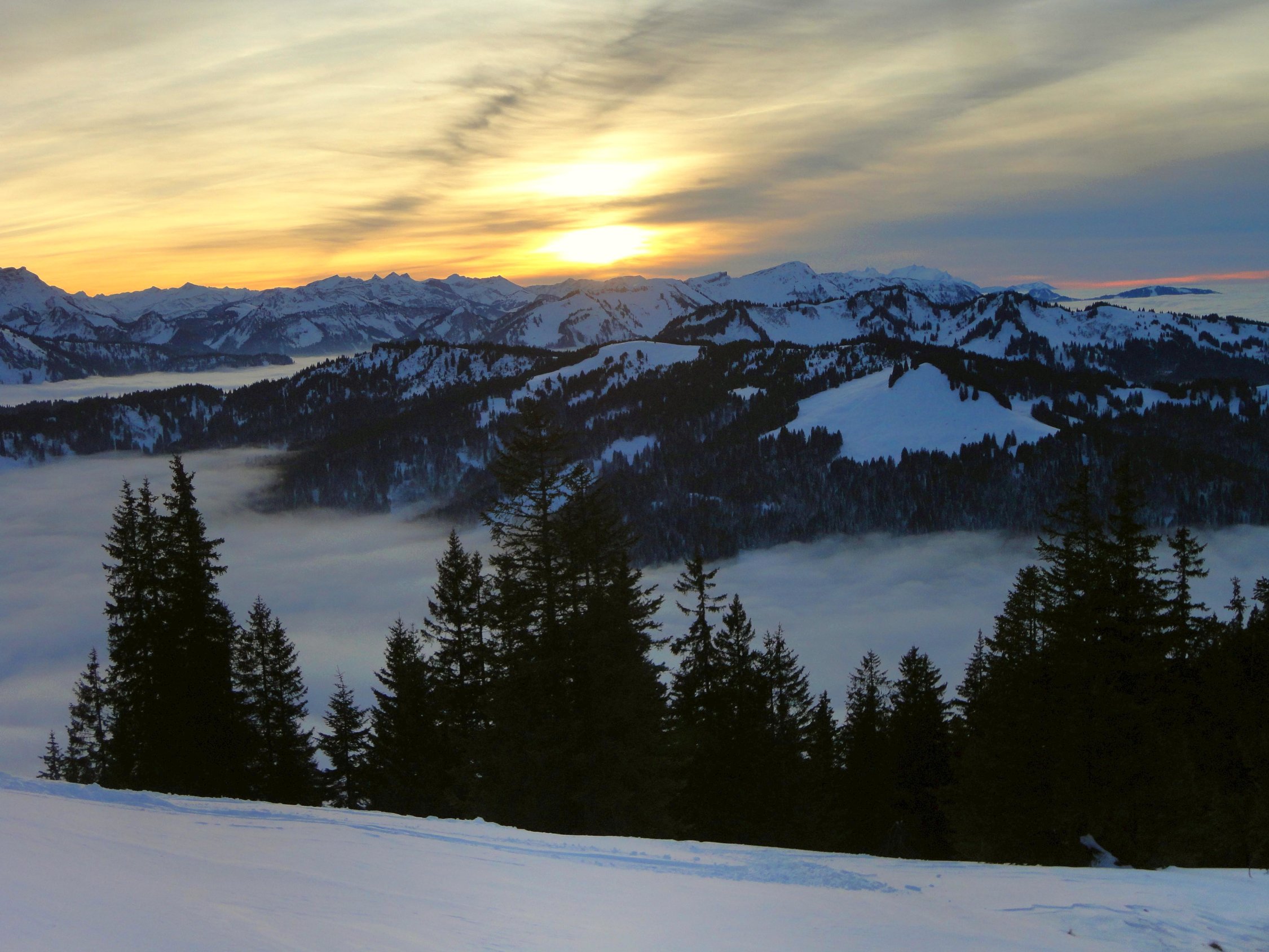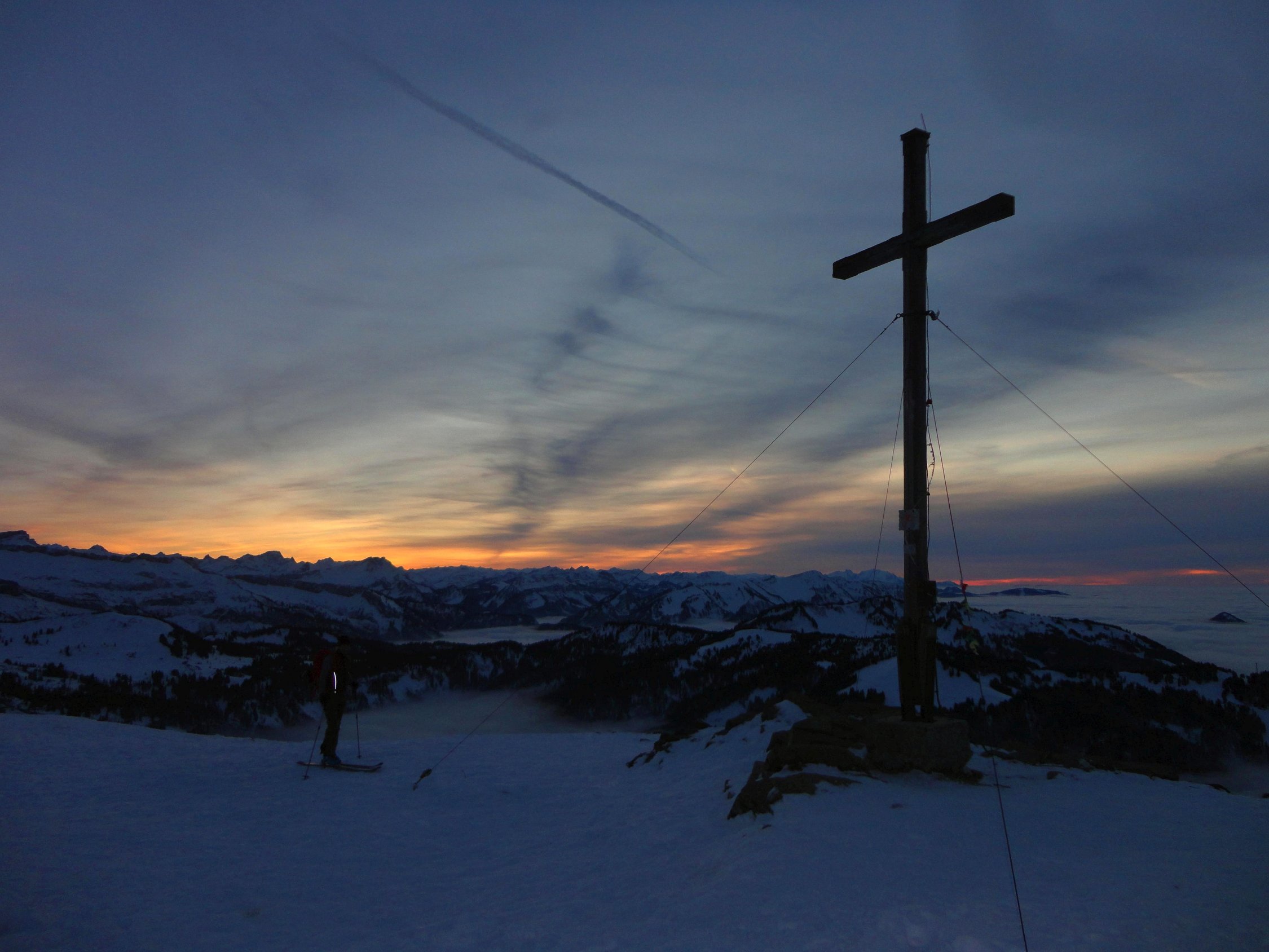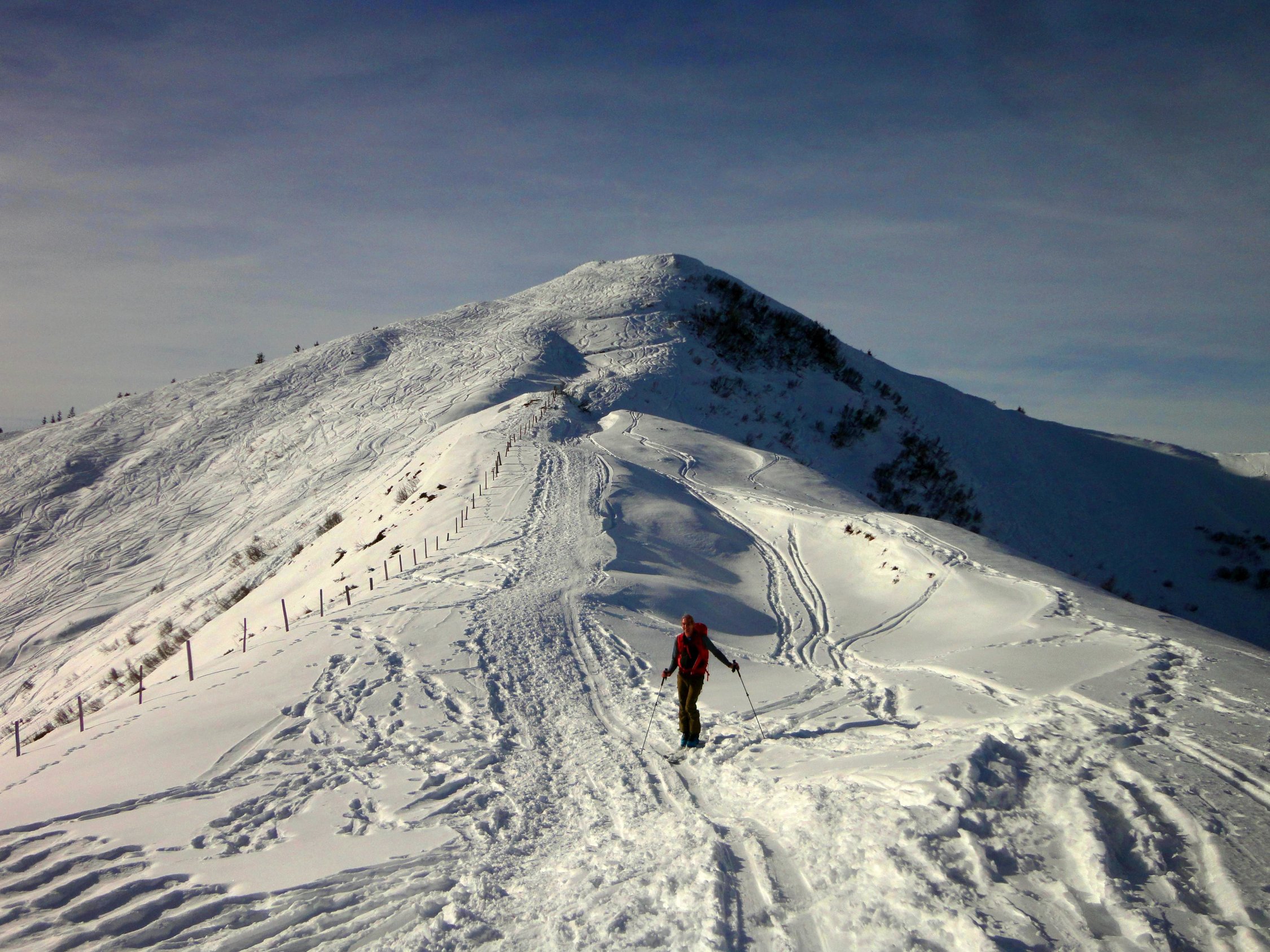 Wir sind abweichend von der Routenbeschreibung heute nicht in´s Bolgental, sondern nach Westen (Waldschneise unterhalb des nördlichen Vorgipfels mit Sendemast) abgefahren. Hier noch schöner fast unverspurter Pulver. Alles andere mittlerweile sehr zerfahren und zu späterer Stunde bereits wieder gefroren; Abfahrt nach Grasgehren in Harsch und Bruchharsch.