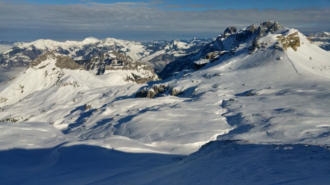 Abfahrt nicht mehr so gut wie schon beschrieben. Oben im Bruchharsch unangenehm zu Fahren, wenn auch immer wieder Pulver dazwischen ist. Ab dem Schlitten dann Pulver, aber dort wo er noch ist, bereits etwas zerfahren. Die "Engstelle" oberhalb Mittelstafel ist schon sehr umgepflügt. Ab Bergstation Lift ist dann jederzeit mit Grundkontakt zu rechnen, man konnte sich aber noch ganz gut runtermogeln.