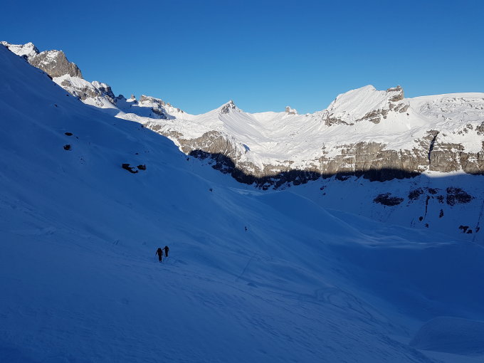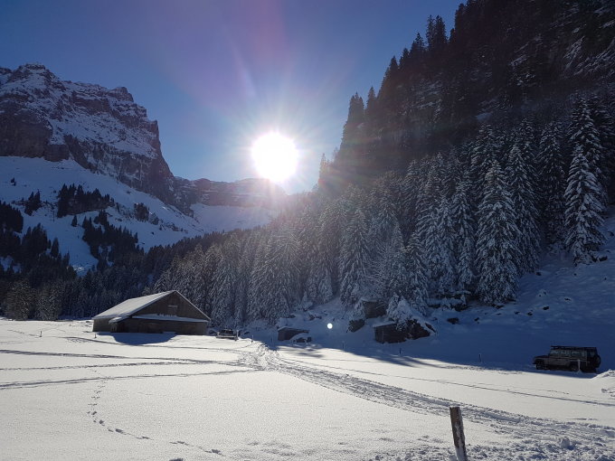 Start der Tour am 7.30 Uhr beim Sali, bei kalten -8° Grad, die Verhätnisse waren heute sehr gut, Pulverschnee auf der ganzen Route, ab 1400 m auch schon eine Unterlage von den ersten Schneefällen von Anfangs November, am Gipfelplateau etwas Verblasen, aber das ist immer so beim Glatten Anfangs Winter.