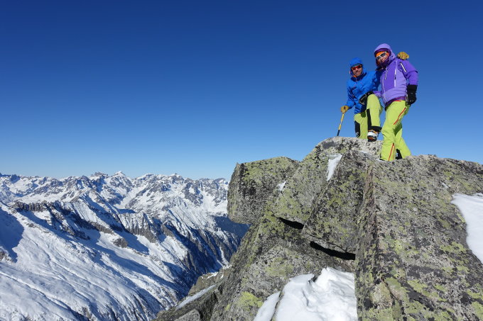 Der Fusszustieg zum Gipfel war dann eine rechte Schufterei. Schattig, kalt und vor allem loser Pulverschnee auf den teils mannshohen Felsbrocken. Wir bewegten uns fast ausschiesslich in der Westflanke und konnten dann nach einem kurzen Verhauer bzw. einer Reko den unser Meinung nach einfachsten Zustieg zum Gipfel finden. Mit den momentanen Verhältnissen bewegt sich die Kraxlerei im Berich I-II, mit der jetztigen Spur ist immerhin die Wegfindung kein Problem mehr (Zeitgewinn). Der Gipfelkopf selbst muss mit ein wenig List und Tücke gemeistert werden, ca. II-III. Herrlich dann das Panorama.