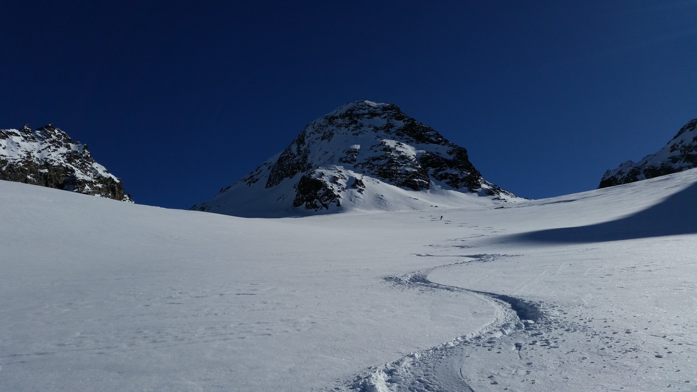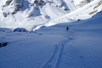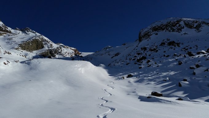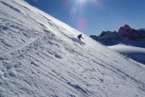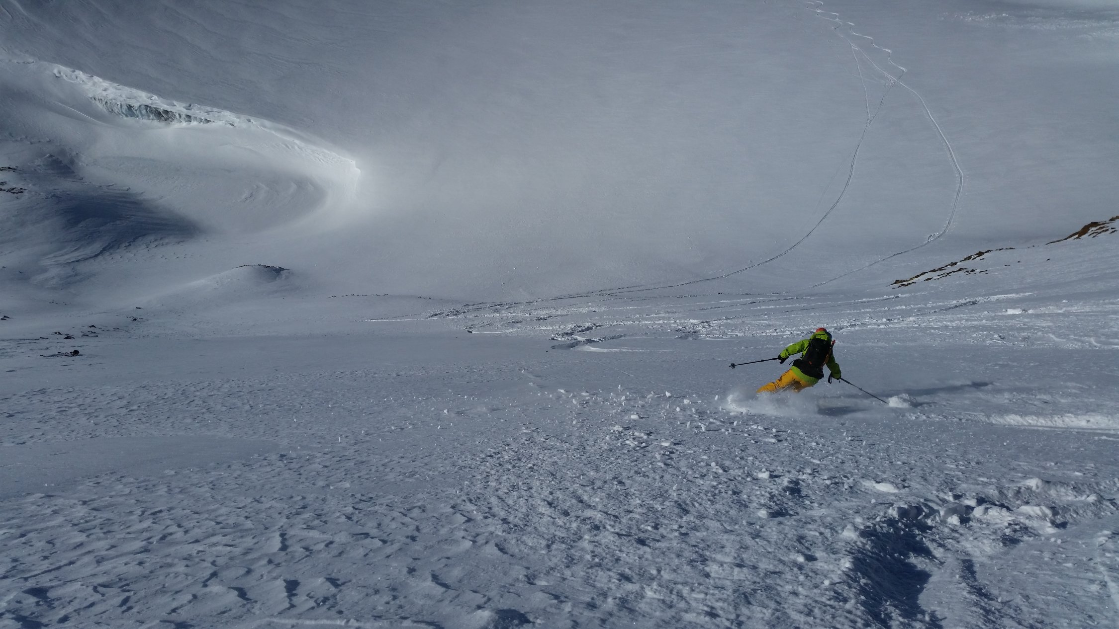 Heute eine etwas andere Abfahrtsroute gewählt. Auf einer Höhe von ca. 2900 weit nach rechts gefahren in die Hänge - bester Pulver. JUHU