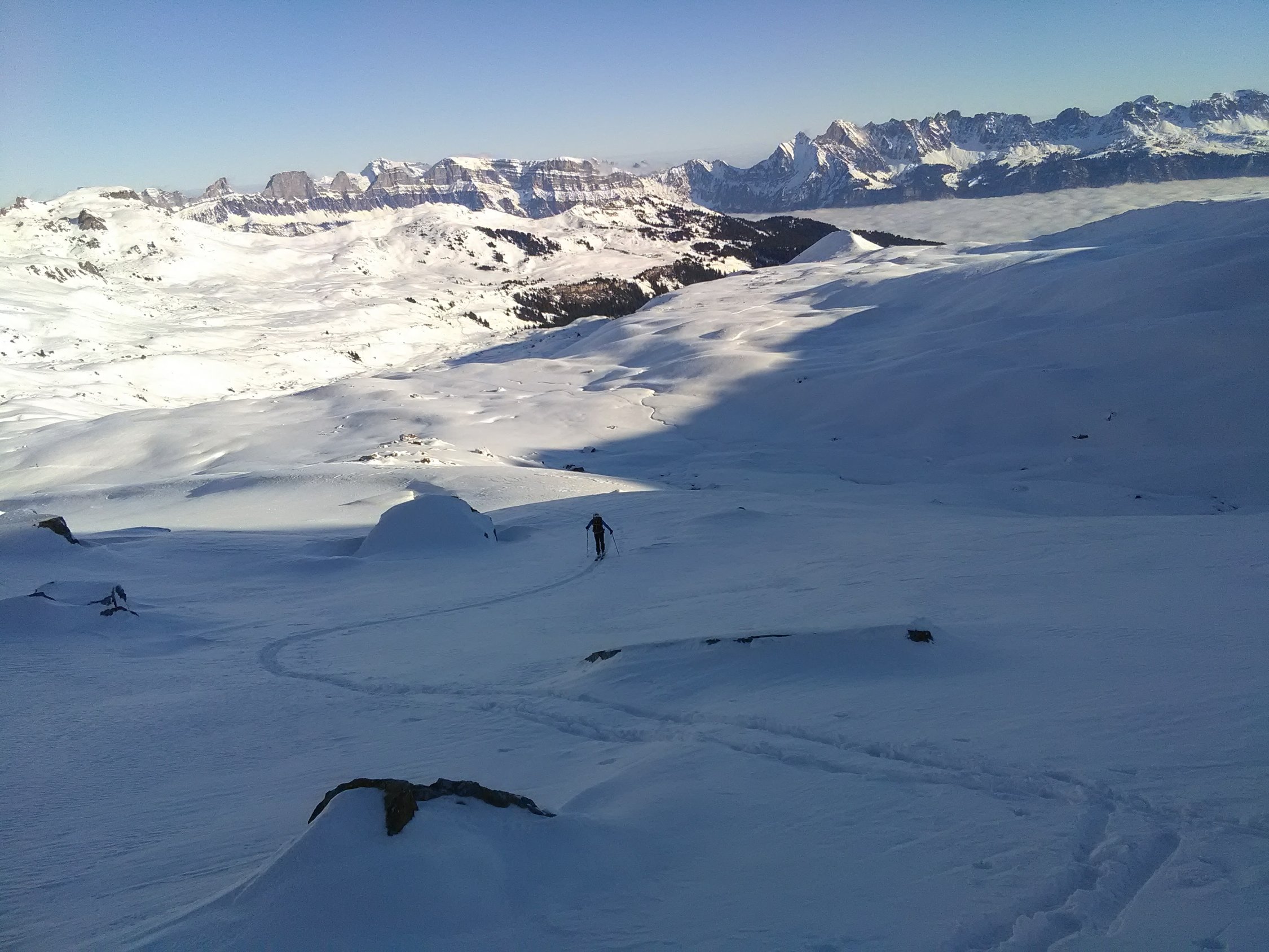 Ab Tannenbodenalp bis zum Maschgenkamm auf gut präparierter Piste. Abfahrt bis Fursch hart aber sehr gut machbar. Aufstieg zum Wissmeilen meist in guter Spur in leichtem Pulver. Abfahrt zum Madseeli guter Pulverschnee.