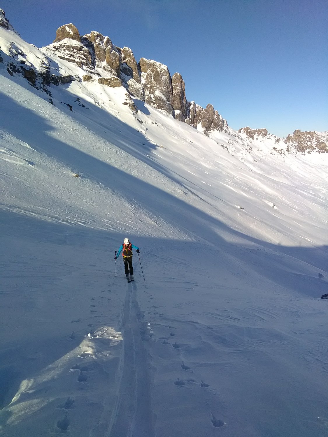 Aufstieg zum Spitzmeilen alles im Pulver, Couloir gut zu gehen. Abfahrt bis Ober Band schöner Pulverschnee.