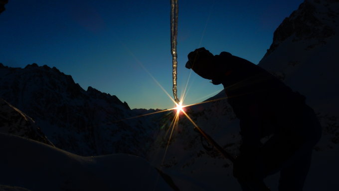 Die Zweite, vom Skidepot zum Grat ohne Ausrutscher in der schlifrigen, grifflosen und steilen Rinne um die Fixseile auszugraben.