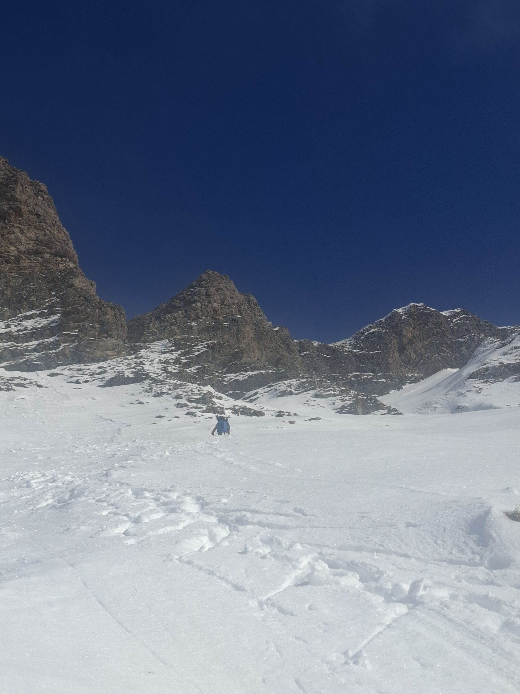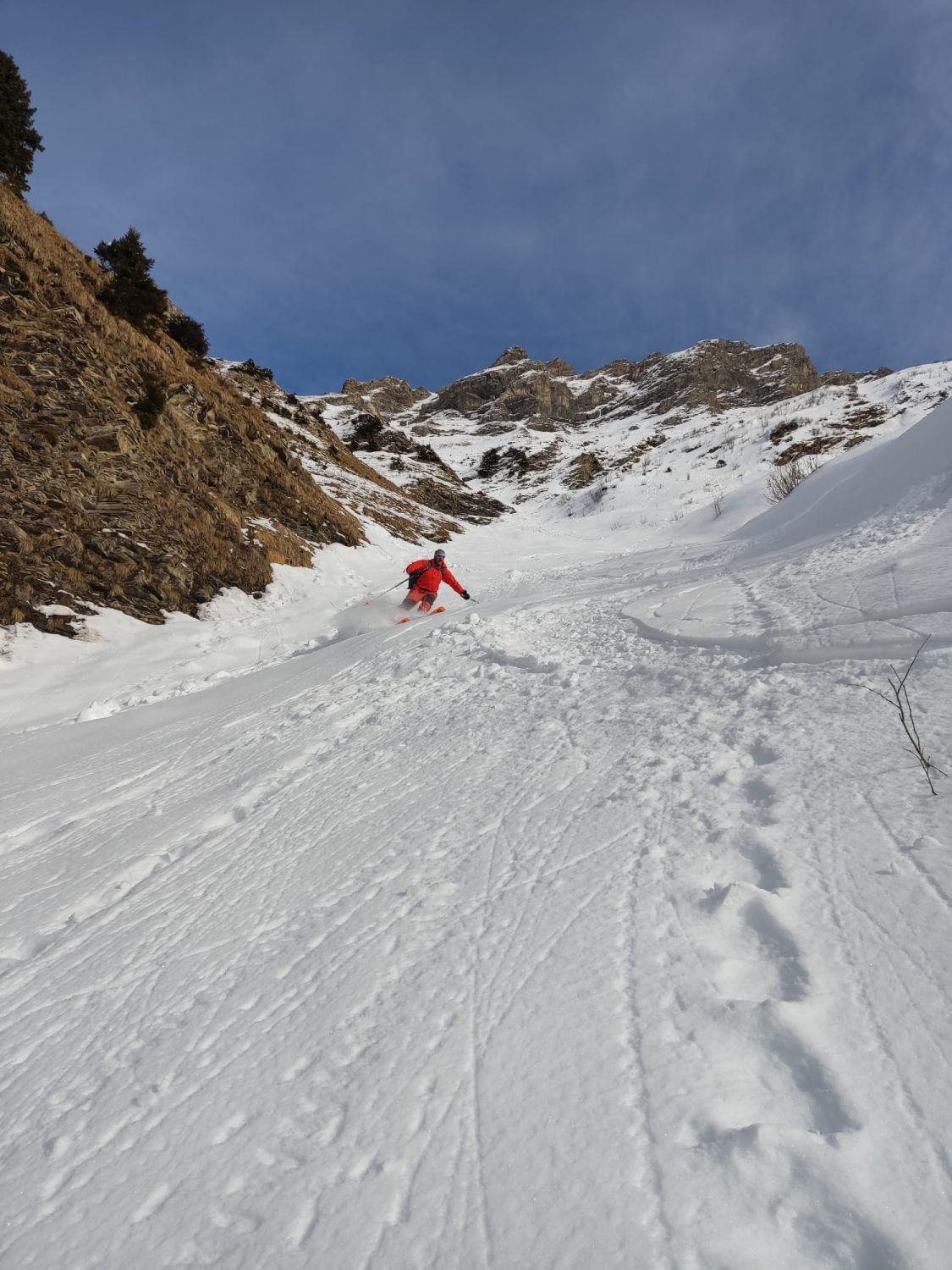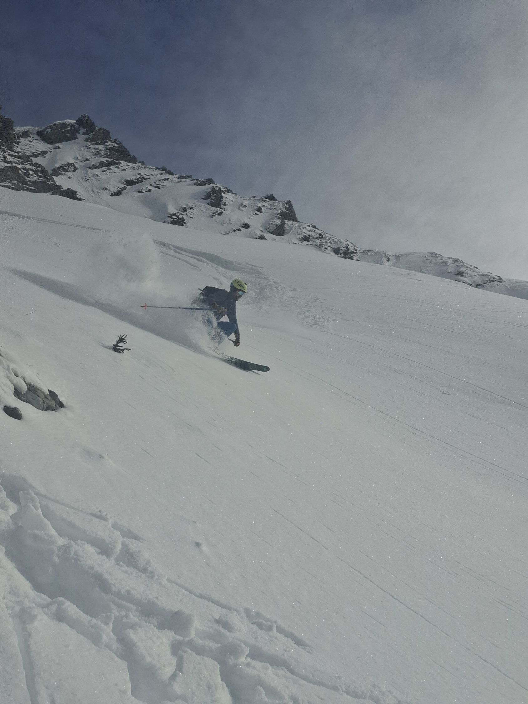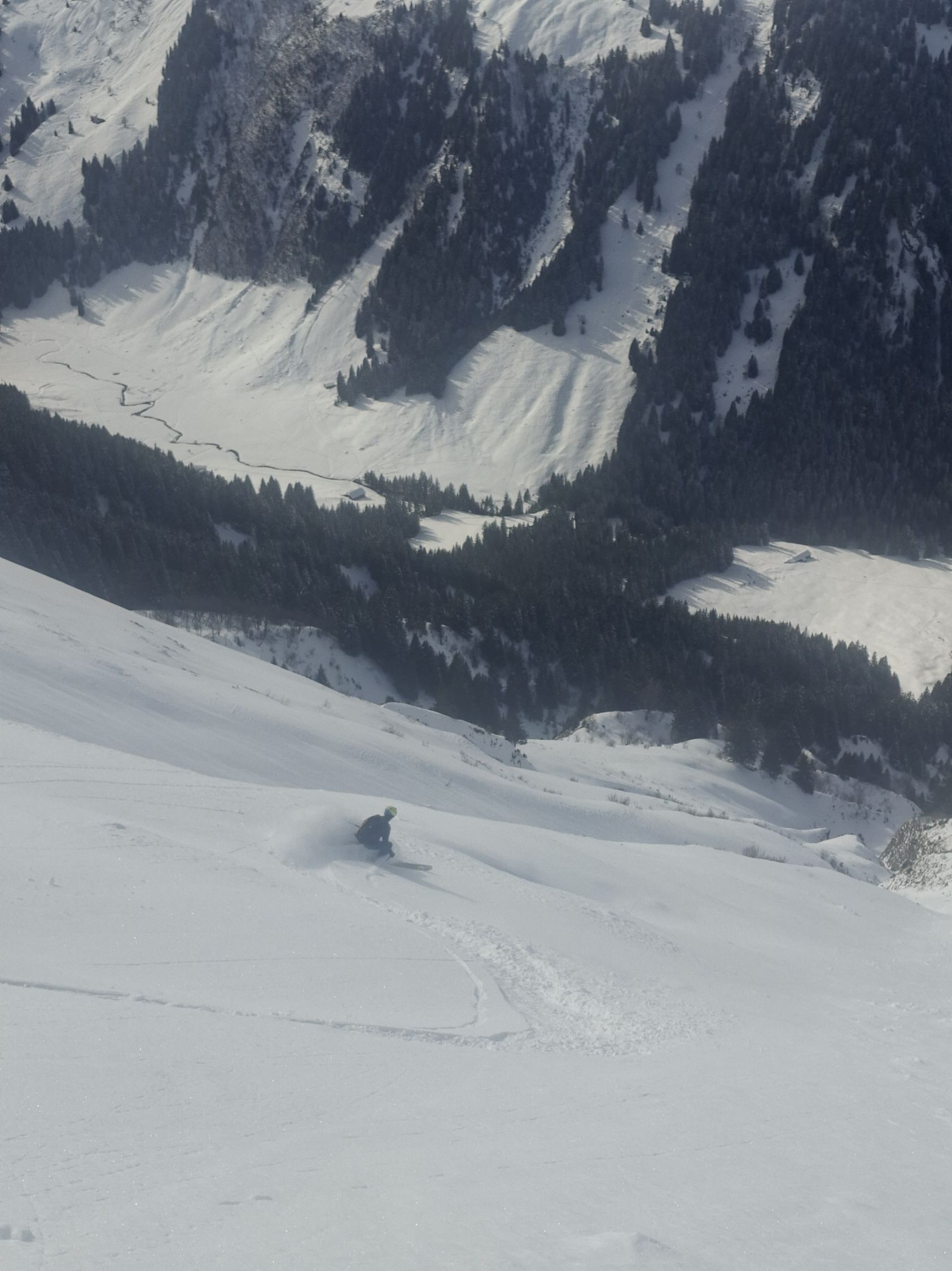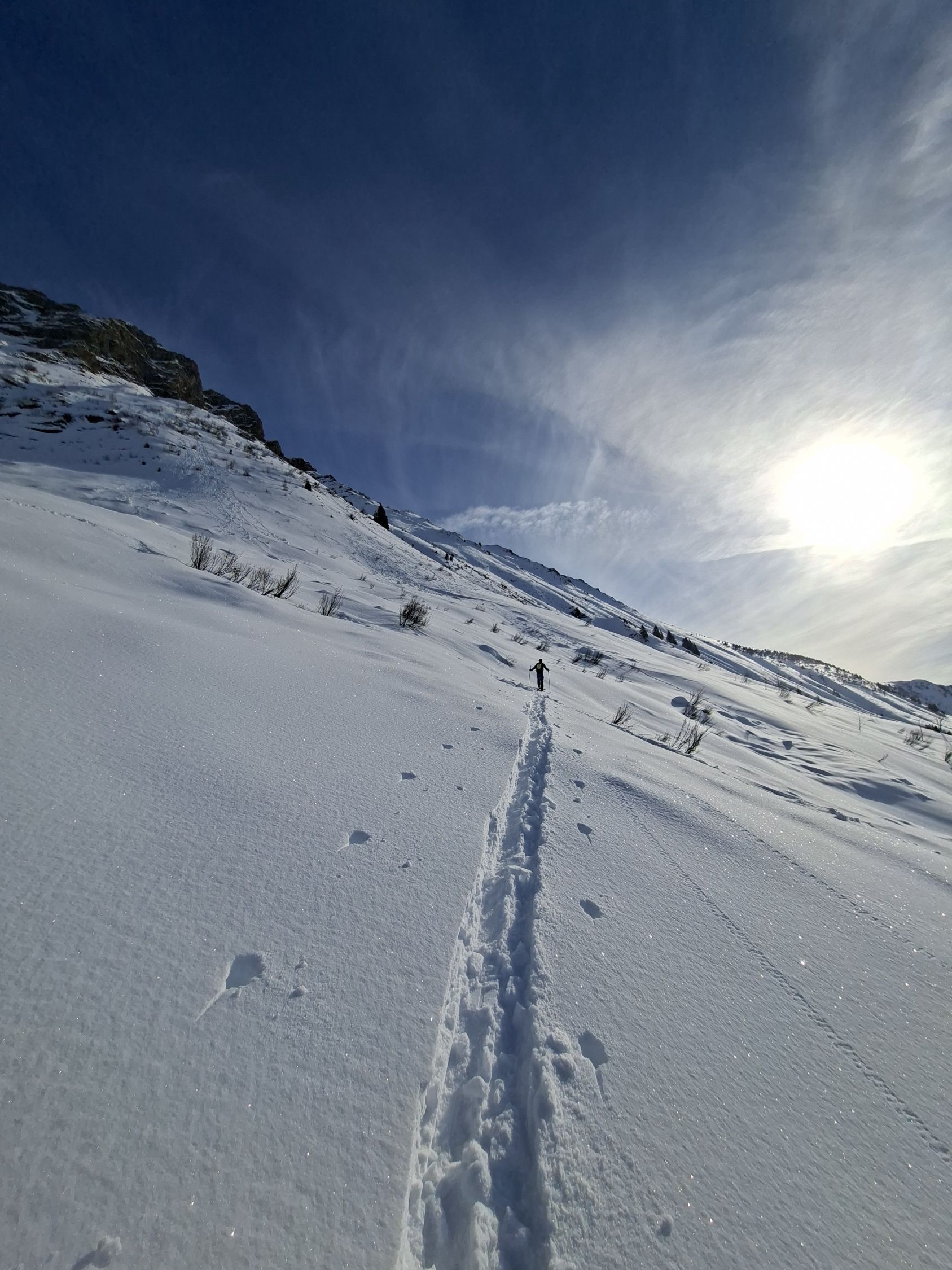 Ab Start genug und gut Schnee.Sind über Alp la Vousique ausgestiegen.Haben dann gesehen dass unser Zielculi von nahe fast Schneefrei war .Desshalb Planänderung und wieder mal Richtung W-Wand. Sind dann bis unter Felsriegel hoch (ca. 50hm unter Gratausstieg)und wegen hohenTemperatur und Zeit (14.00)den Ausstieg gelassen.Lieber Pulver und Sonne in Abfahrt....Hat auch gut gepasst.Auf Rippen noch schöner Pulver etwas gesprenkelter eisigen Unterlage unhomogen.aber nicht schlecht.Der Hammer war dann die Abfahrt durch den unteren Teil unseres geplanten Culis-300hm super feiner Pulfer 20-30 cm. ohne Wind....Dank Sonne auch die flachen Ausfahrtshänge unten raus wieder top.Wetter hat dann auch gerade zugemacht.Also tiptop