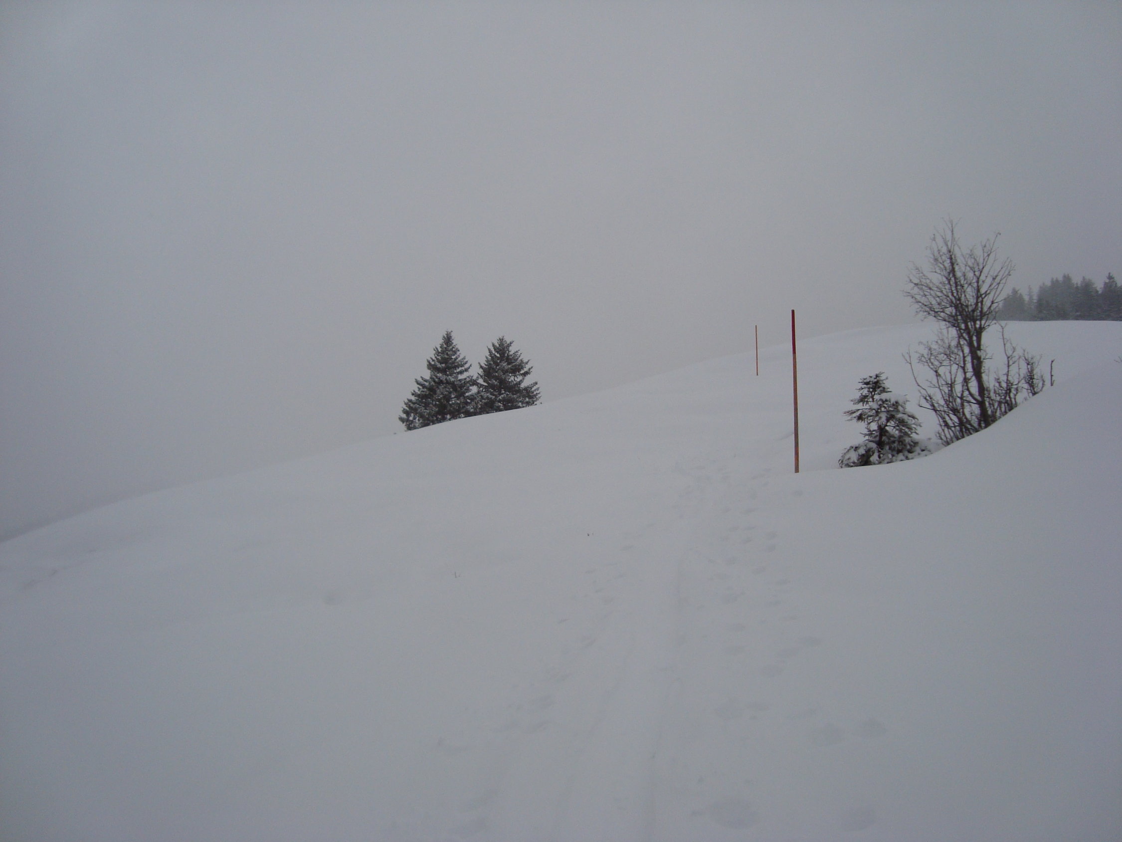 Die Sichtverhältnisse waren etwas schlechter als beim Aufstieg. Das gemässigte Gelände stellt aber selbst bei schlechter Sicht, auch dank der Stangen, niemanden vor einer unlösbaren Herrausforderung.