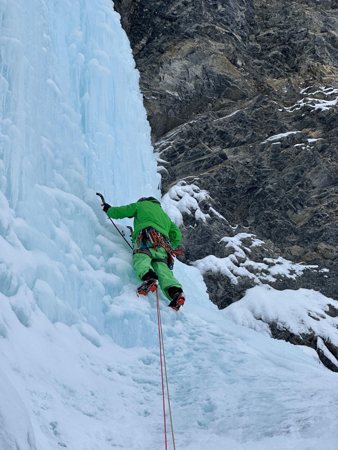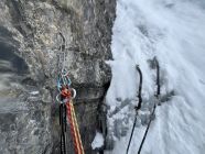 Im Zustieg 20cm Neuschnee auf harter Unterlage, Schneeschuh für Zustieg nicht nötig. Eisaufbau in allen Fällen sehr fett. Dank der warmen Temperaturen läuft das Wasser. Ausser uns nur 2 andere Seilschaften, Wochenende meiden rentiert.Stände im Fels sehr gut.