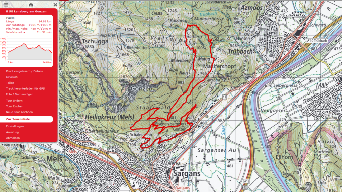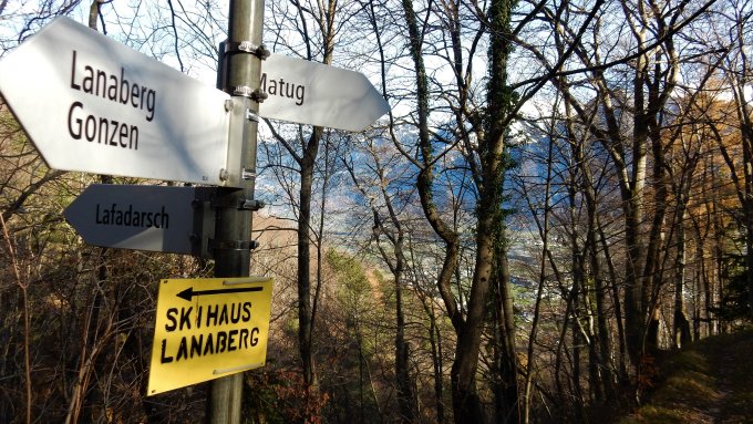 Lanaberg am Gonzen Ab Vild bei Sargans nach Oberprod, Egg, Rheintal Höhenweg zum Lanaberg. Abfahrt nach Matug, aufstieg über Egg zum Statswald P. 965 und Abfahrt über Erzbild, Lauiwald, Vilder Holz nach Vild zurück.